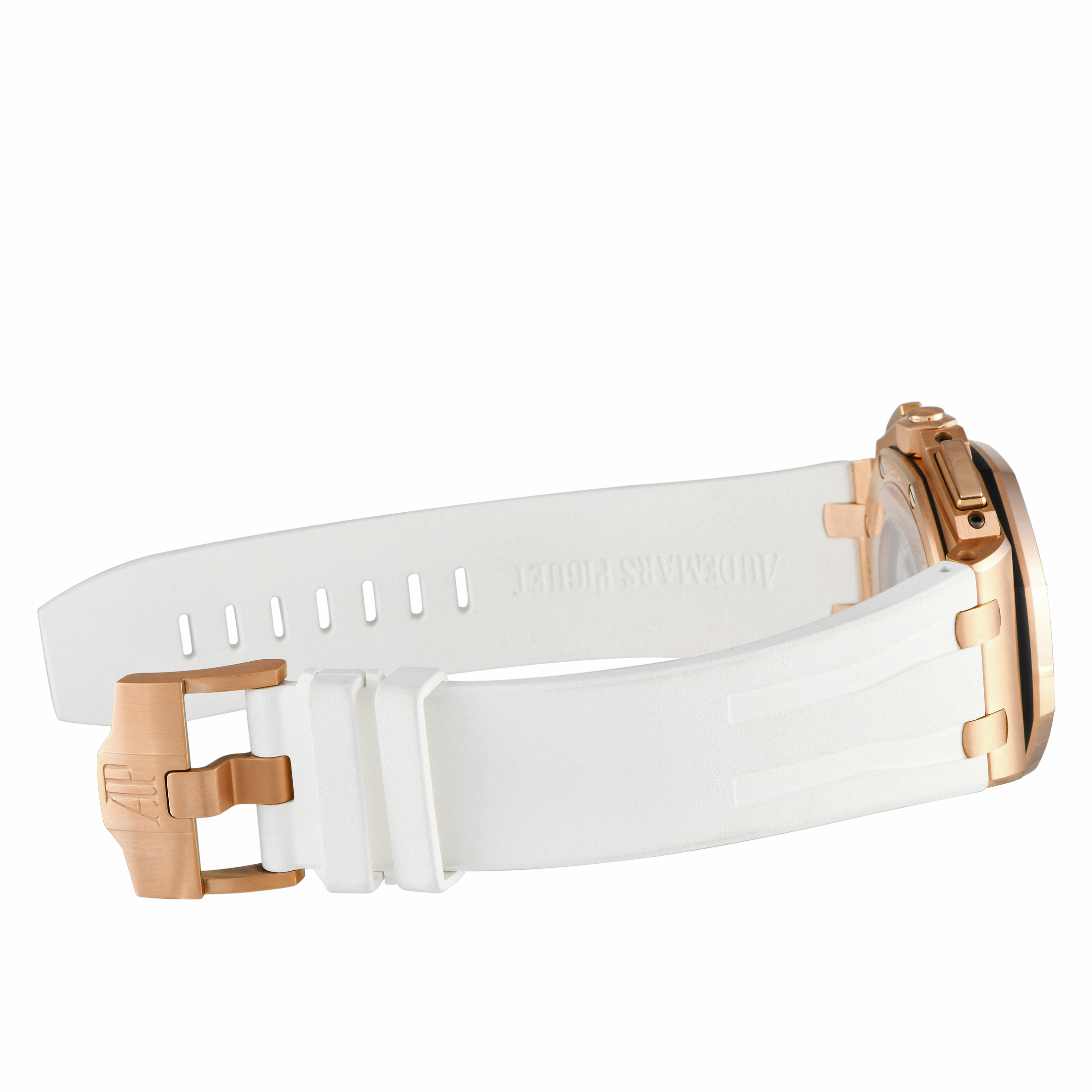 The Audemars Piguet Royal Oak Offshore Summer Byblos Edition 26408OR.OO.A010CA.01.99 is designed with a 44mm 18-carat rose gold case and bezel with rose gold pushers and screw-locked crown. In the center inlays a silvered ‘Mega Tapisserie’ dial with luminous hands and hour-markers featuring blue counters and accents, and a silver-toned inner bezel. The watch comes on a white rubber strap with 18-carat rose gold pin buckle.