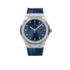 A scratch-resistant sapphire crystal protects the dial, and the transparent case back offers a glimpse into the automatic movement within. Paired with a blue alligator/crocodile leather strap and push-button folding clasp, the watch delivers comfort and refinement for both formal and everyday occasions.