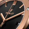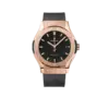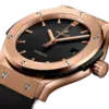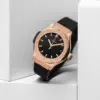 This timepiece features a 42mm gold case paired with a high quality rubber strap. It showcases a distinctive black dial and is powered by a precise automatic winding movement. The watch is designed with a water resistance of up to 50m.