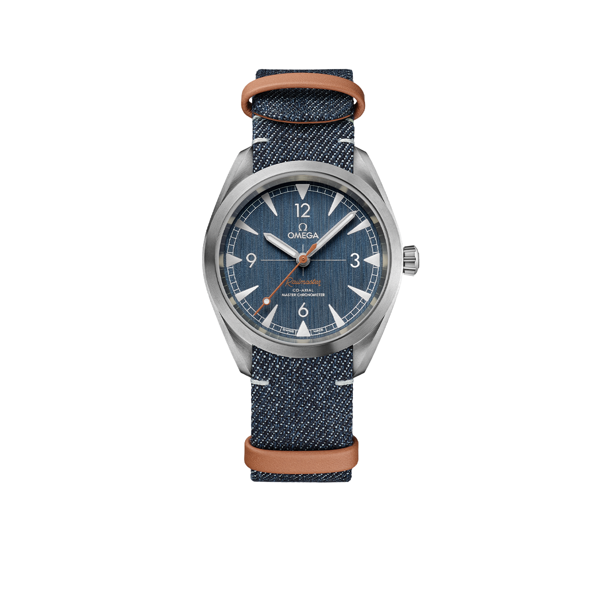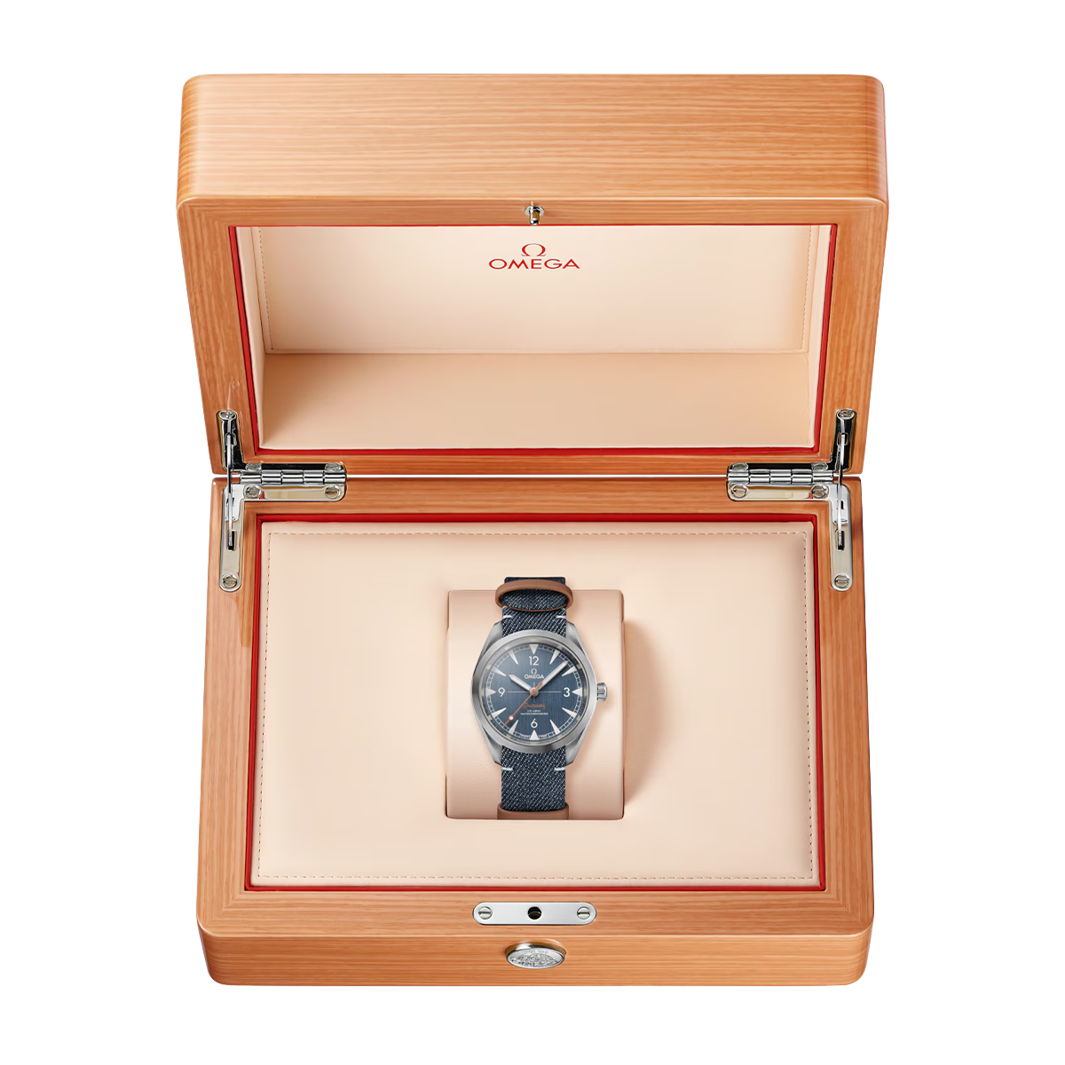 The watch has a blue denim and leather NATO strap as well as an oriented caseback featuring a NAIAD LOCK design to keep the wording in position. The watch is driven by the OMEGA Co-Axial Master Chronometer Calibre 8806, making it resistant to magnetic fields of 15,000 gauss.