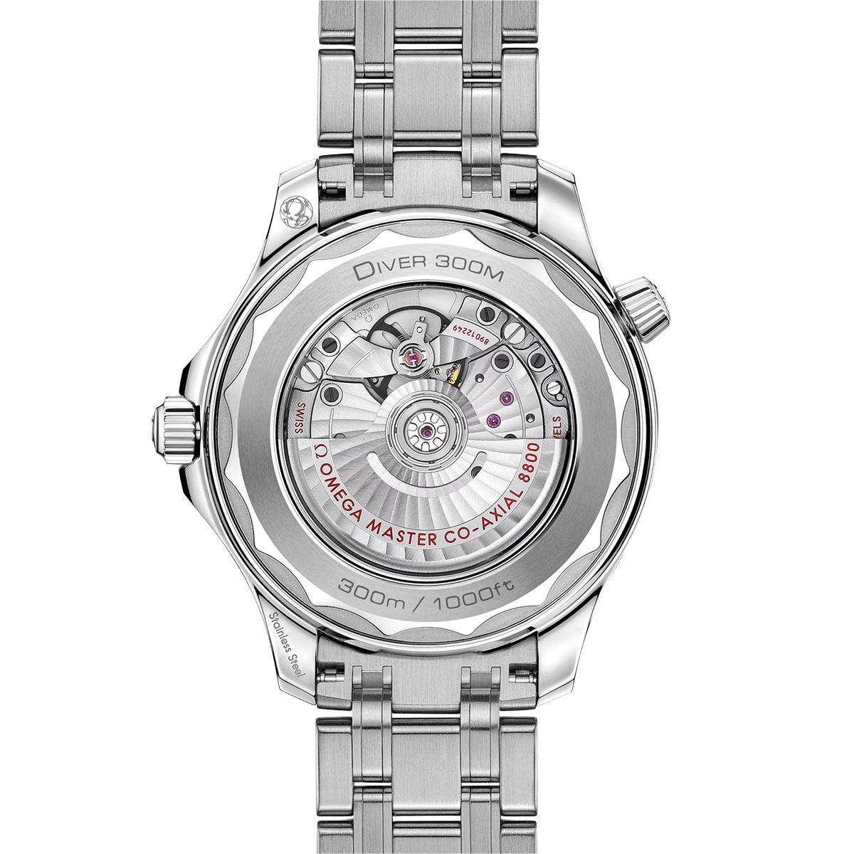 The watch is presented on a stainless steel bracelet and is driven by the OMEGA Master Chronometer Calibre 8800, which can be seen through the sapphire-crystal on the wave-edged caseback.