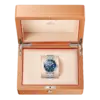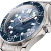 This 42 mm model is crafted from stainless steel and includes a blue ceramic bezel with a white enamel diving scale. The dial is also polished blue ceramic and features laser-engraved waves and a date window at 6 o’clock.