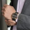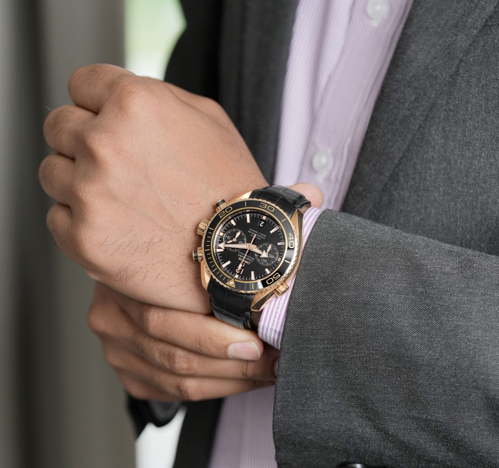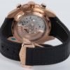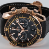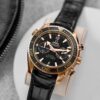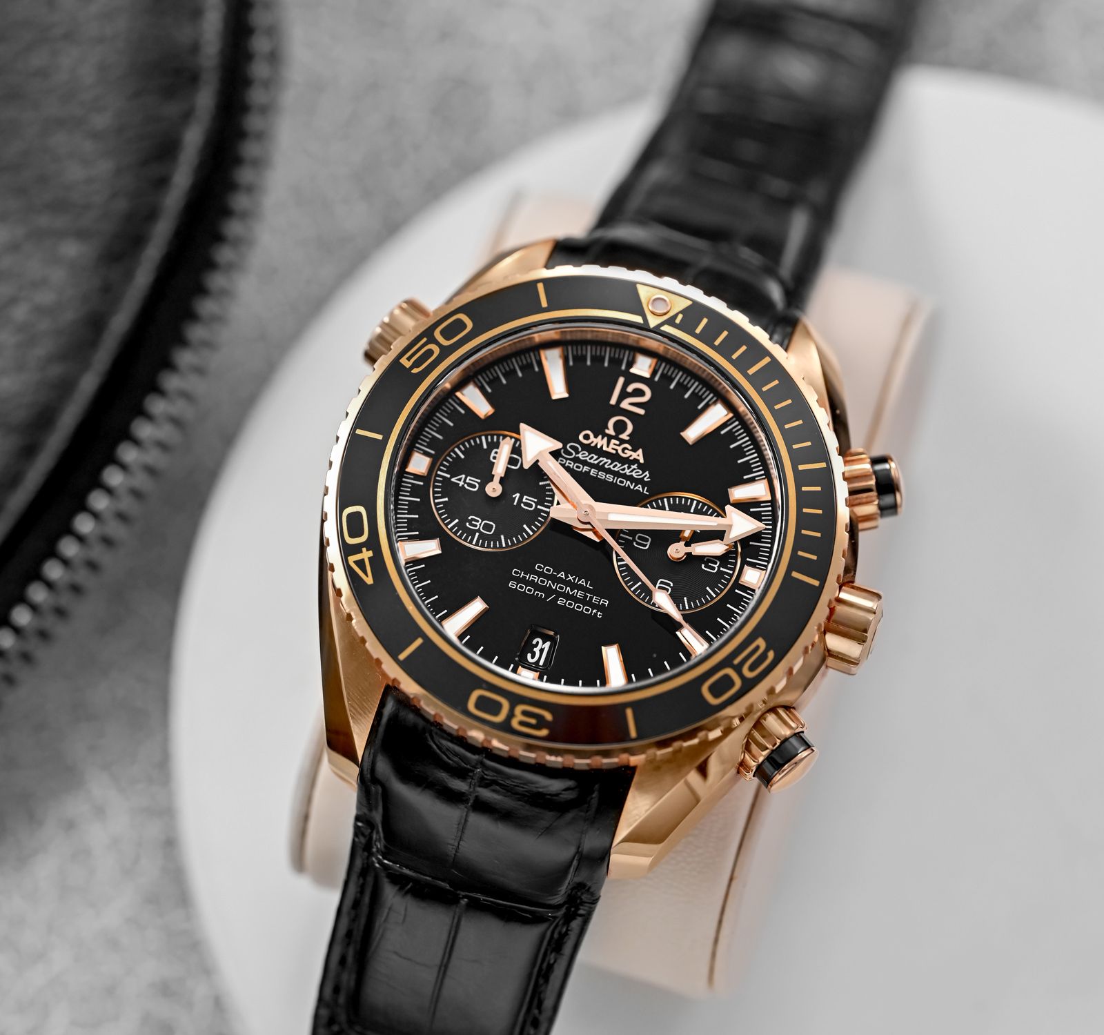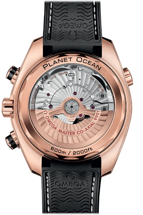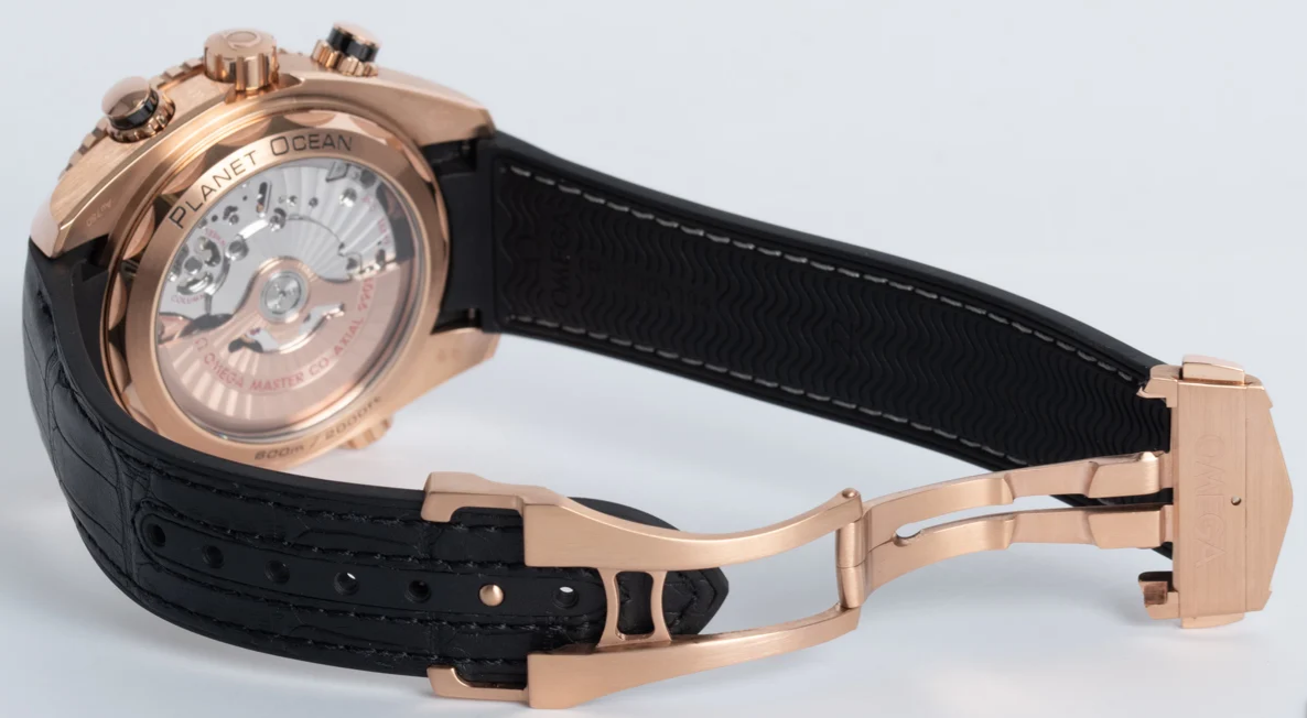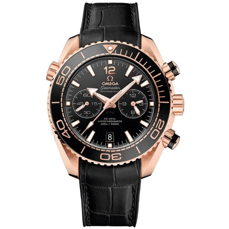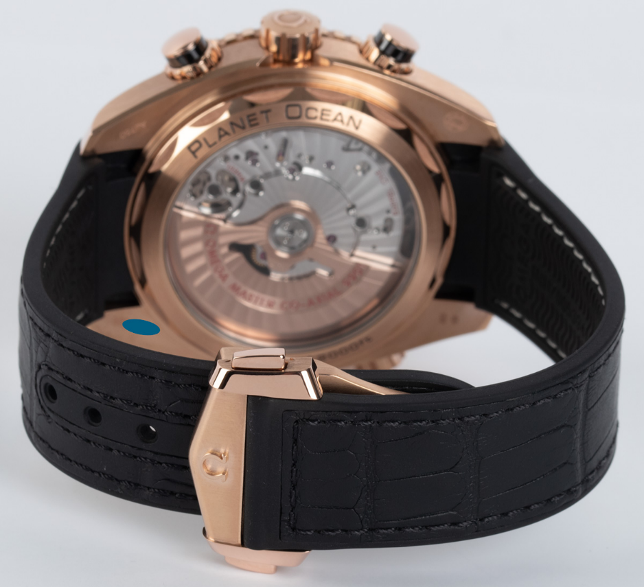 Sedna gold case with a black leather (rubber lined) strap. Uni-directional rotating sedna gold bezel with a black ceramic top ring. Black dial with luminous rose gold-tone hands and index hour markers. Minute markers around the outer rim. Dial Type: Analog. Luminescent hands and markers. Date display at the 6 o’clock position. Two sub-dials displaying: 60 seconds, and 12 hours. Omega calibre 9901 automatic movement with a 60-hour power reserve. Scratch resistant sapphire crystal. Screw down crown. Transparent case back. Case size: 45.5 mm. Case thickness: 18.87 mm. Round case shape. Band width: 22 mm. Deployment clasp with a push button release. Water resistant at 600 meters / 2000 feet. Functions: chronograph, date, hour, minute, second. Luxury watch style. Watch label: Swiss Made. Omega Seamaster Planet Ocean Chronograph Automatic 18kt Sedna Gold Men’s Watch 215.63.46.51.01.001.