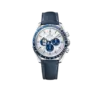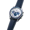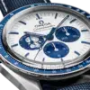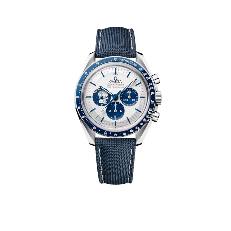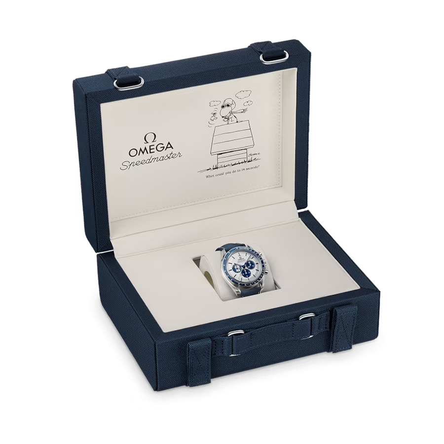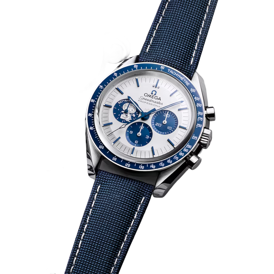 The 42 mm case in stainless steel is presented on a blue nylon fabric strap, which features the trajectory of the Apollo 13 mission on the embossed lining. The silver dial has blue PVD angle-shaped hour markers and hands, as well as an embossed silver Snoopy medallion on the blue subdial at 9 o’clock.