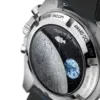 On the NAIAD LOCK caseback, a vision of the far side of the moon has been decorated on the sapphire crystal using micro-structured metallisation. An animated Snoopy in his Command and Service Module (CSM) is shown on a magical hand, which rotates when the chronograph function is used. Behind, an Earth disc rotates once per minute in sync with the watch’s small seconds hand.