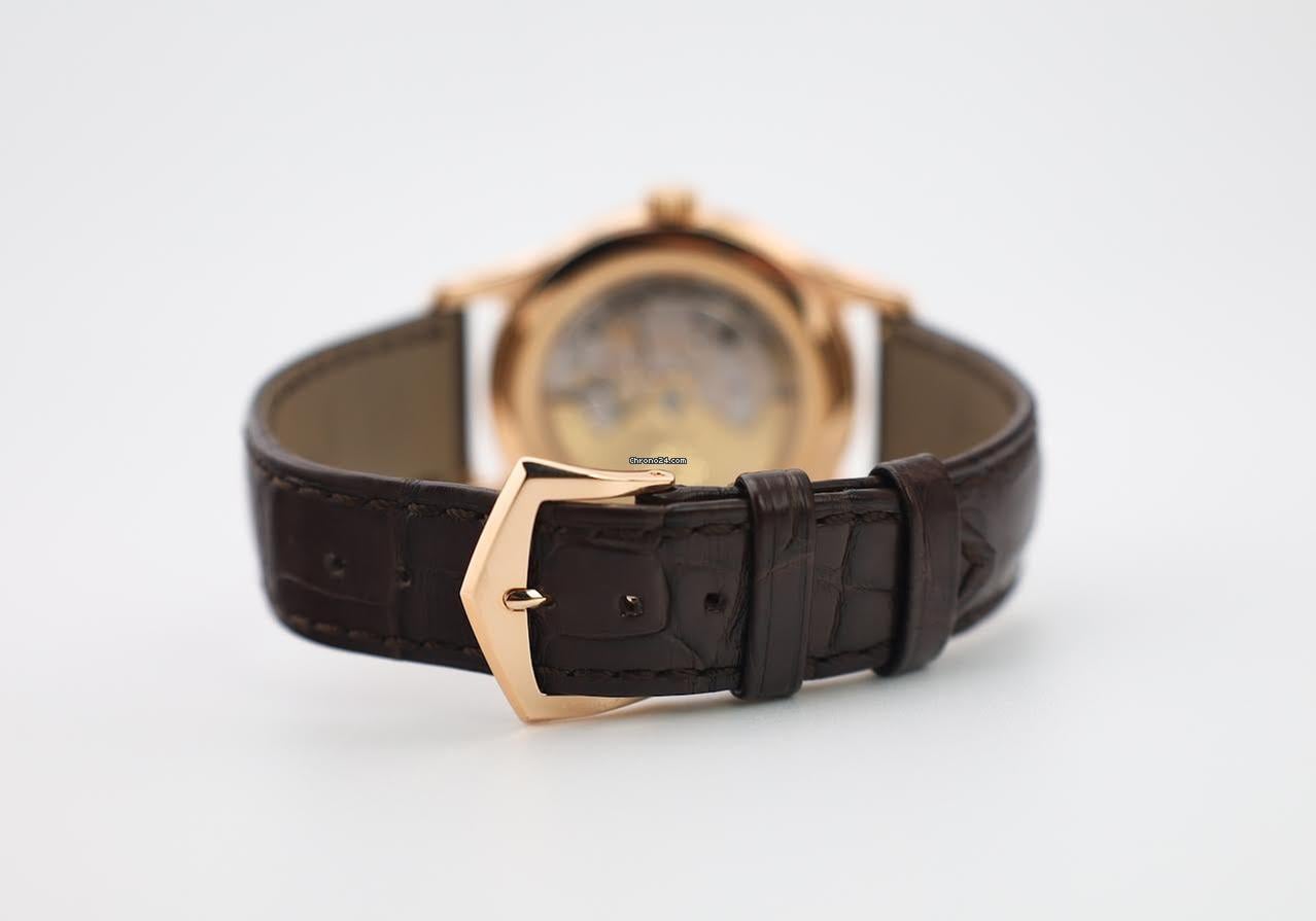 Brand New Authentic Patek Philippe Annual Calendar Moonphase Rose Gold Brown Leather Men’s Luxury Watch Model 5205R-001. Rose Gold case with Brown Leather Alligator strap. Tang clasp. Fixed bezel. Dial description: Rose Gold hands and Index hour markers with minute markers around the outer rim and a Moonphase Sub-dial on a Opaline White dial. Automatic movement. Calendar: Date at 12 o’clock. Chronograph sub-dials display: Moonphase. Powered by Patek Philippe Calibre 324 S QA LU 24H engine with 45 hours power reserve. Watch functions: Date, Hour, Minute, Second, Calendar. Scratch Resistant Sapphire crystal. Round case shape. Case size: 40mm. Case thickness: 11.36mm. Transparent case back. 30 Meters – 100 Feet water resistant. 2 year WatchMaxx warranty.