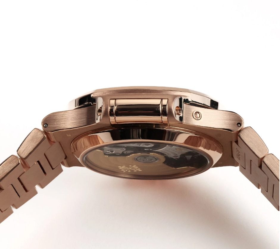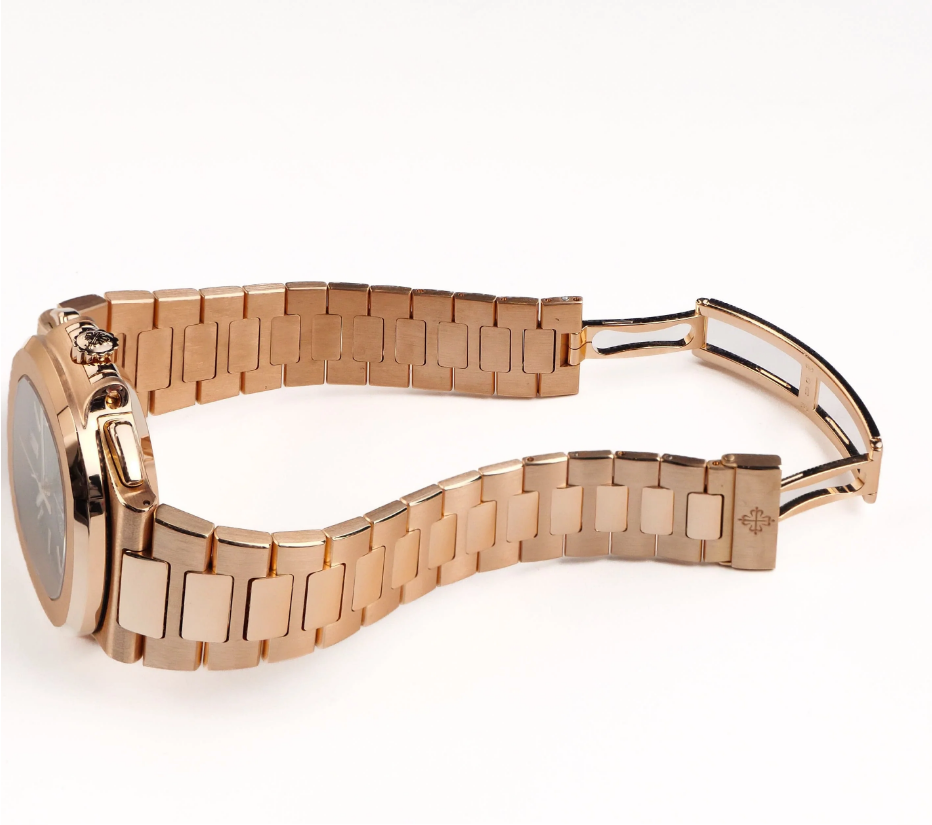 Brand New Authentic Patek Philippe Nautilus Chronograph Date Rose Gold Men’s Luxury Watch Model 5980/1R-001. 18k Rose Gold case with 18k Rose Gold watch band. Deployment with Foldover clasp. Dial description: Black Gradient dial. Black dial. Automatic Self Winding movement. Powered by Caliber CH 28?520 engine. Screw Down crown. Case size: 40.5mm. Case thickness: 12.2mm. Transparent case back. 120 Meters – 400 Feet water resistant. 2 year WatchMaxx warranty. Also known as model: 5980-1R-001.