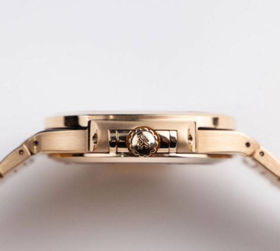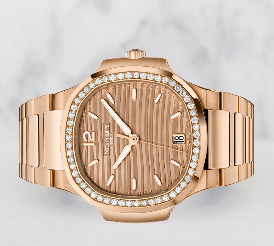 Brand New Authentic Patek Philippe Nautilus Golden Dial 18kt Rose Gold Diamond Women’s Watch Model 7118/1200R-010. 18K Rose Gold case with 18K Rose Gold watch band. Folding clasp. Fixed Diamond Set bezel. Dial description: Rose gold luminous hands and Index hour markers on a Golden Brown Opaline dial. Automatic movement. Powered by Patek Philippe Calibre 324 S C engine with 45 hours power reserve. Watch functions: Date, Power Reserve, Hour, Minute, Second. Scratch Resistant Sapphire crystal. Case size: 35.2mm. Case thickness: 8.62mm. Transparent case back. 60 Meters – 200 Feet water resistant. 2 year WatchMaxx warranty.