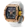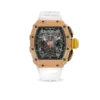 Experience the pinnacle of performance with the Richard Mille RM 11-03 chronograph, an exceptional annual calendar flyback chronograph. Encased in a luxurious rose gold case and styled with a sleek white rubber bracelet with a double deployant clasp, this watch embodies the brand’s signature racing aesthetic with refined sophistication.