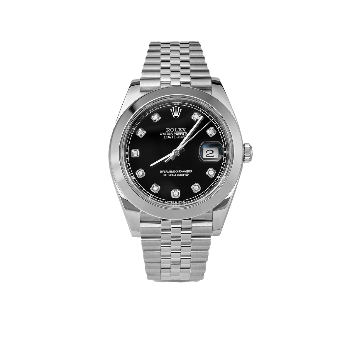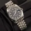 Here’s a Datejust Rolex Watch. From our Watches Collection, this Original 41mm Black Diamond Dial Smooth Bezel Datejust Rolex features Stainless Steel Case and Jubilee bracelet.