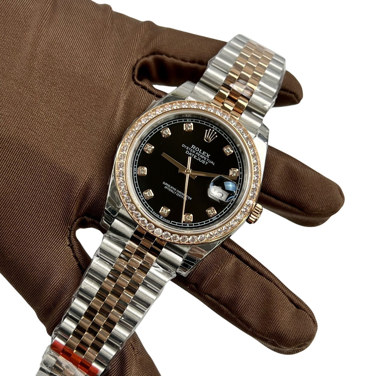 Dial: Black dial with original Rolex factory diamond hour markers and yellow gold baton hands. Date window at the 3 o’clock aperture.