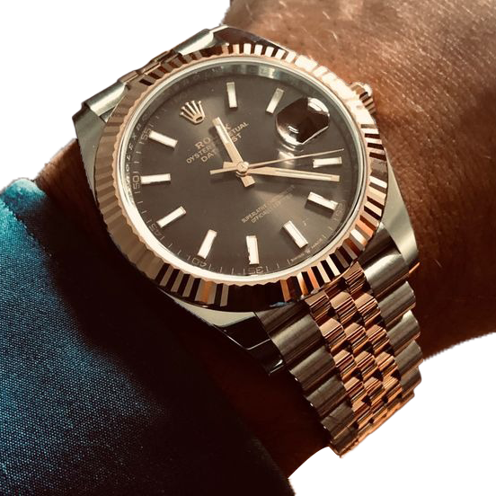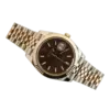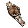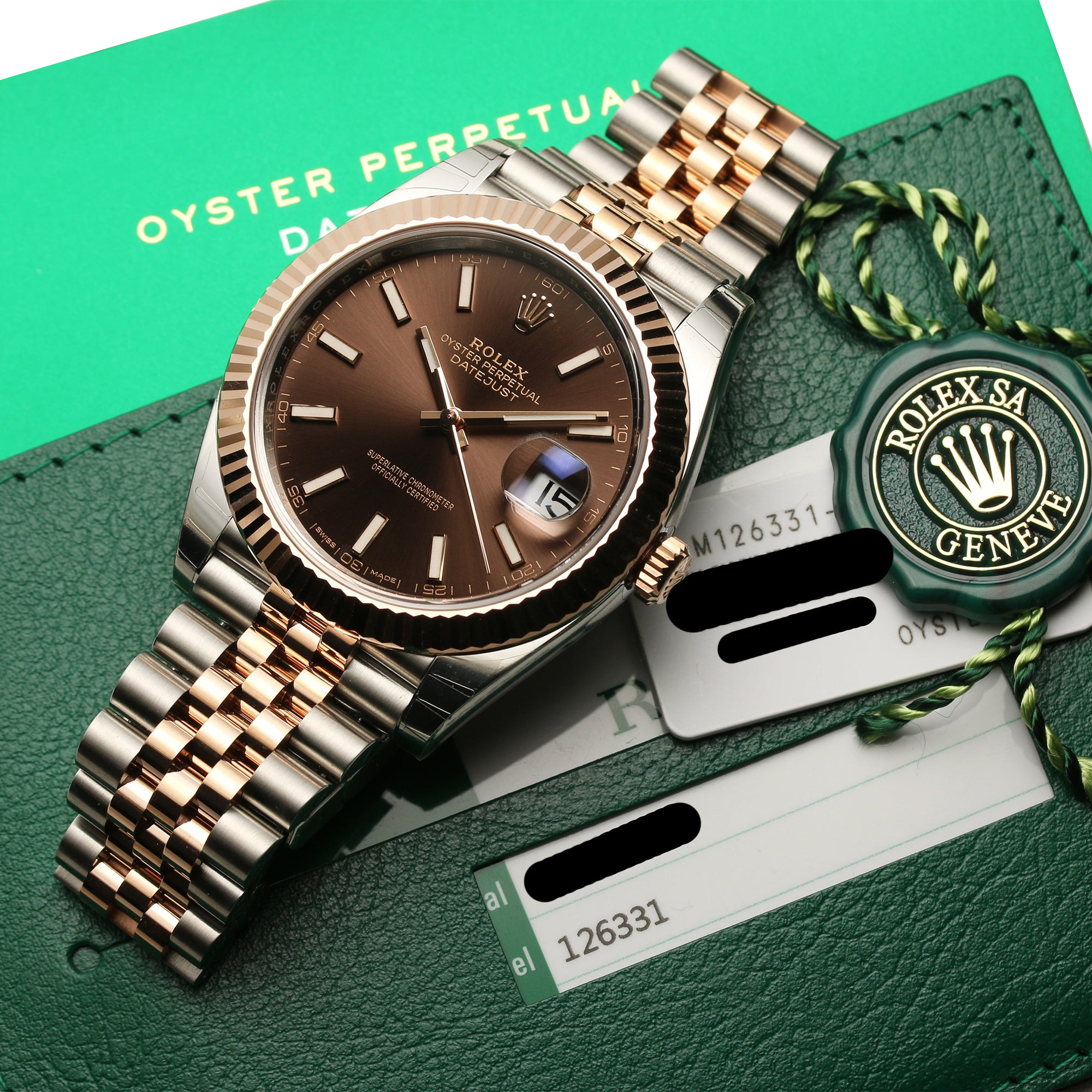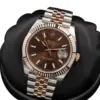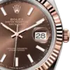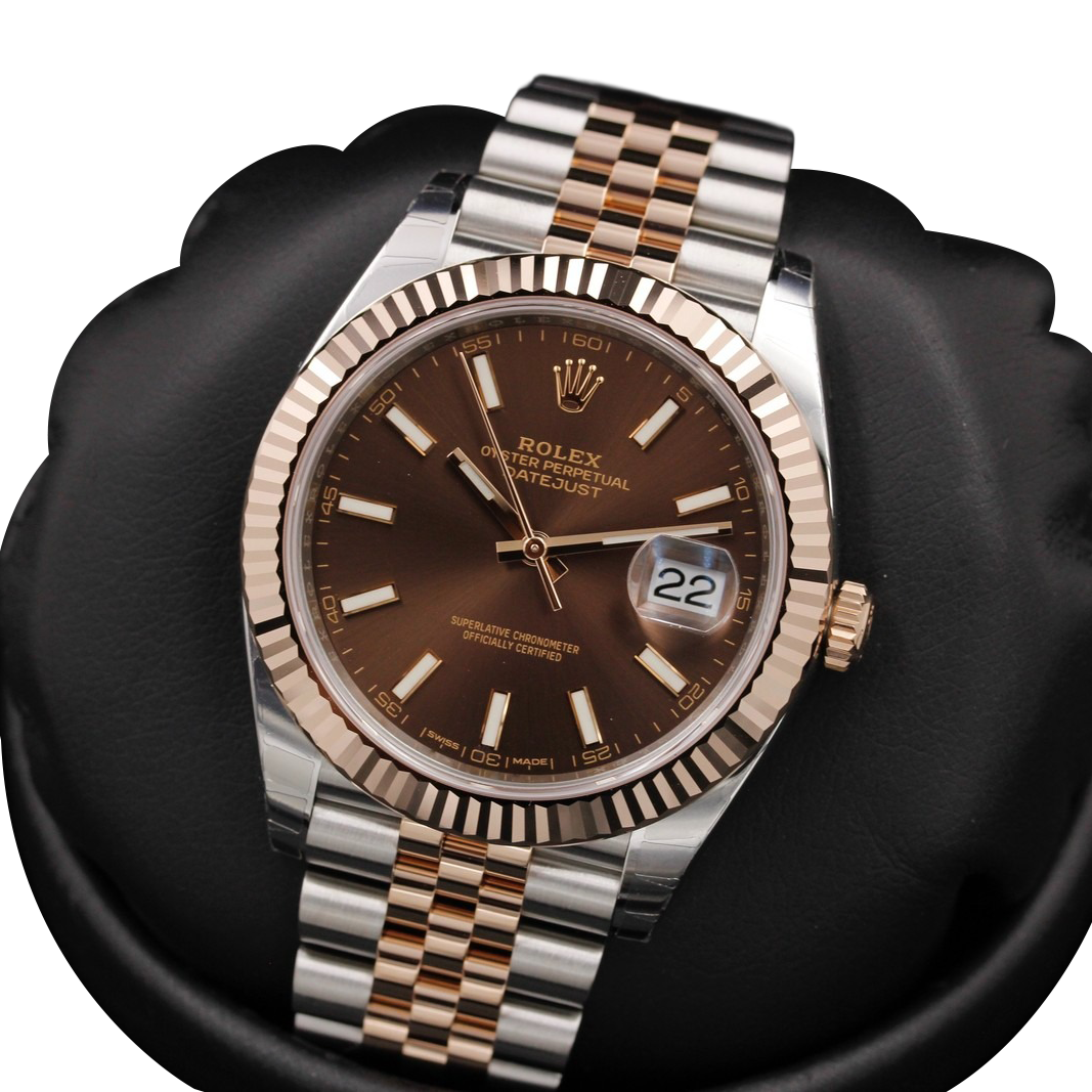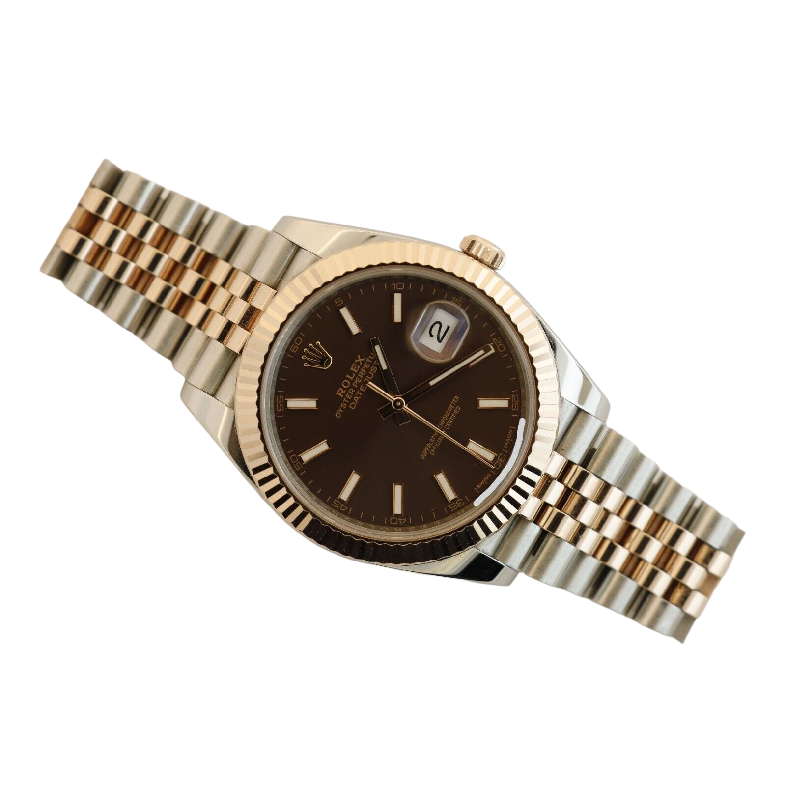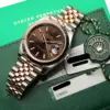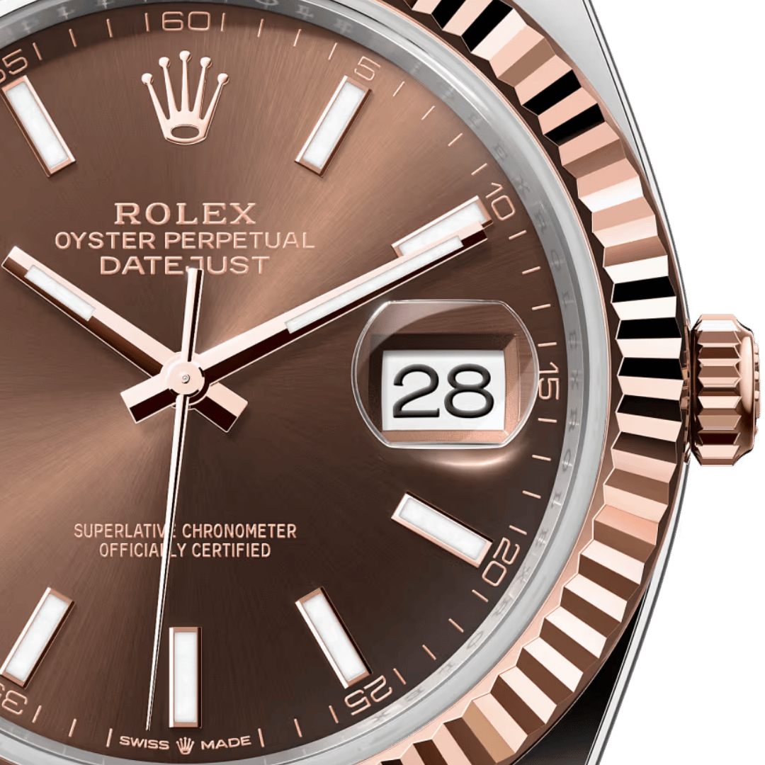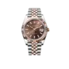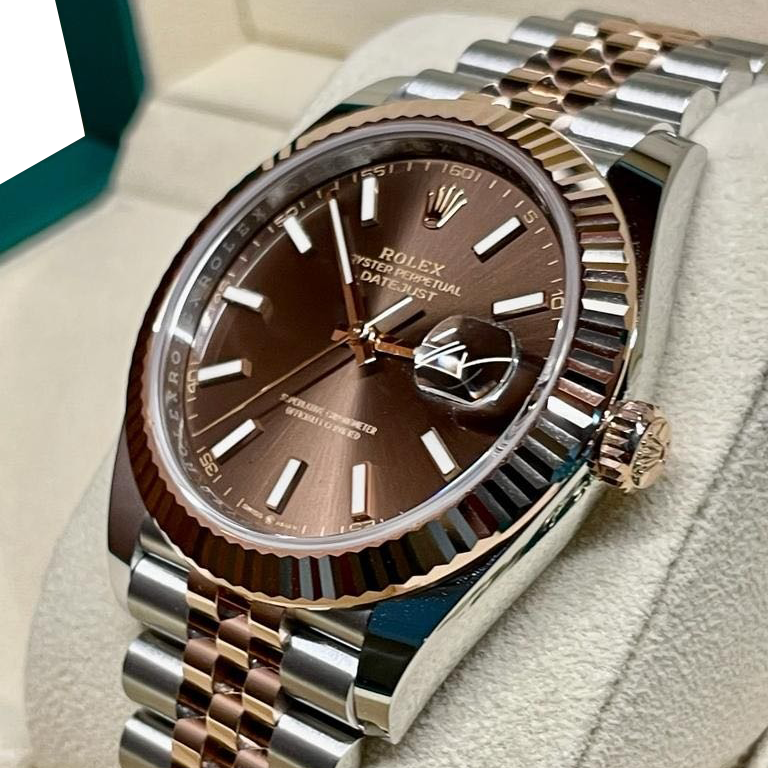 The rich chocolate sunray-style dial adds depth and warmth to the design, complemented by luminous-style hour markers that enhance visibility while maintaining a clean and balanced appearance. The signature fluted bezel further elevates the watch’s refined character, preserving the iconic Datejust identity.