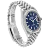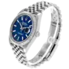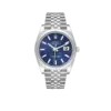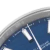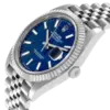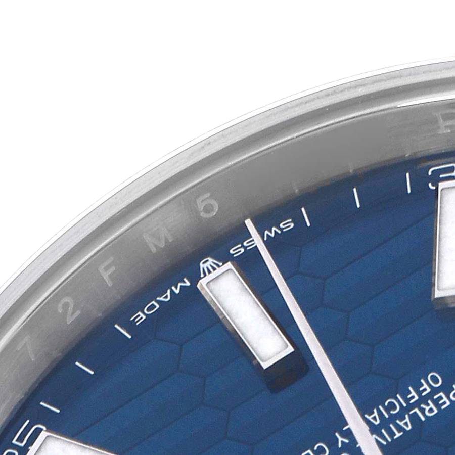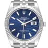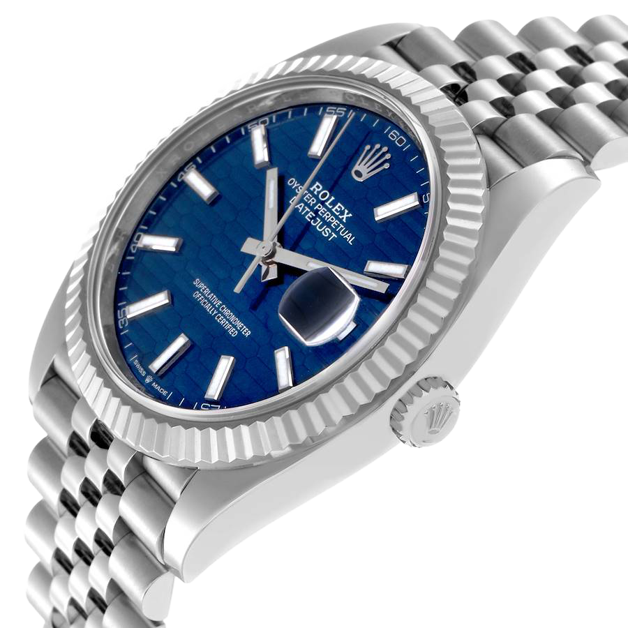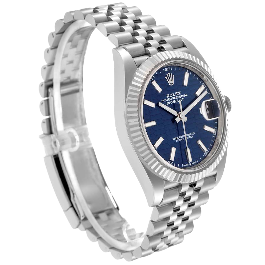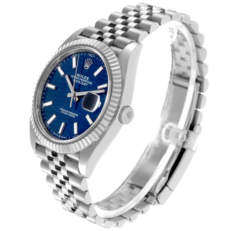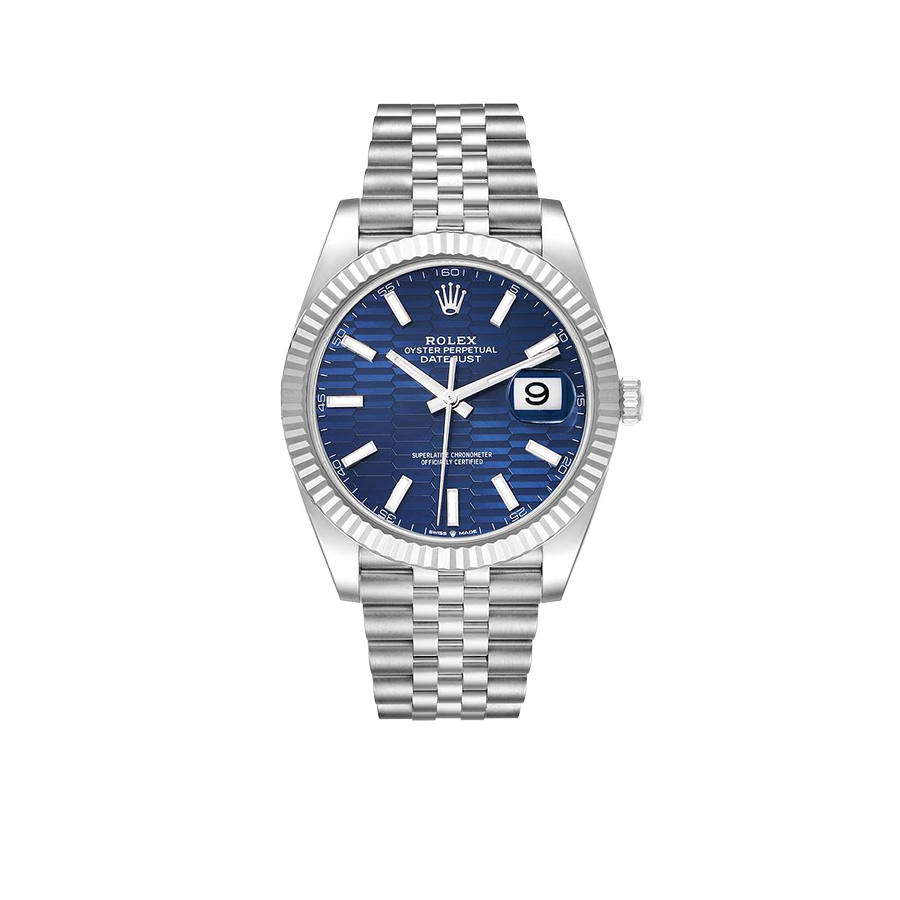 Dial: Blue fluted motif dial with luminescent-inlayed baton hour markers and white gold hands. Minute marker track around the outer rim. Date calendar window at the 3 o’clock aperture.