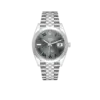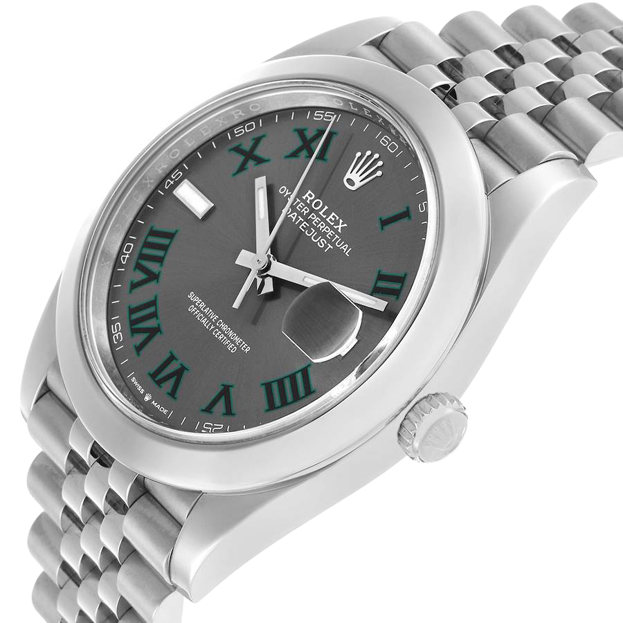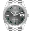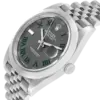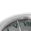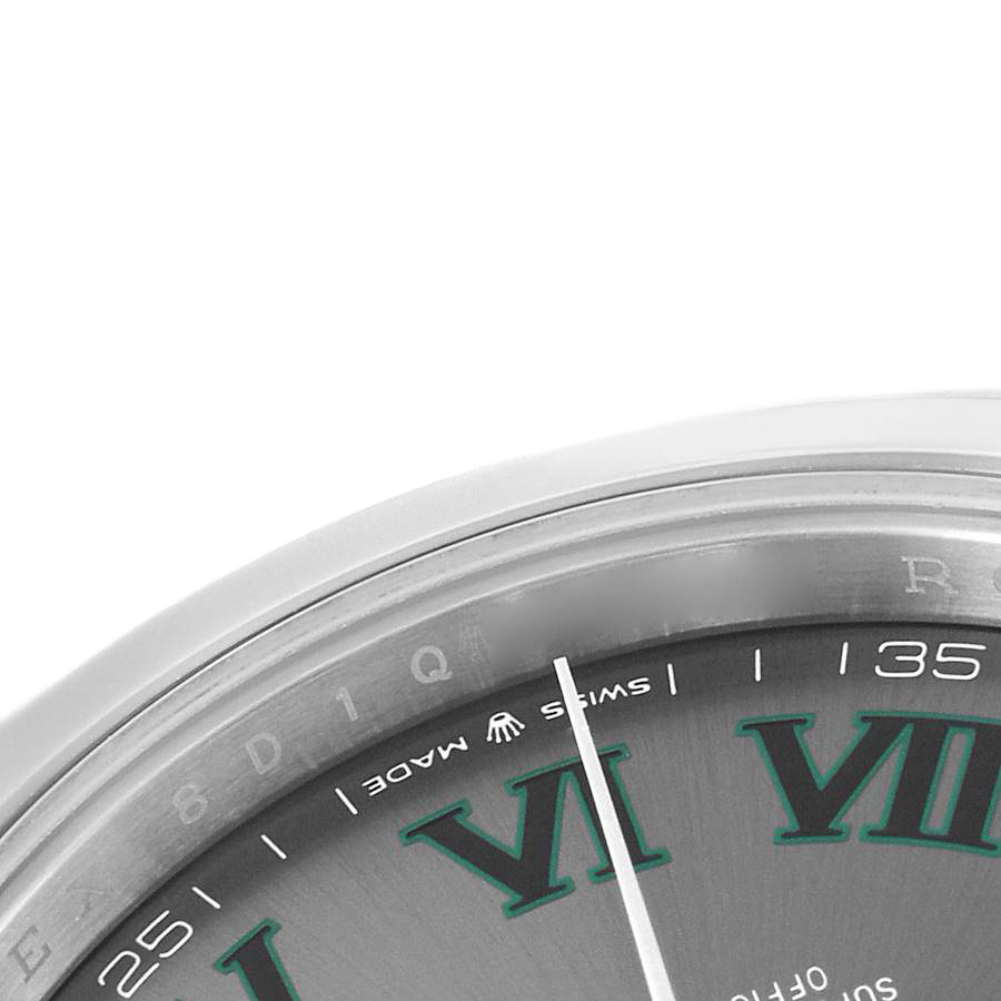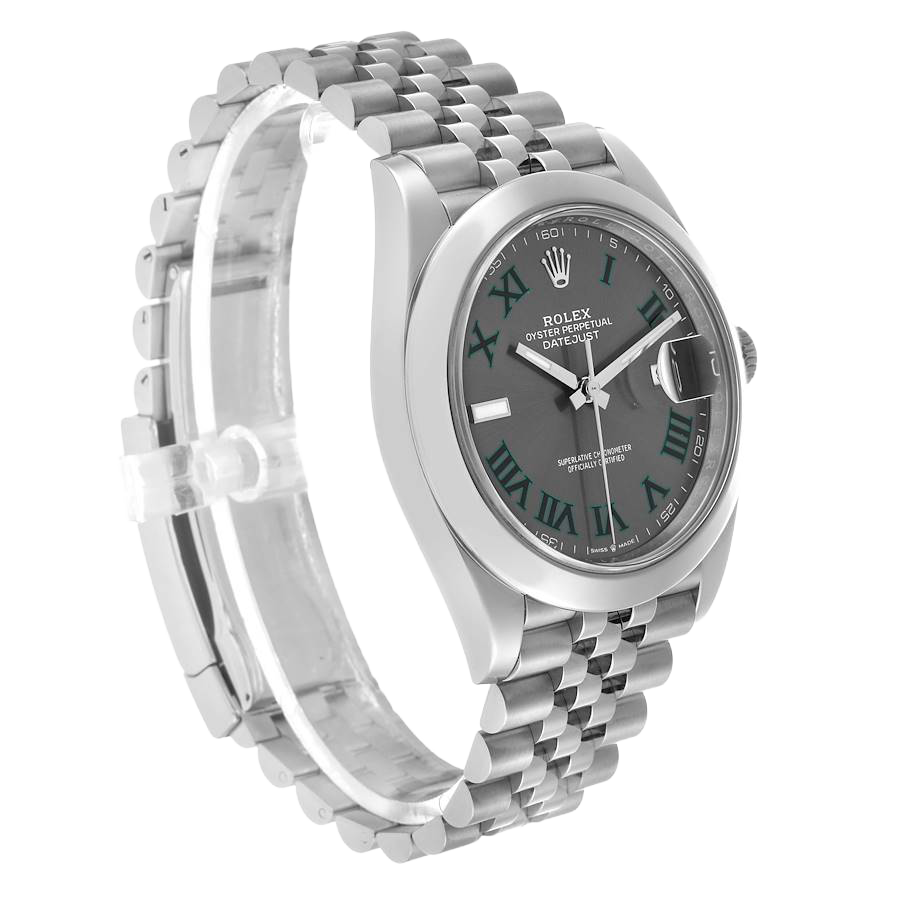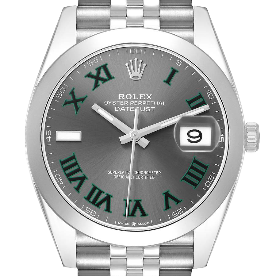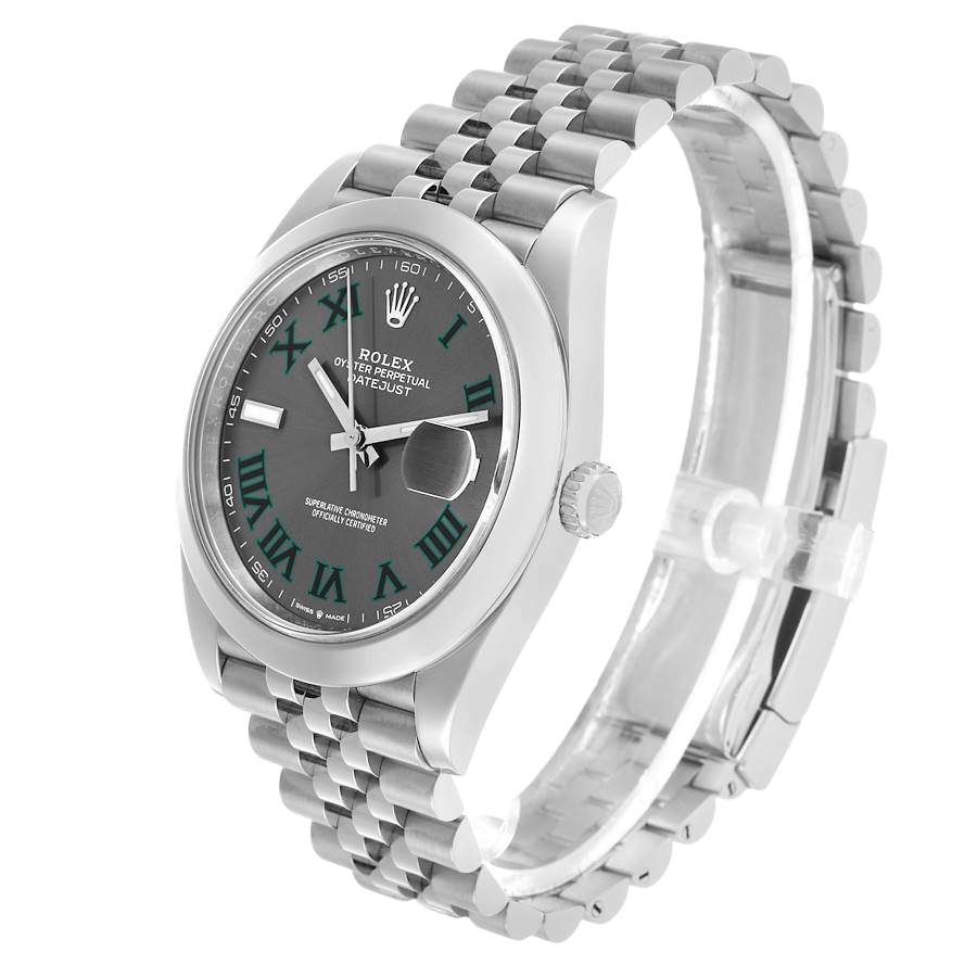 The Rolex Datejust 126300 ‘Wimbledon’ is a distinguished and sporty take on the classic Datejust, crafted in stainless steel with a 41mm polished case. Its slate gray dial, nicknamed “Wimbledon,” features bold green Roman numeral hour markers outlined in black, creating a striking contrast that adds a unique flair to the design. The luminous baton markers and signature date window at 3 o’clock, magnified by the Cyclops lens, ensure practicality and elegance.