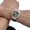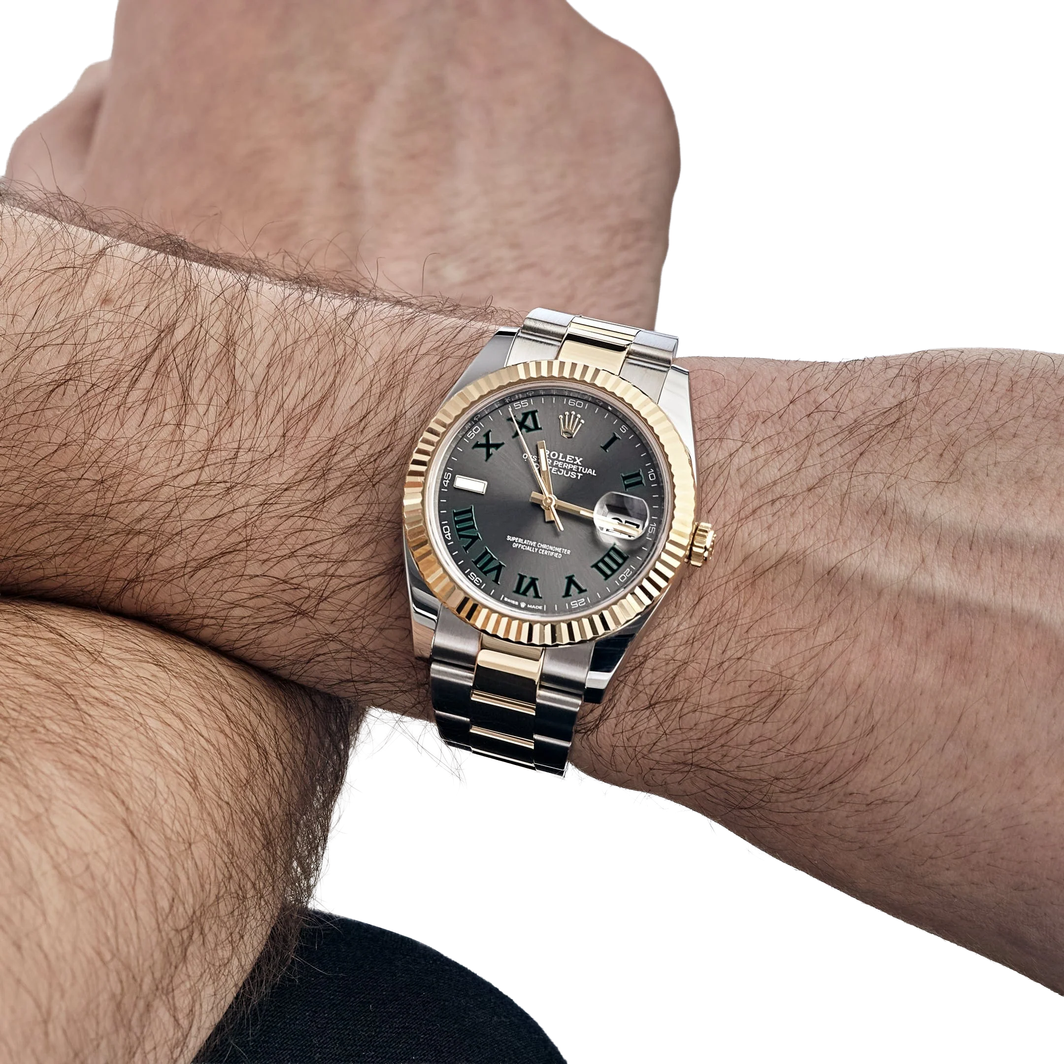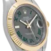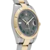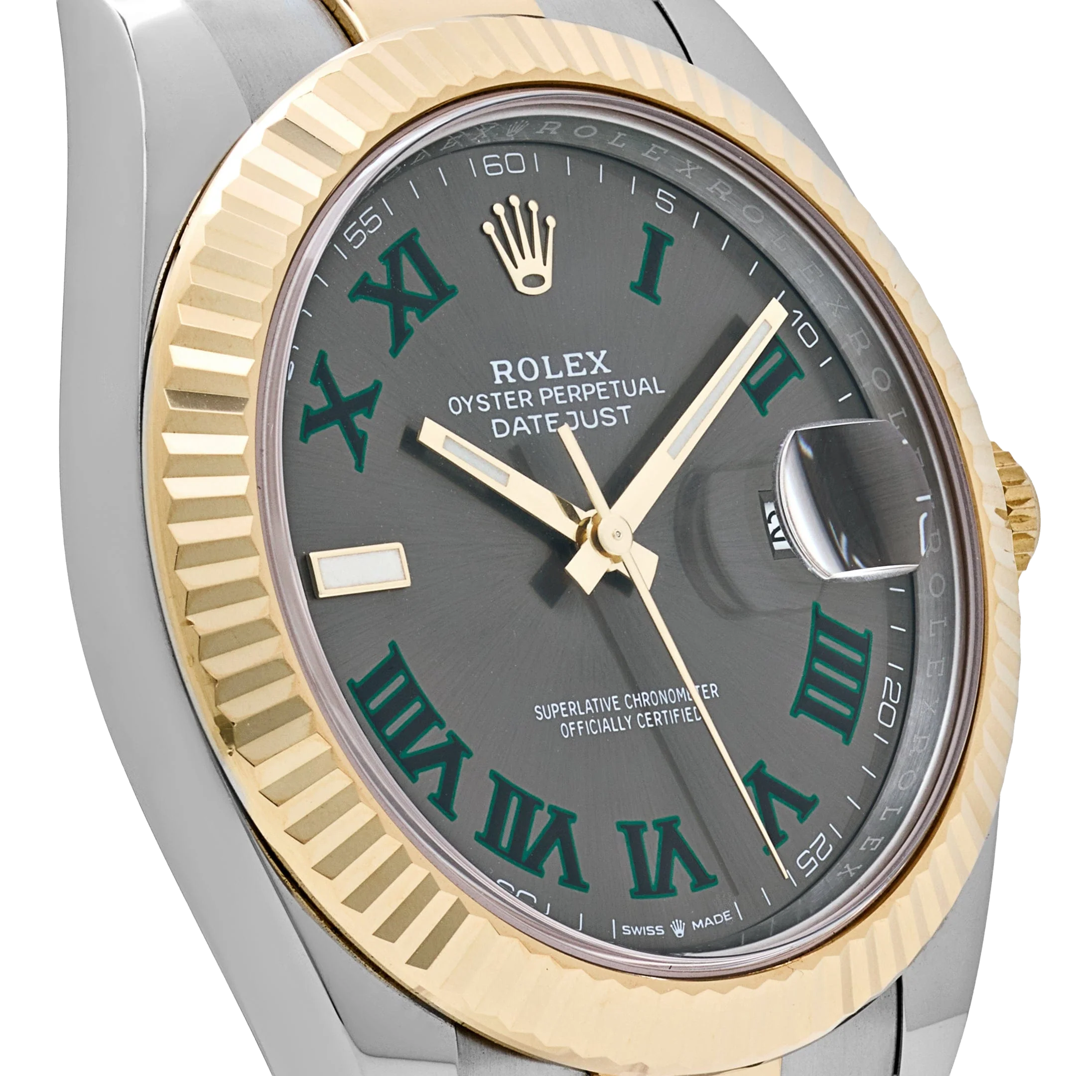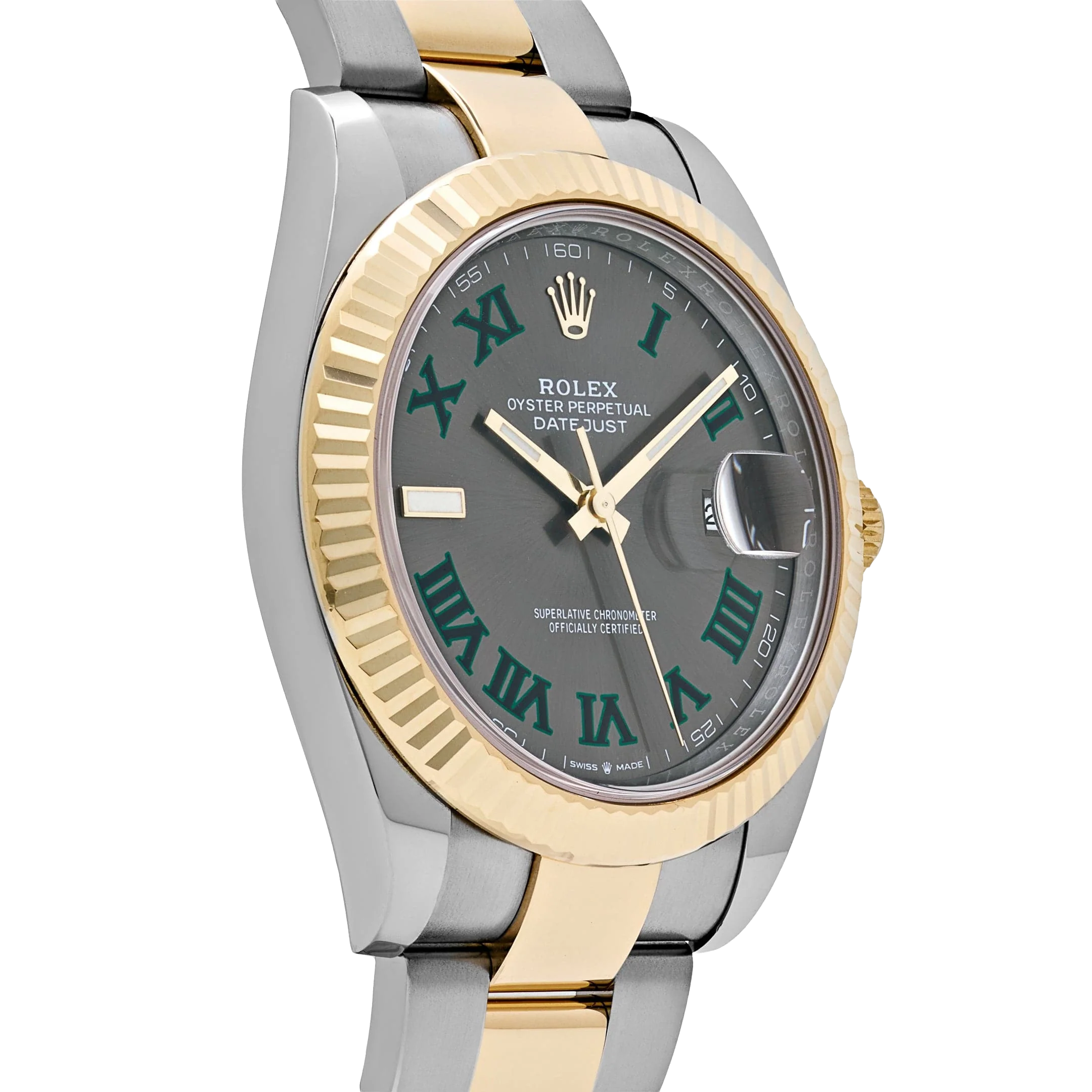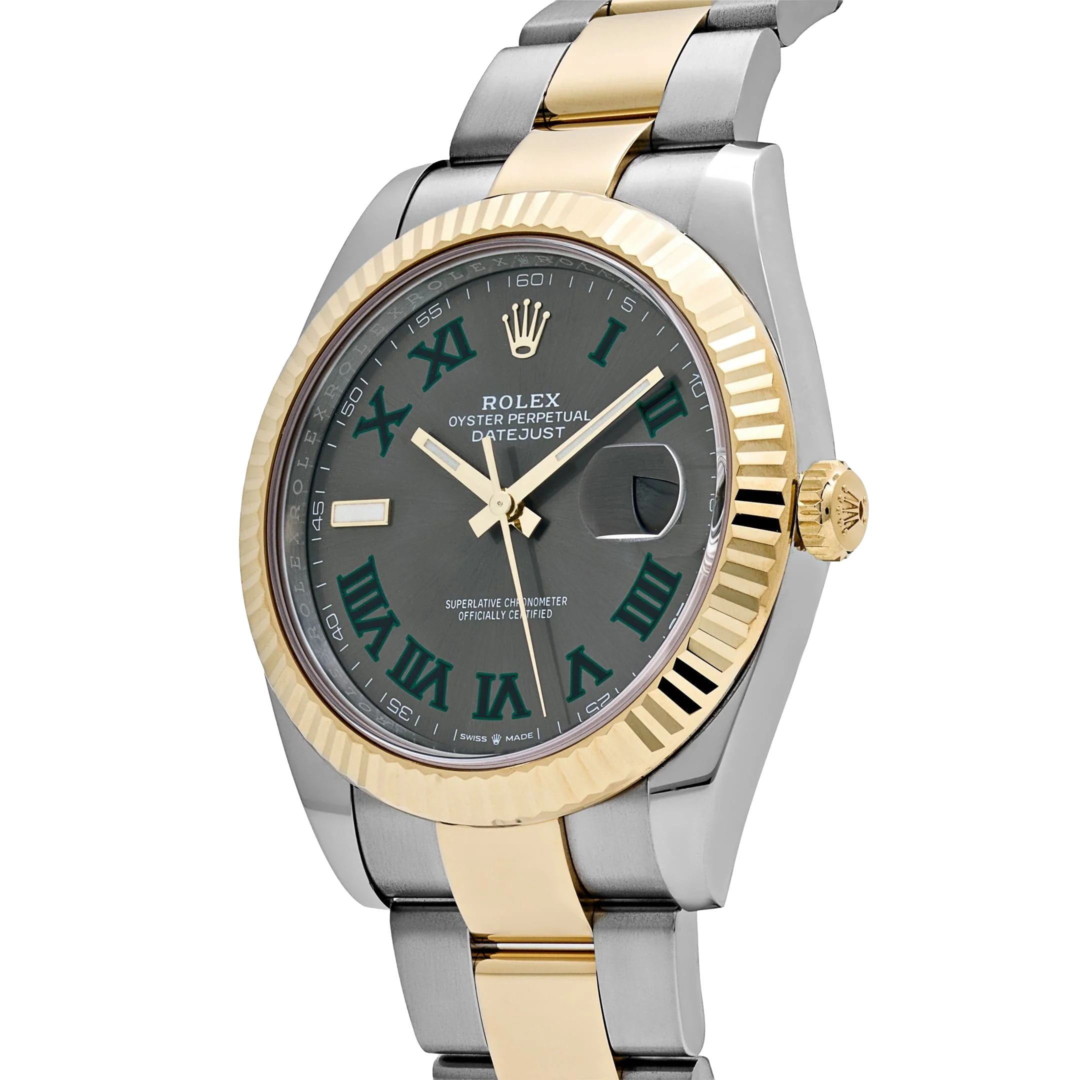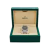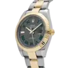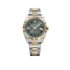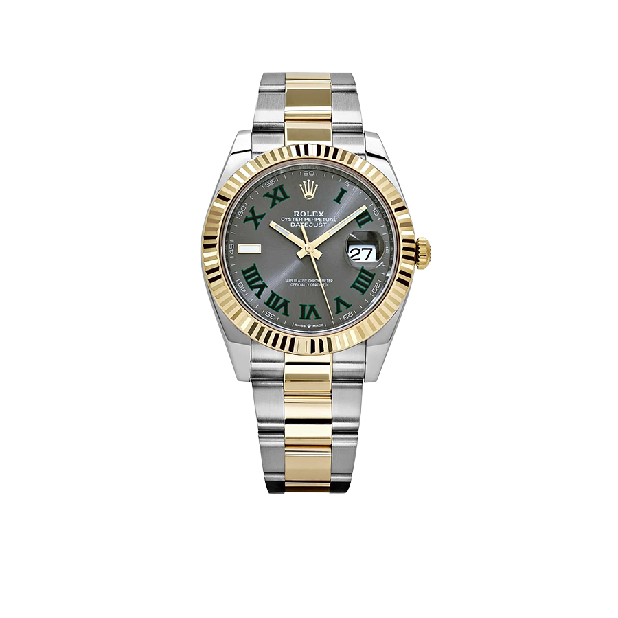 The Rolex Datejust 126333 is a distinguished blend of sportiness and elegance, crafted in stainless steel and yellow gold for a classic two-tone aesthetic. Its 41mm case is matched with a fluted bezel, while the striking slate dial—known as the “Wimbledon” dial—features green Roman numerals that add a subtle pop of color to the design. Luminous hour markers and hands ensure easy readability, even in low light conditions.