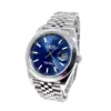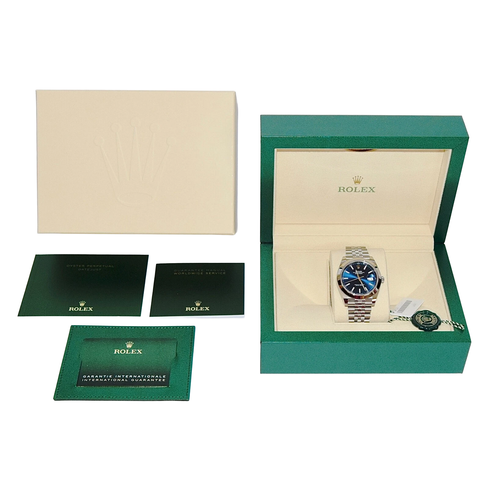 The Rolex Datejust 41 126300 in Oystersteel, featuring a classic blue dial, represents the purest expression of the Datejust lineage—refined, versatile, and resolutely contemporary. Its 41mm Oyster case, paired with a smooth polished bezel, offers a clean, confident silhouette built to withstand time.