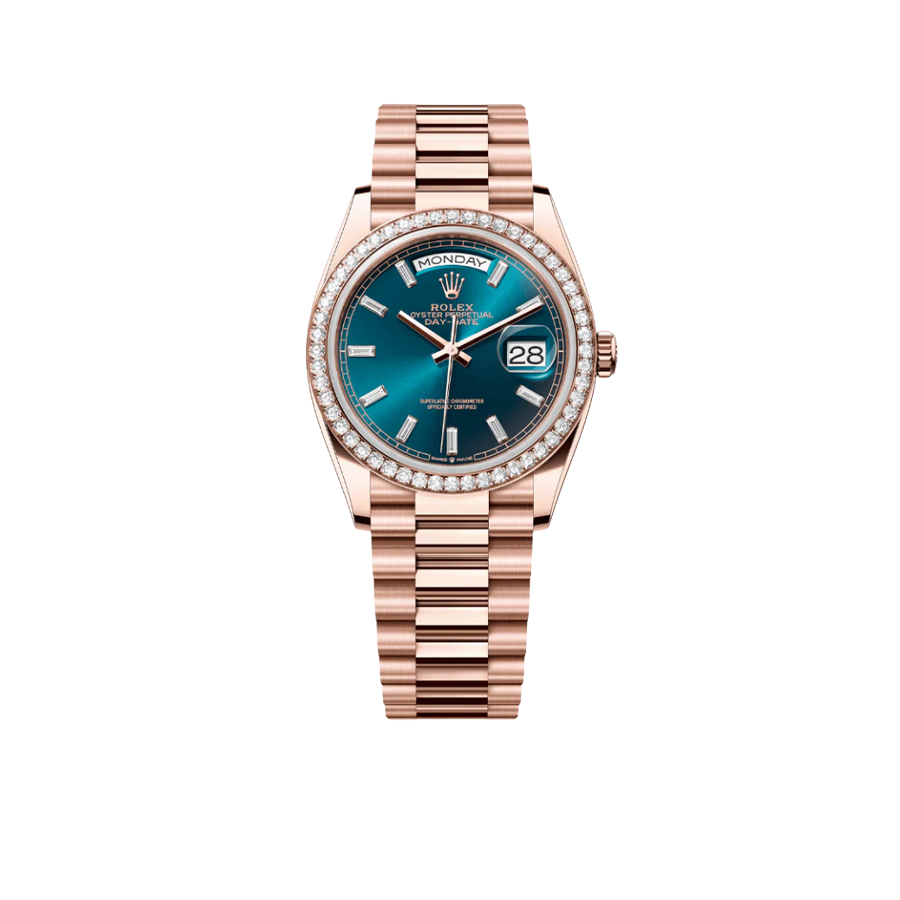 The Rolex Day-Date 36 reference 128345RBR is a luxurious take on a classic, crafted from Rolex’s proprietary 18k Everose gold for a warm, enduring finish. This model features a sophisticated sundust dial that pairs elegantly with the Everose gold case, while diamond hour markers add a touch of brilliance. Framing the dial is a diamond-set bezel, bringing a level of refinement and radiance to the timepiece.