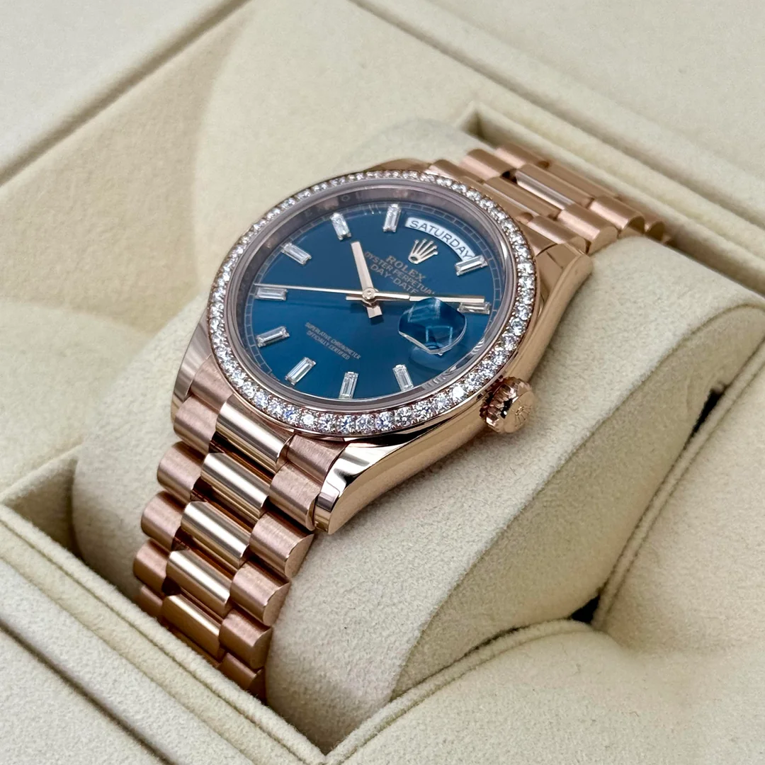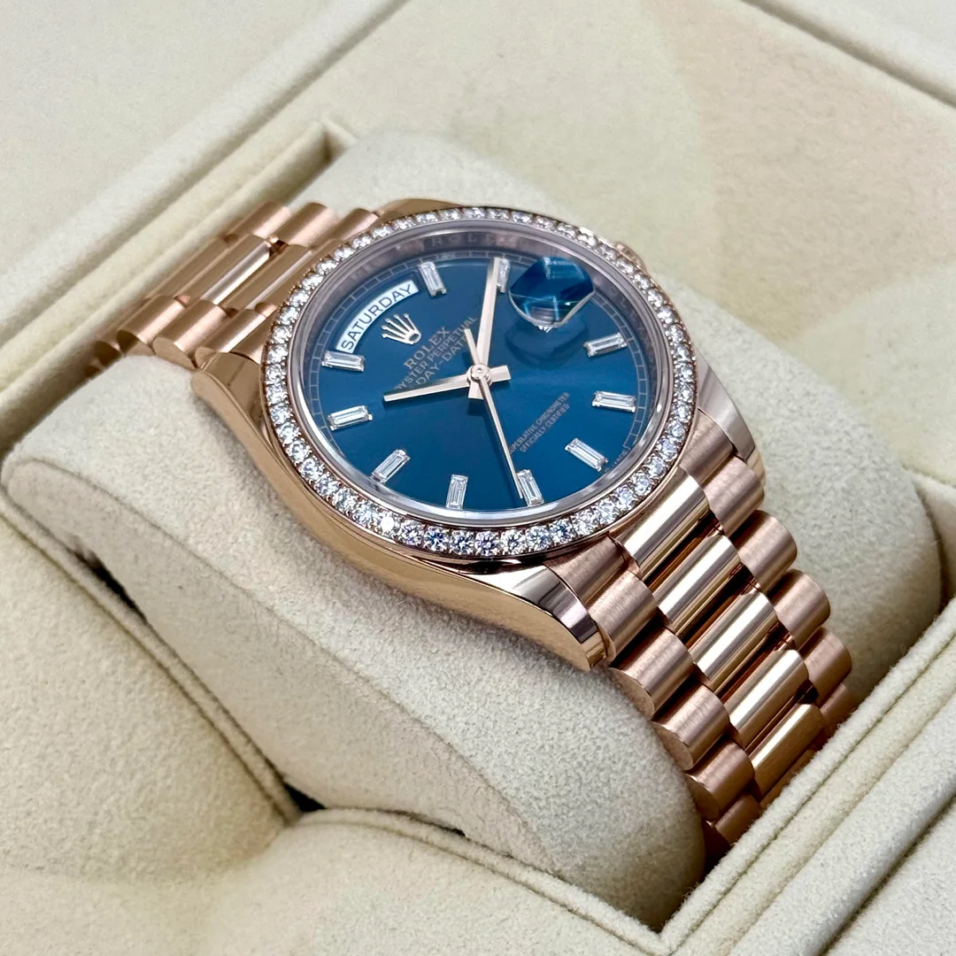 Equipped with the iconic day and date windows at 12 and 3 o’clock and fitted with Rolex’s renowned President bracelet, the 128345RBR combines elegance with comfort. This Day-Date 36 is perfect for collectors seeking a watch that balances traditional Rolex design with a luxurious, modern edge.