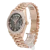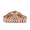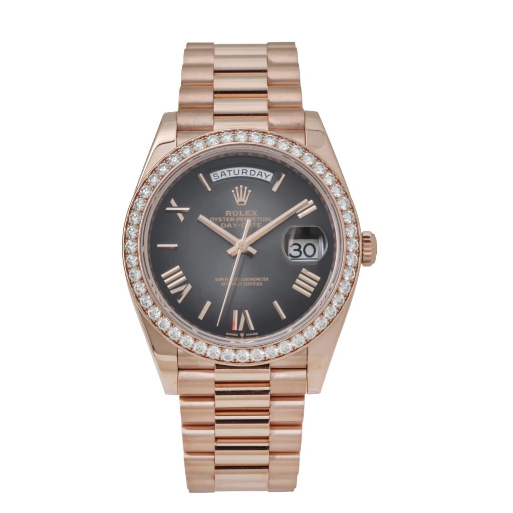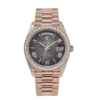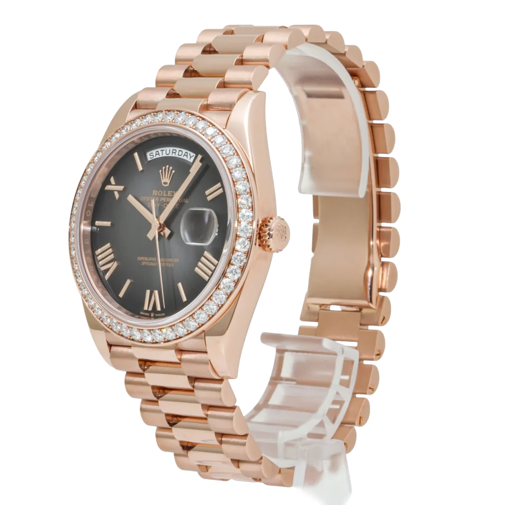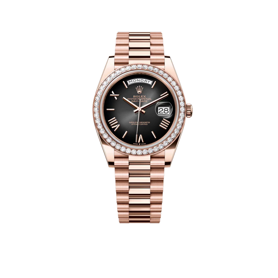 The Rolex Day-Date 228235 is an exceptional blend of luxury and refinement, crafted in 18k rose gold for a warm and opulent aesthetic. Its 40mm case is elevated by a dazzling diamond-set bezel, adding a radiant brilliance that highlights Rolex’s gem-setting expertise. The sleek black lacquered dial provides a striking contrast, featuring diamond hour markers set in rose gold for a harmonious and sophisticated design.