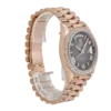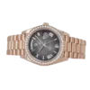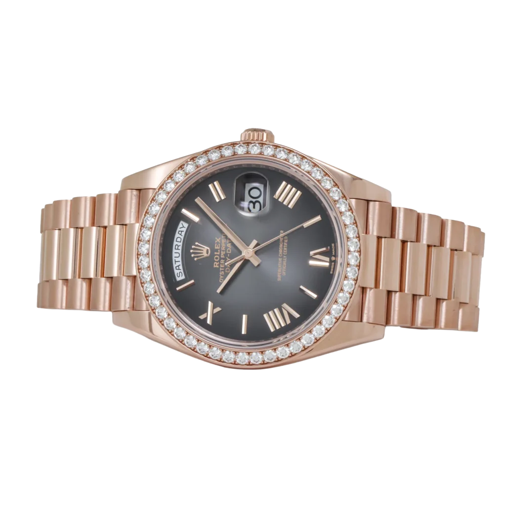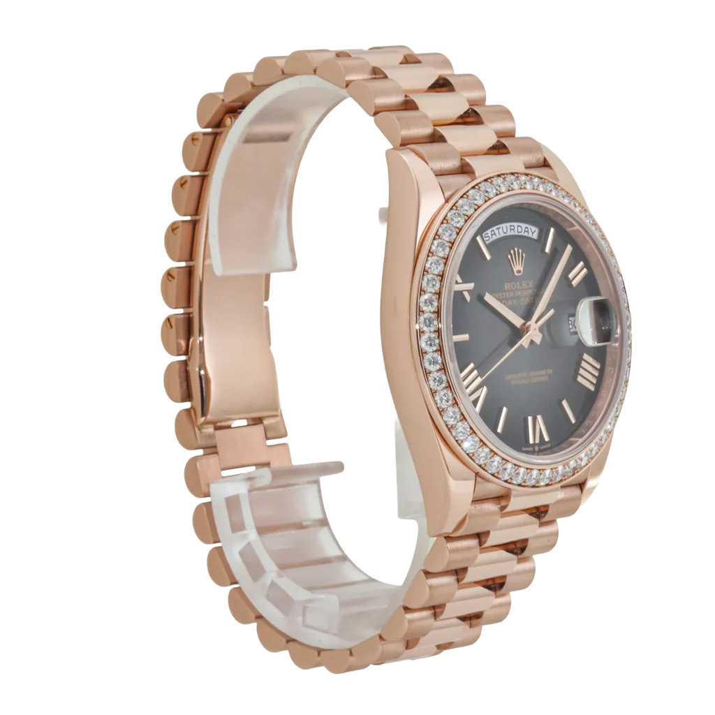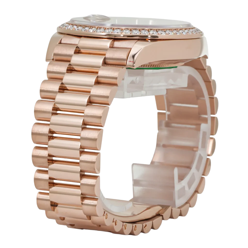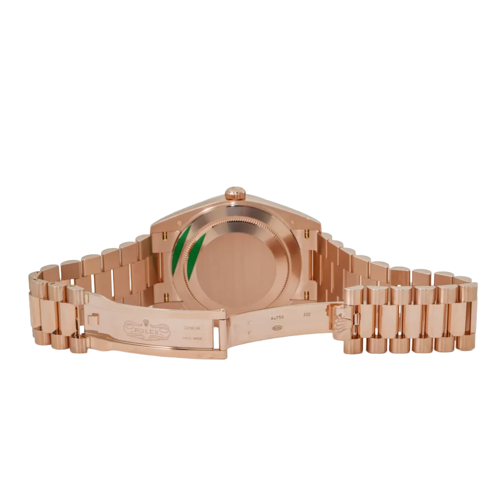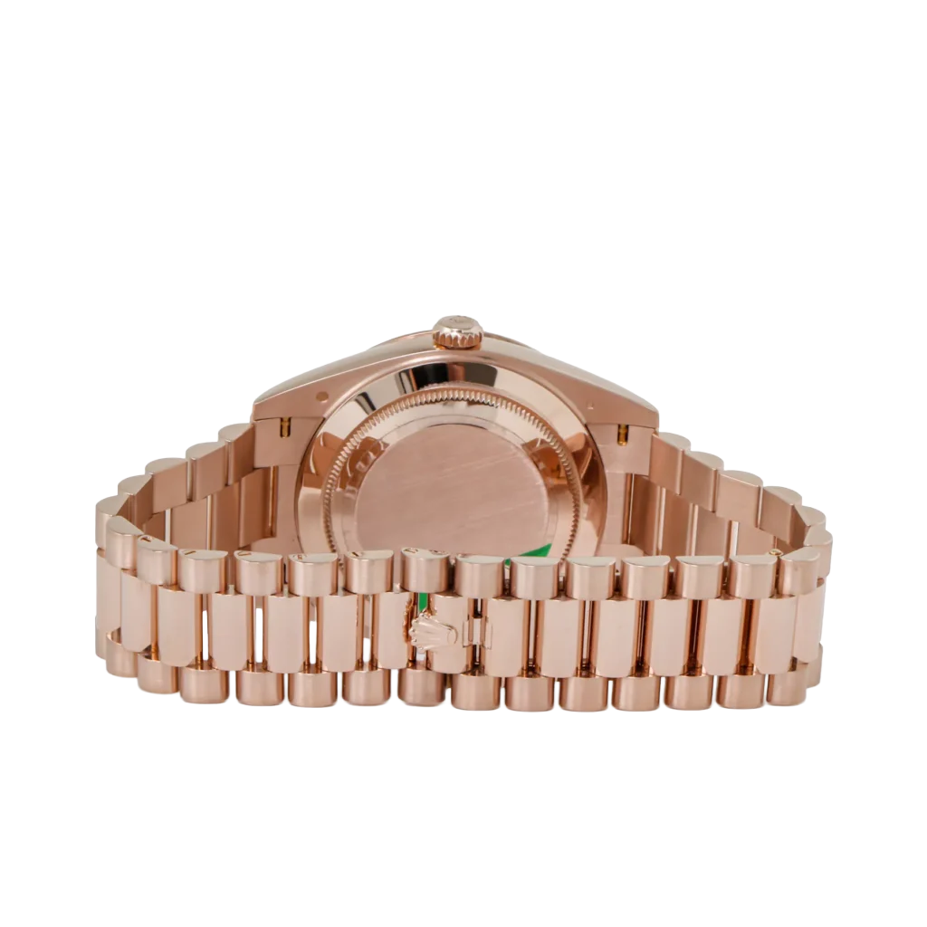 Signature to the Day-Date collection, the watch features the day display at 12 o’clock and the date window at 3 o’clock, both magnified by Rolex’s Cyclops lens for effortless legibility. Paired with the iconic President bracelet, known for its polished three-link construction and unparalleled comfort, the Day-Date 228235 is a testament to Rolex’s mastery in combining timeless design with luxurious details. Perfect for collectors who appreciate bold elegance, this timepiece is a true symbol of prestige and craftsmanship.
