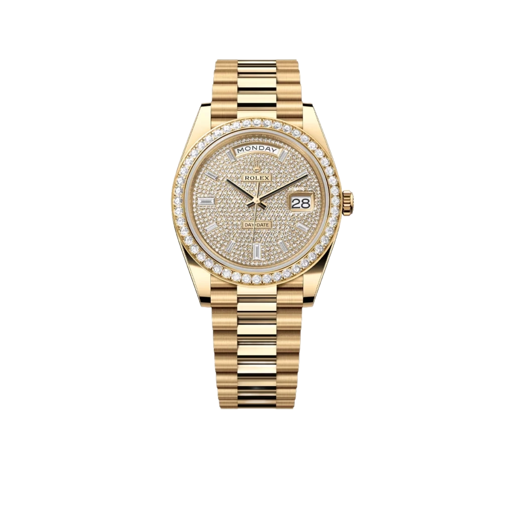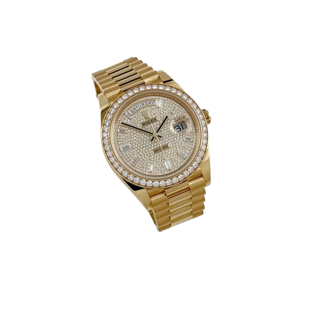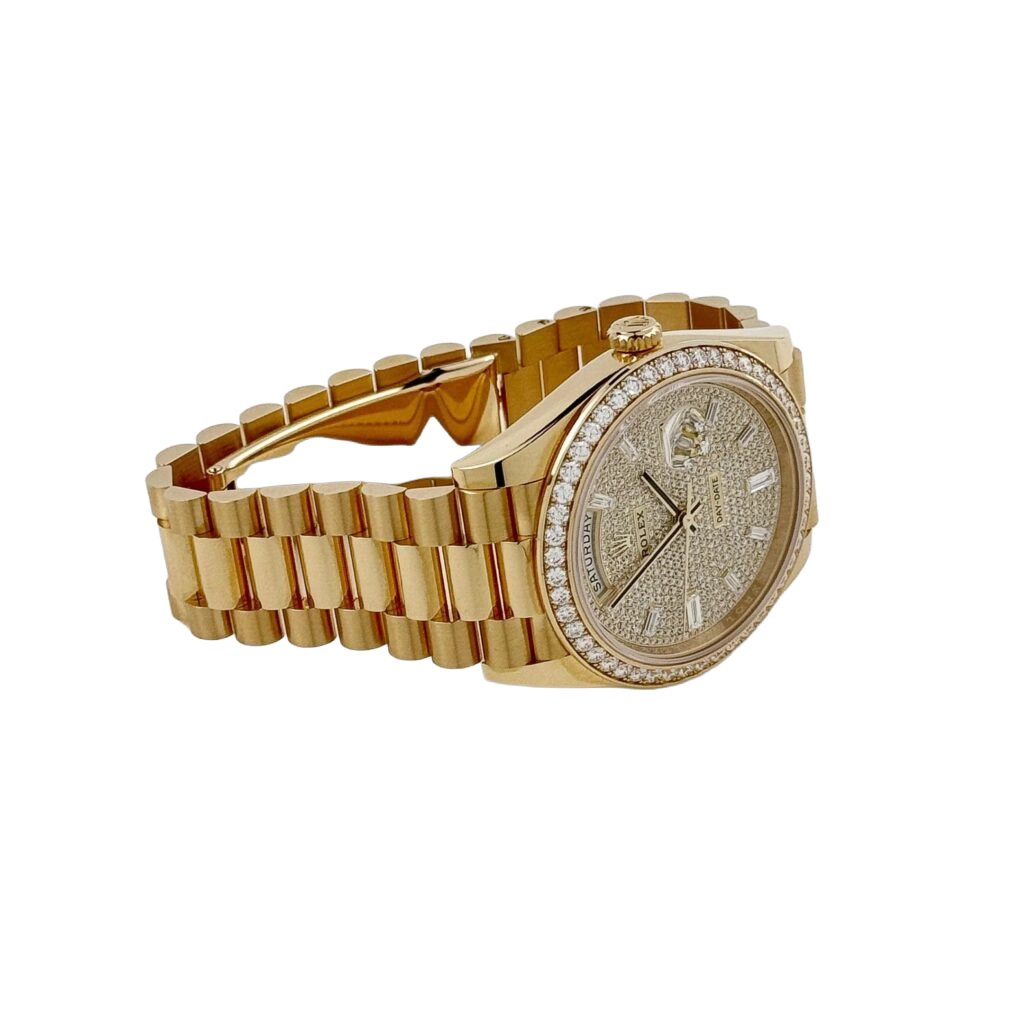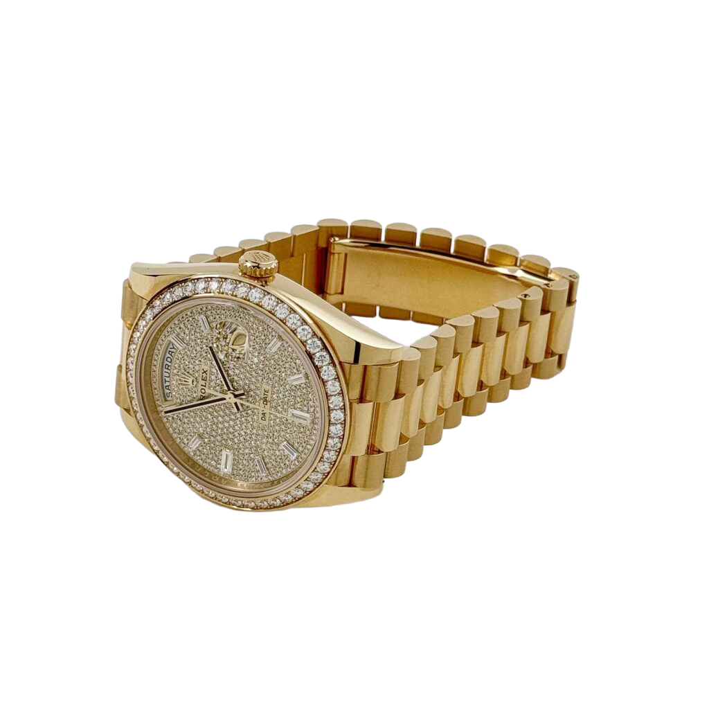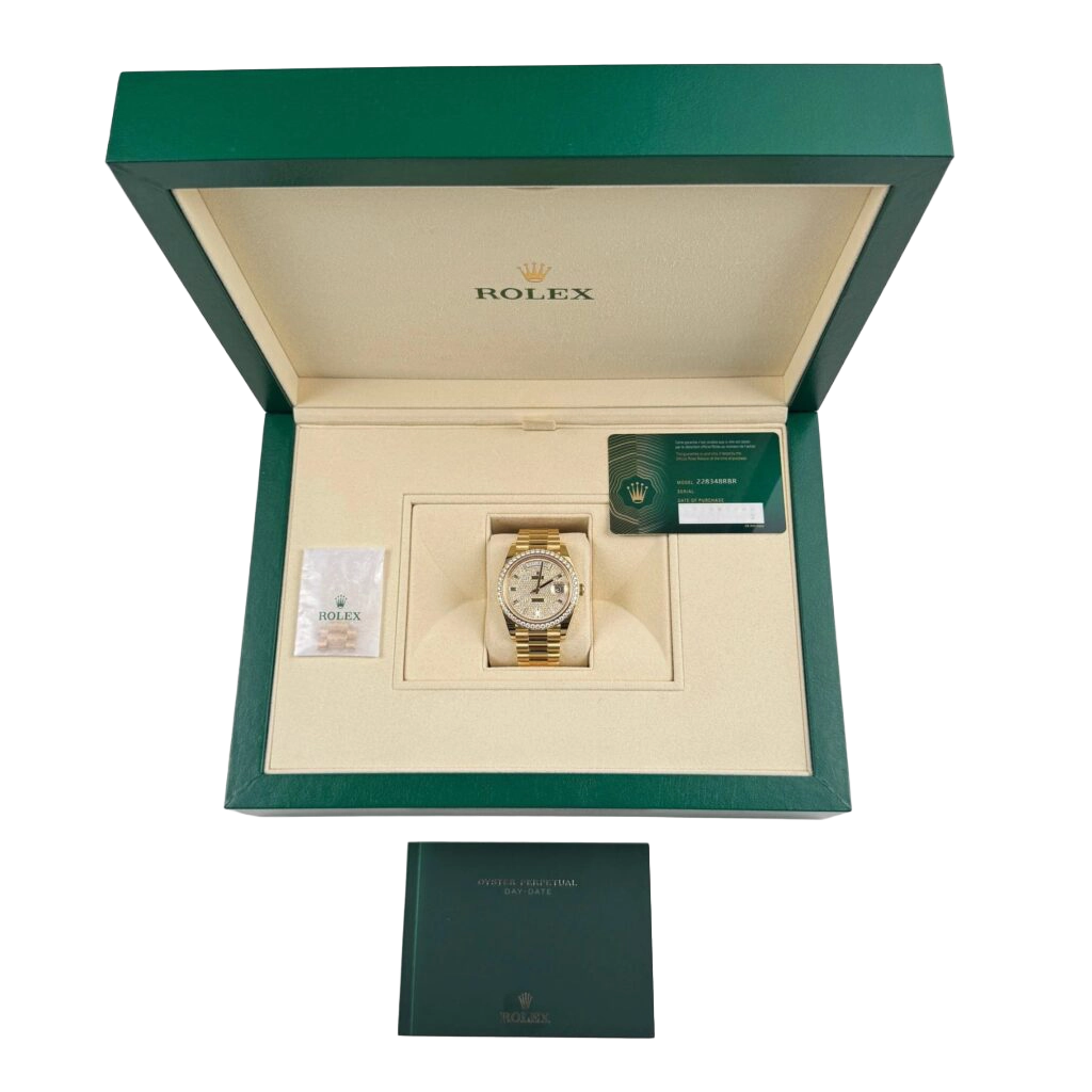 The Rolex Day-Date 40 228348RBR represents an elevated fusion of craftsmanship and elegance. Crafted in 18k yellow gold, its 40 mm case is framed by a diamond-set bezel that conveys subtle grandeur. The dial is meticulously paved with brilliant-cut diamonds and accented by baguette-hour markers, ensuring the Day and Date functions stand out with luminous clarity and decorative precision.