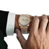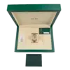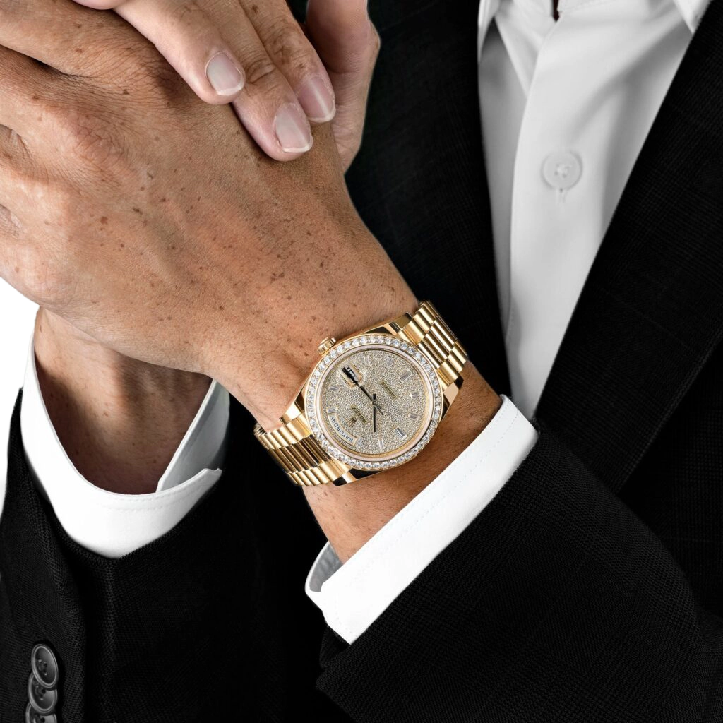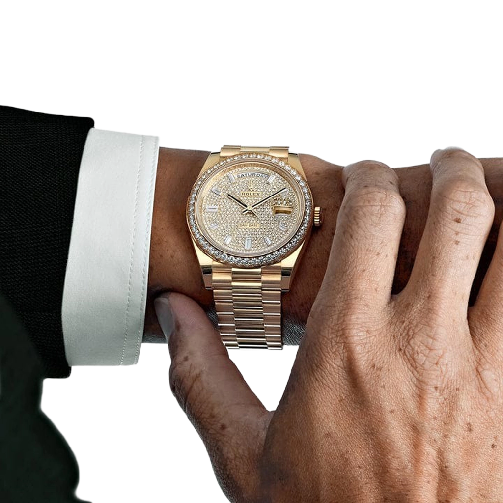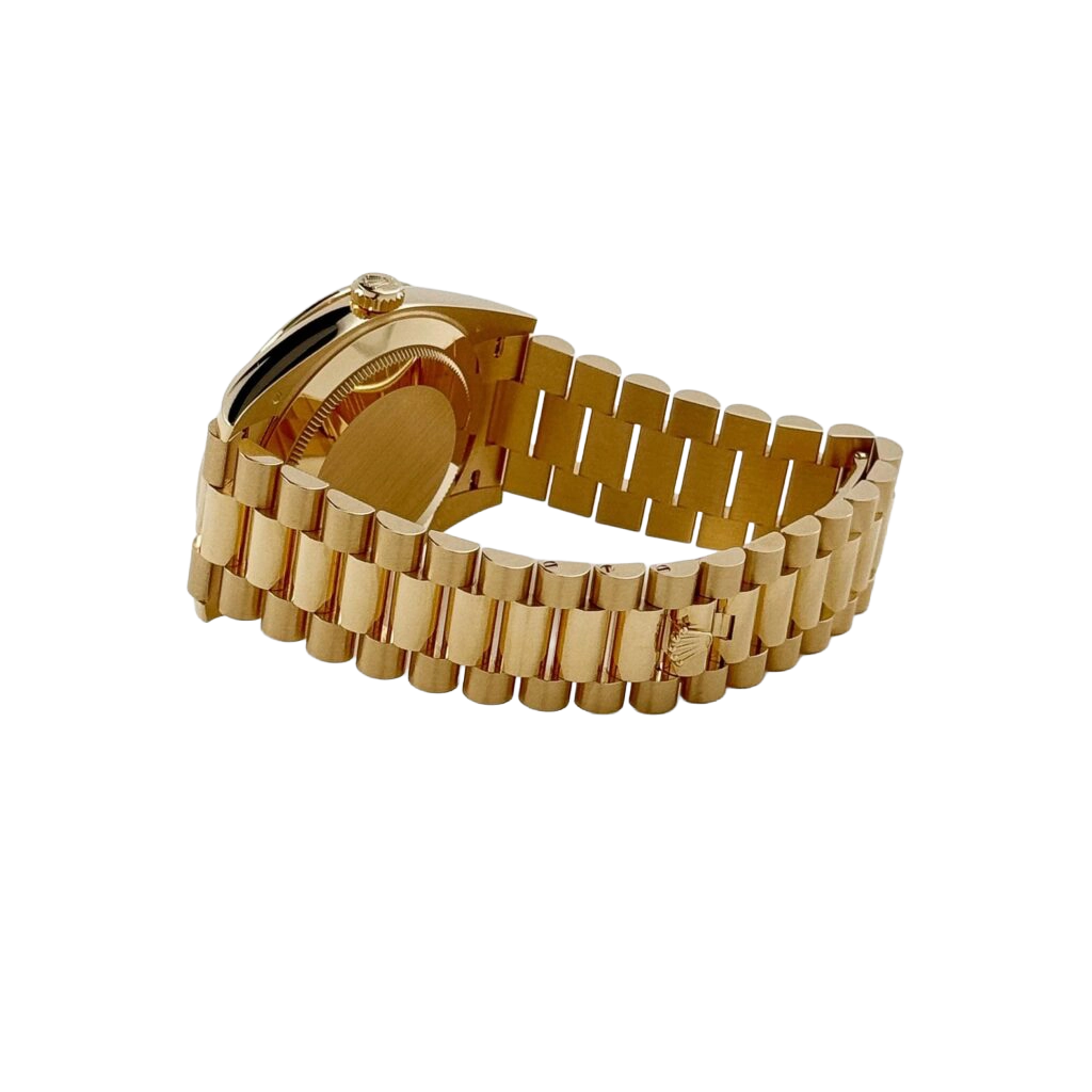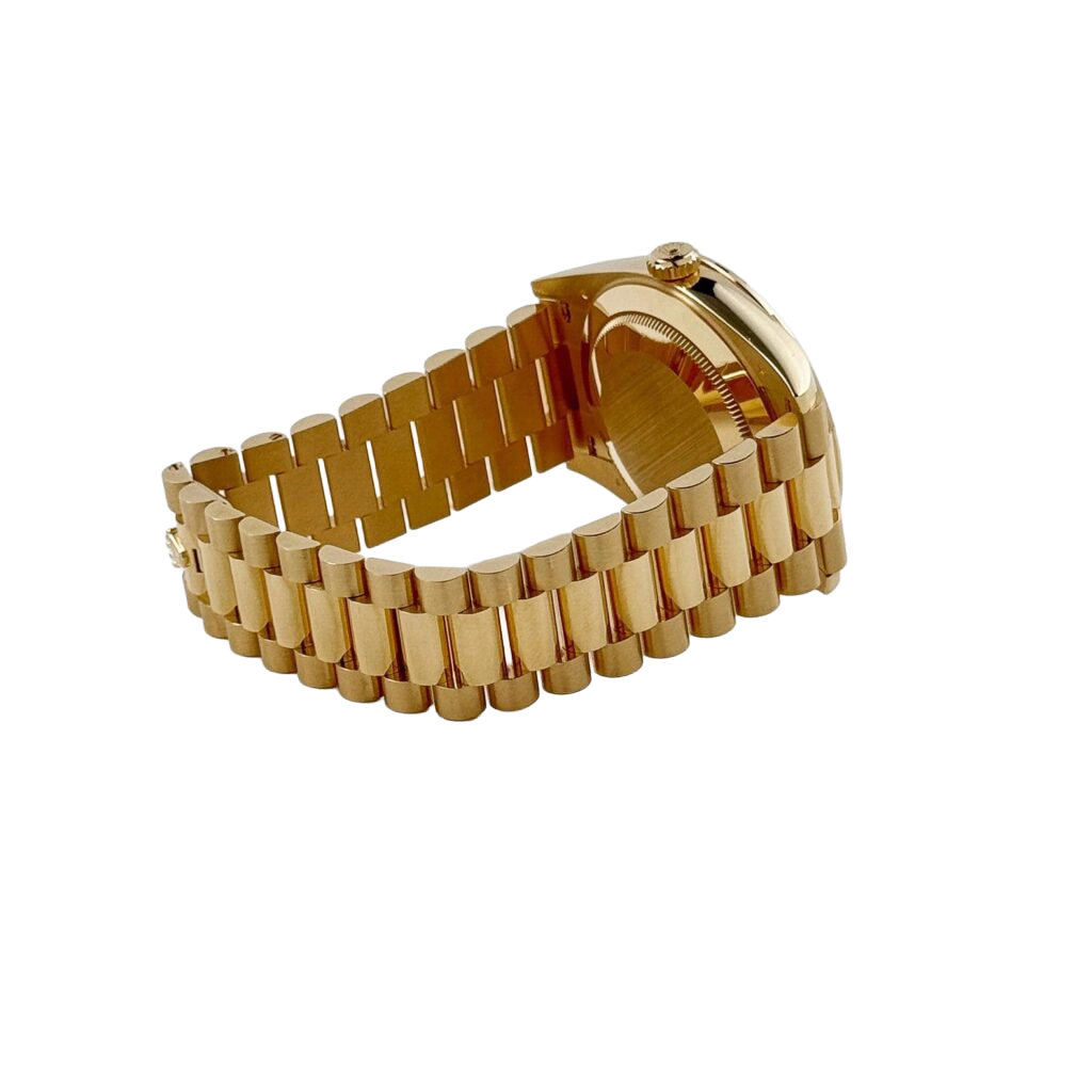The Rolex Day-Date 40 228348RBR represents an elevated fusion of craftsmanship and elegance. Crafted in 18k yellow gold, its 40 mm case is framed by a diamond-set bezel that conveys subtle grandeur. The dial is meticulously paved with brilliant-cut diamonds and accented by baguette-hour markers, ensuring the Day and Date functions stand out with luminous clarity and decorative precision.