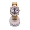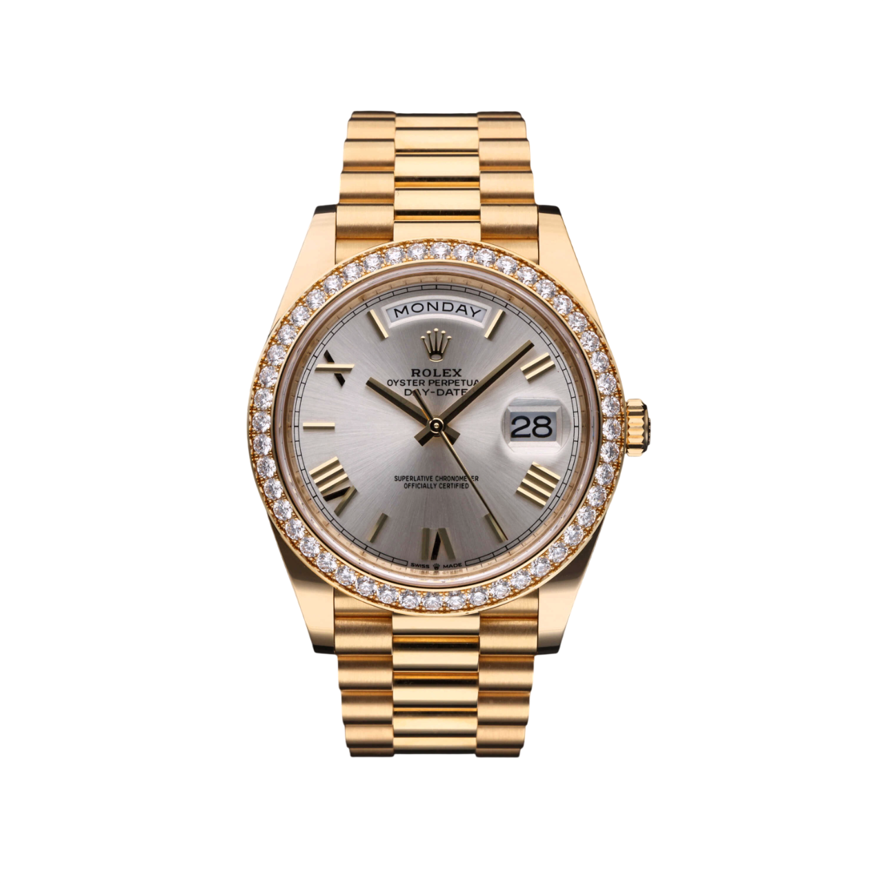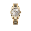 The silver dial enhances the watch’s sophisticated and balanced aesthetic, complemented by applied Roman numeral hour markers in yellow gold-tone for a clean, harmonious contrast. Signature Day-Date elements — the weekday display at 12 o’clock and the date window at 3 o’clock — preserve the model’s instantly recognizable identity while maintaining its timeless appeal.