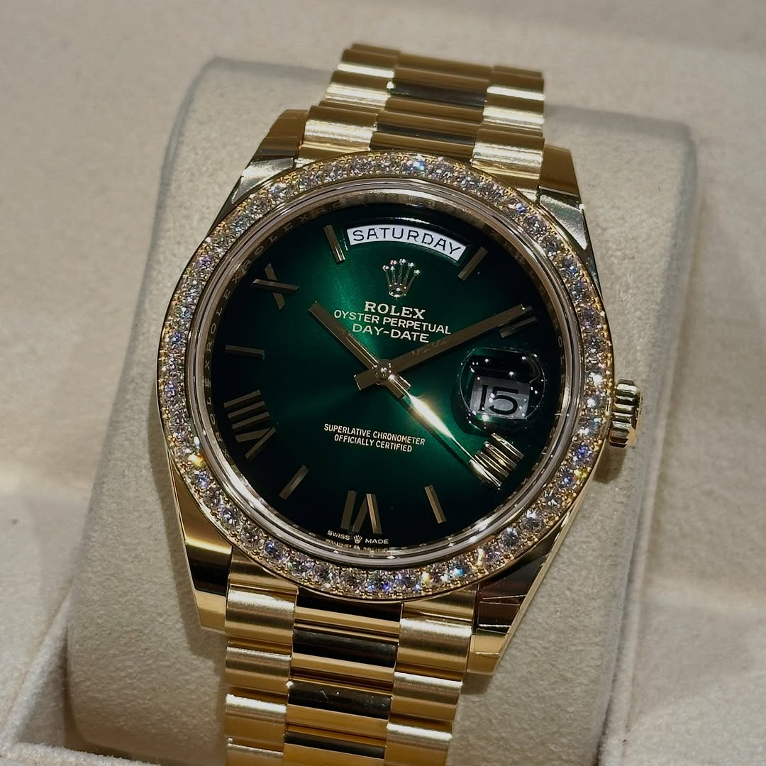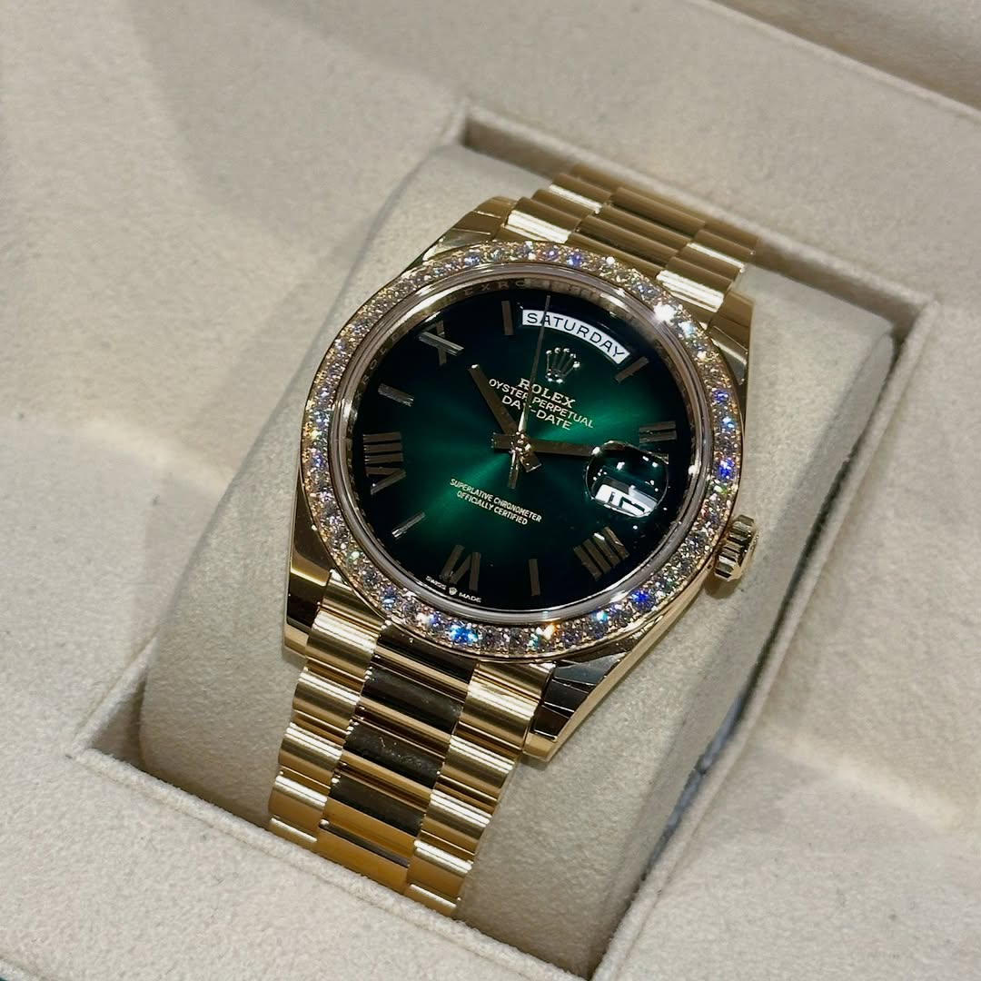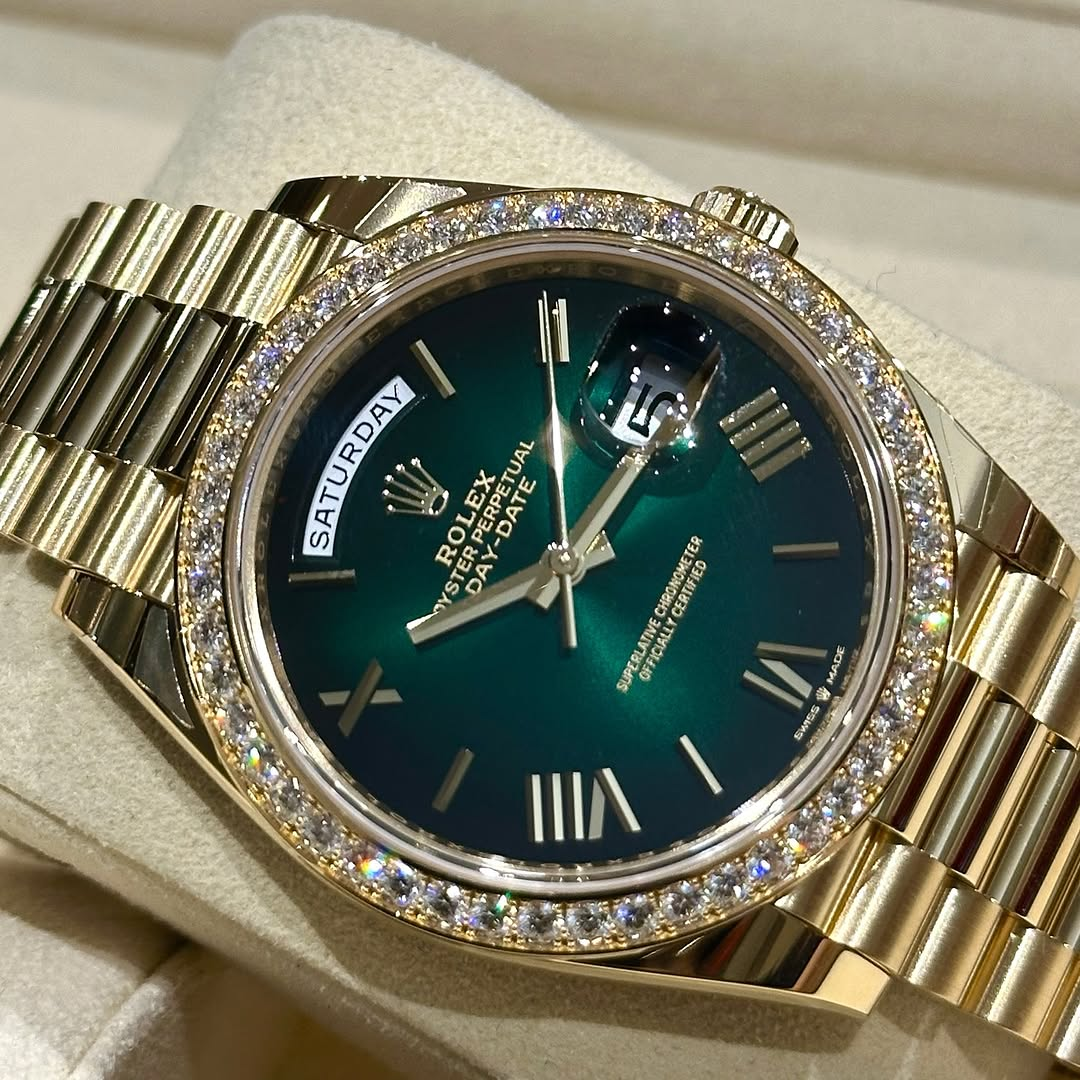 Rolex Day-Date 40mm | 18k yellow gold President bracelet | Green ombré dial Diamond bezel | Men’s Watch 228398TBR