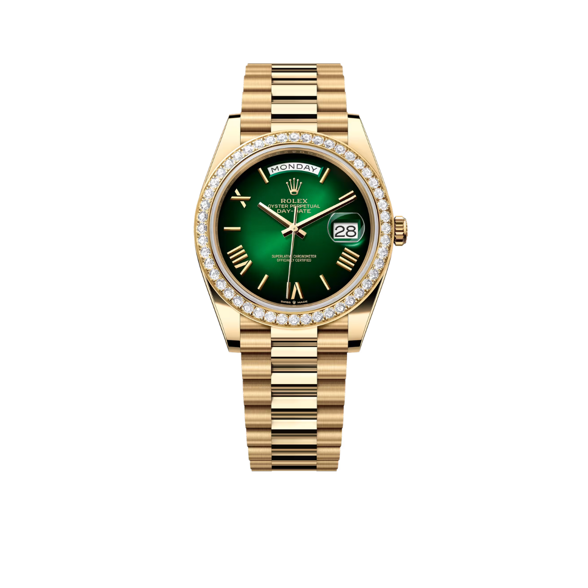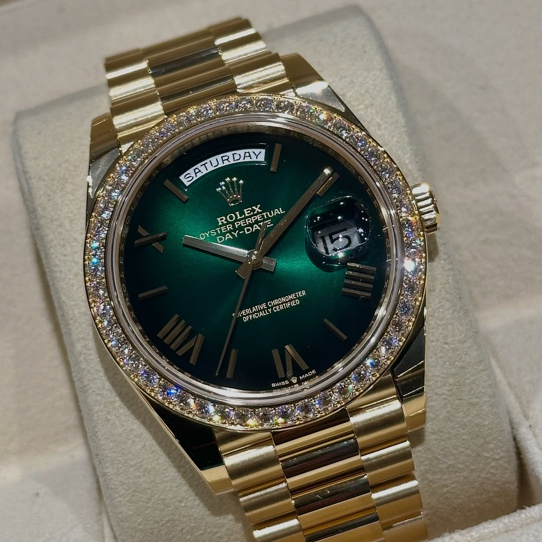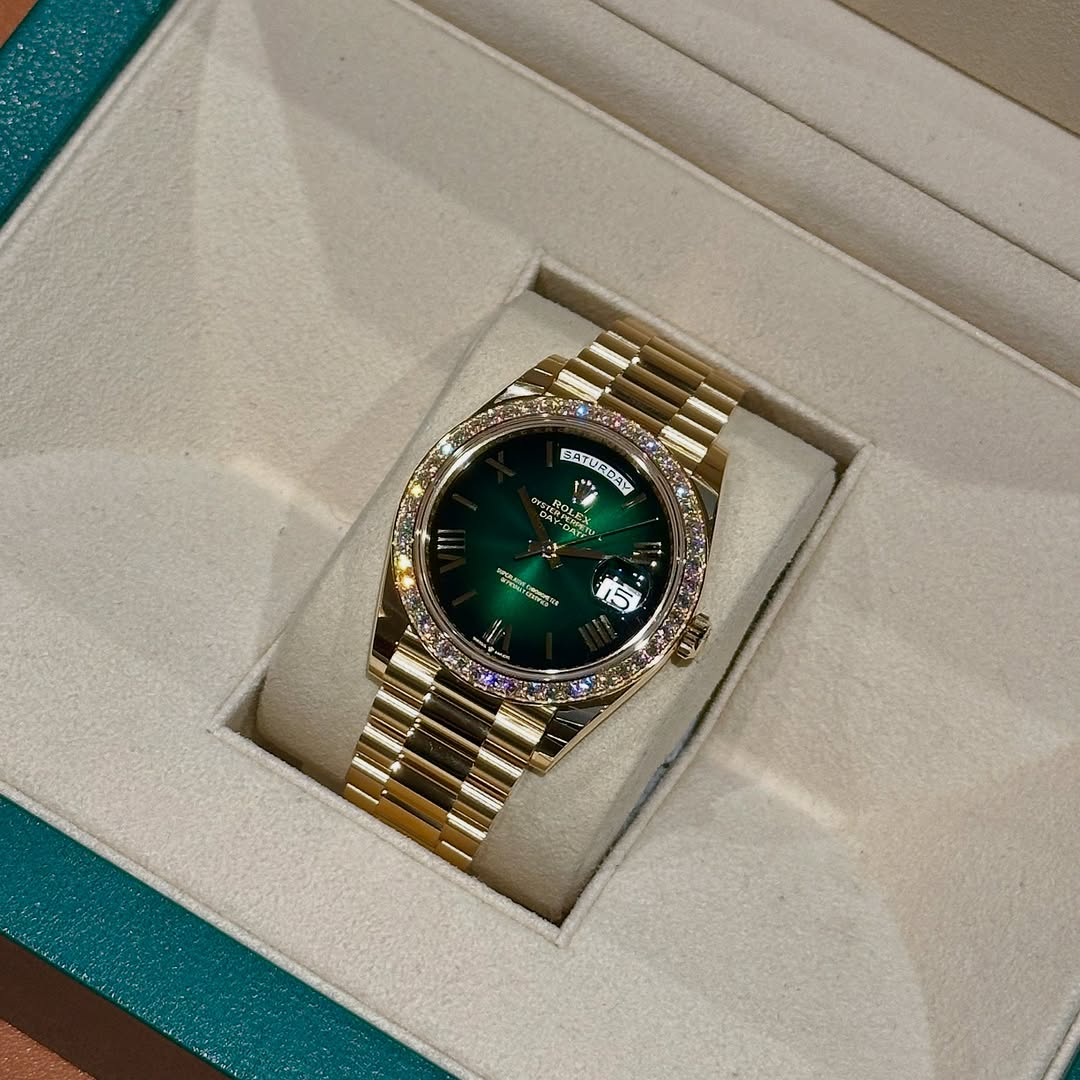 Rolex Day-Date 40mm | 18k yellow gold President bracelet | Green ombré dial Diamond bezel | Men’s Watch 228398TBR