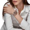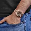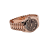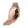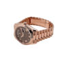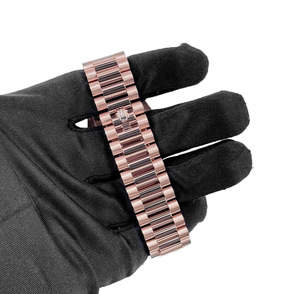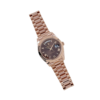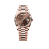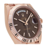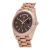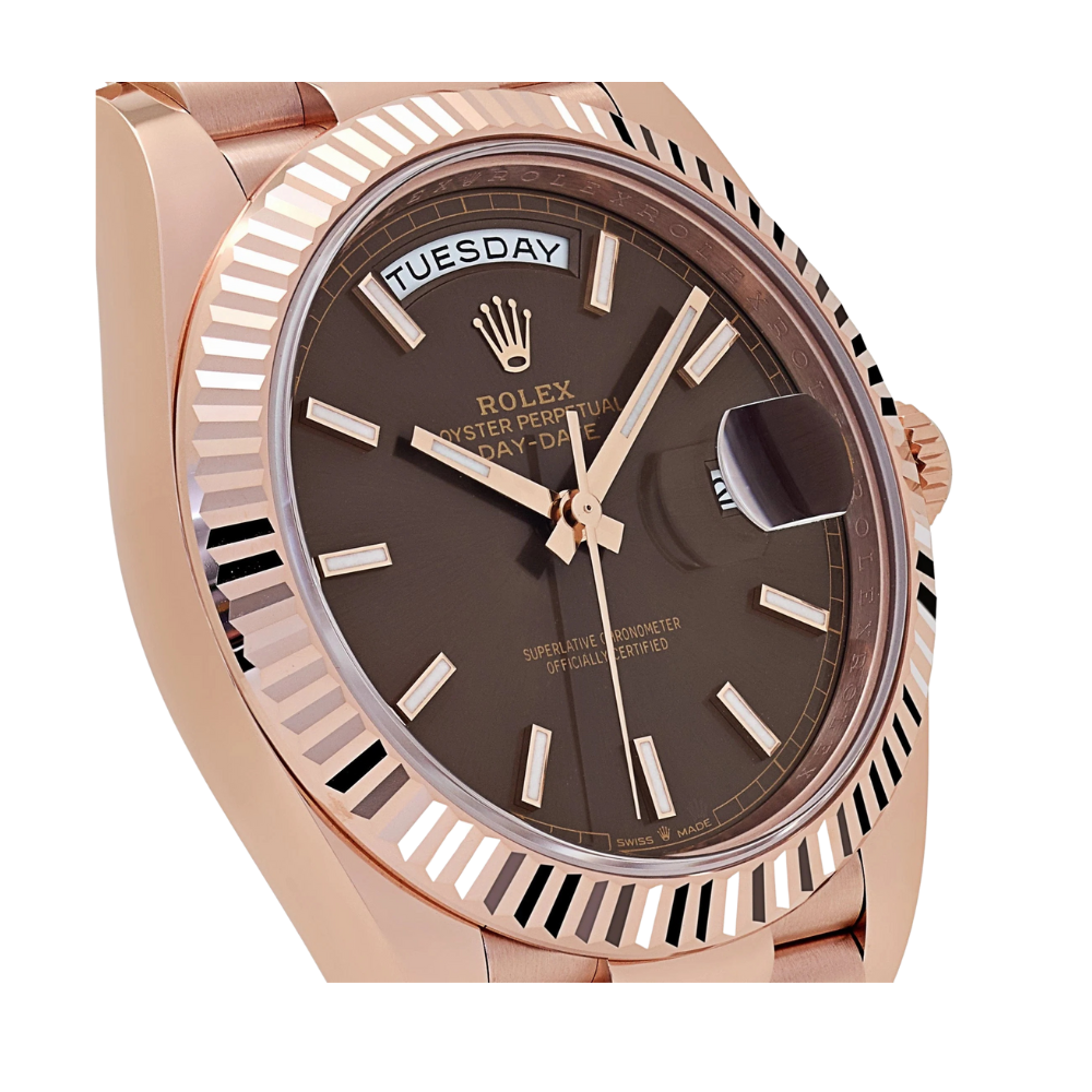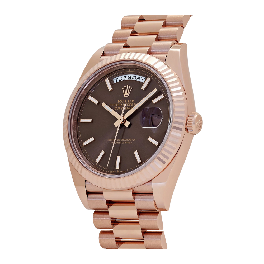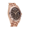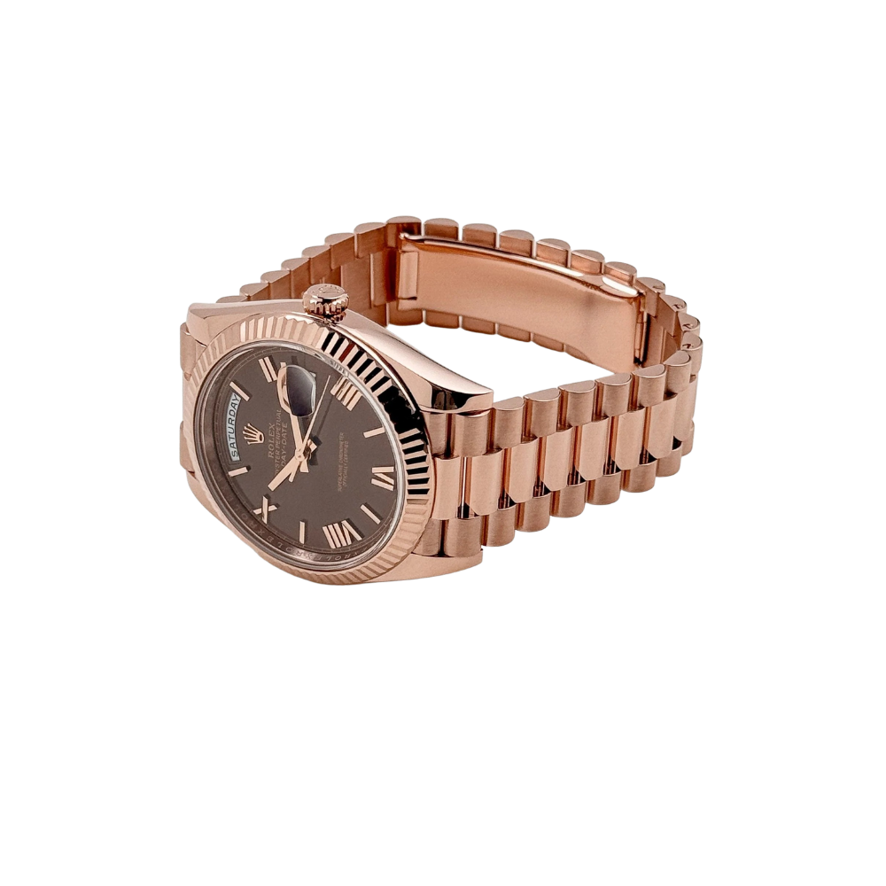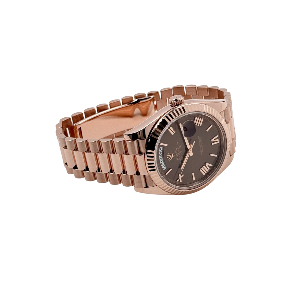 The Rolex Day-Date 228235 is a timeless masterpiece, crafted in 18k rose gold for a warm and sophisticated presence. Its 40mm case is complemented by a signature fluted bezel, adding a classic touch to the design. The rich chocolate brown dial serves as the focal point, featuring bold Roman numeral hour markers in matching rose gold, offering an elegant contrast and refined aesthetic.