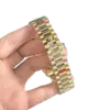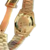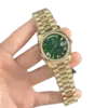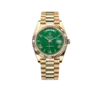 The Rolex Day-Date Green Roman Dial in Yellow Gold (reference 228238) is a stunning blend of classic elegance and bold design. This 40mm timepiece commands attention with its vibrant green dial, featuring bold Roman numeral hour markers that add a timeless touch. The signature fluted bezel and President bracelet enhance its luxurious aesthetic. Powered by the Rolex caliber 3255, this watch delivers precise timekeeping and robust performance. With the day display at 12 o’clock and date at 3 o’clock, it offers both practicality and refined style. This Day-Date 40 in yellow gold is a statement of prestige and sophistication, perfect for those who appreciate fine craftsmanship.