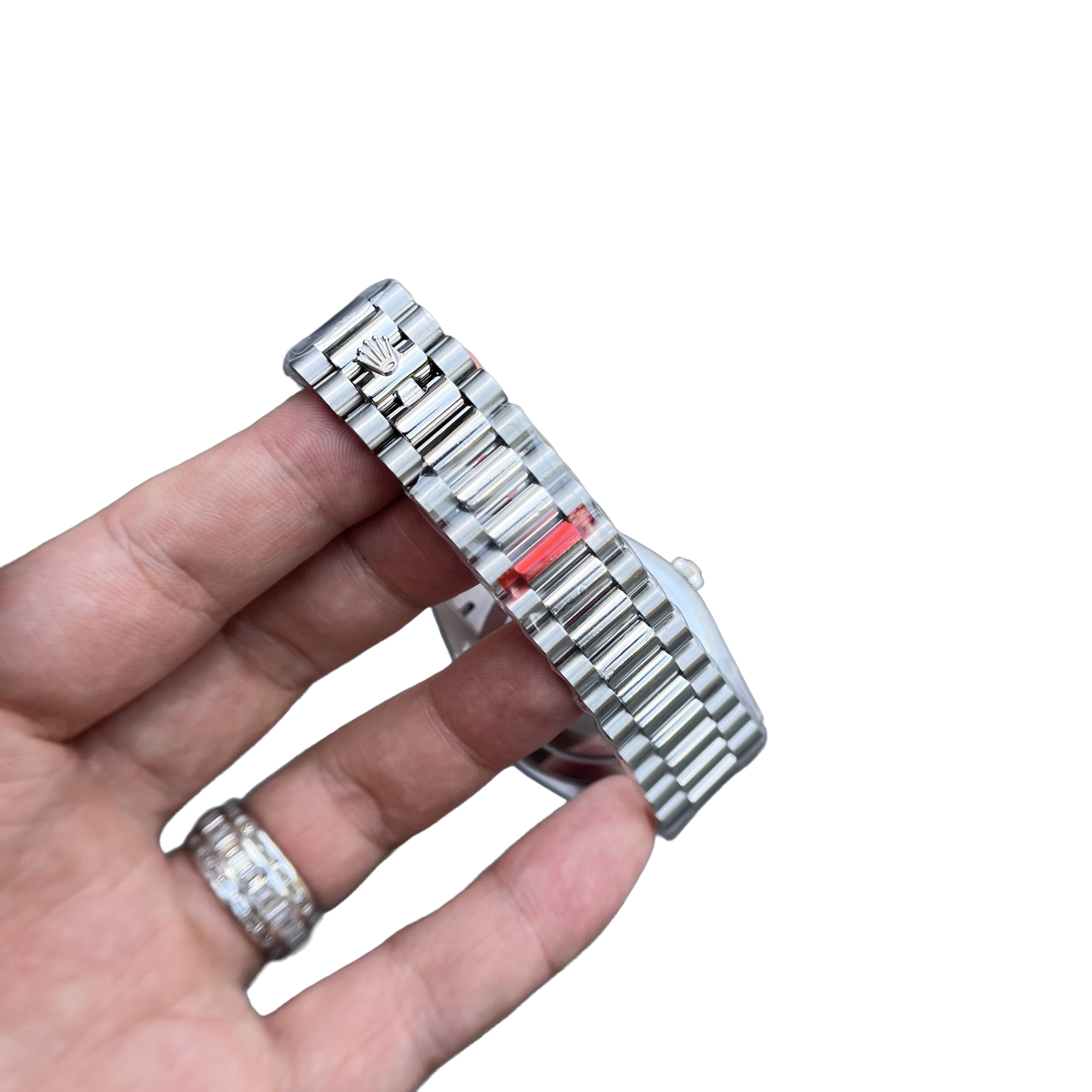 The Rolex Day-Date 40 228396TBR is the pinnacle of elegance and prestige. Its 40mm case crafted from 950 platinum pairs with Rolex’s signature ice-blue dial—an exclusive hue reserved for its most noble metal creations. The watch is strikingly elevated by a baguette-cut diamond bezel and matching diamond hour markers, adding refined brilliance. Fitted with the iconic President bracelet, this Day-Date is powered by the in-house caliber 3255, offering a 70-hour power reserve, instant day and date display, and Superlative Chronometer precision. A timeless embodiment of luxury, rarity, and horological excellence.