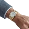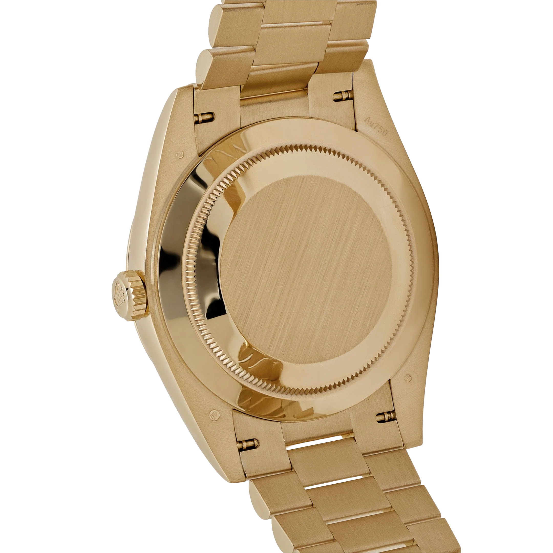 The Rolex DayDate 228238-0042 is made of 18ct. gold. It is a mixture of different 18 ct. gold metals including yellow, pink and white in even proportions of silver and copper. Made in an in-house laboratory by hand, each piece is meticulously inspected and shaped with the attention to detail Rolex is known for. The silver dial is fashioned with hour marks as Roman numerals that are fashioned for 18 ct. gold to prevent tarnish from developing. This watch is accuracy in motion and it is all latched together with 18 ct. gold links and clasps.