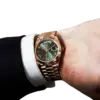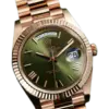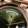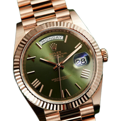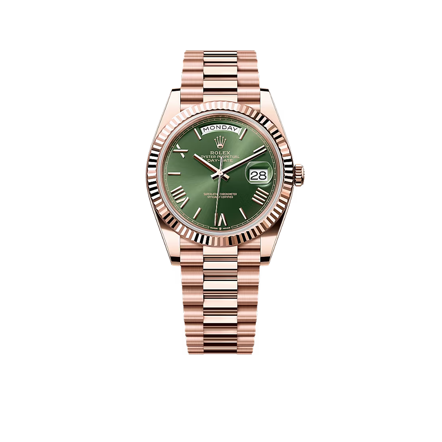 Rolex Day-Date 40 Ref. 228235 Green Olive is crafted entirely from 18k Everose gold, Rolex’s exclusive rose gold alloy known for its enduring color and luxury appeal.
