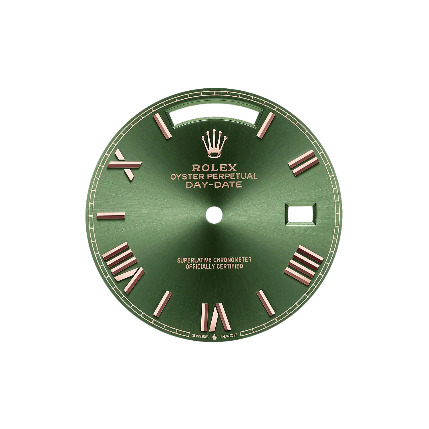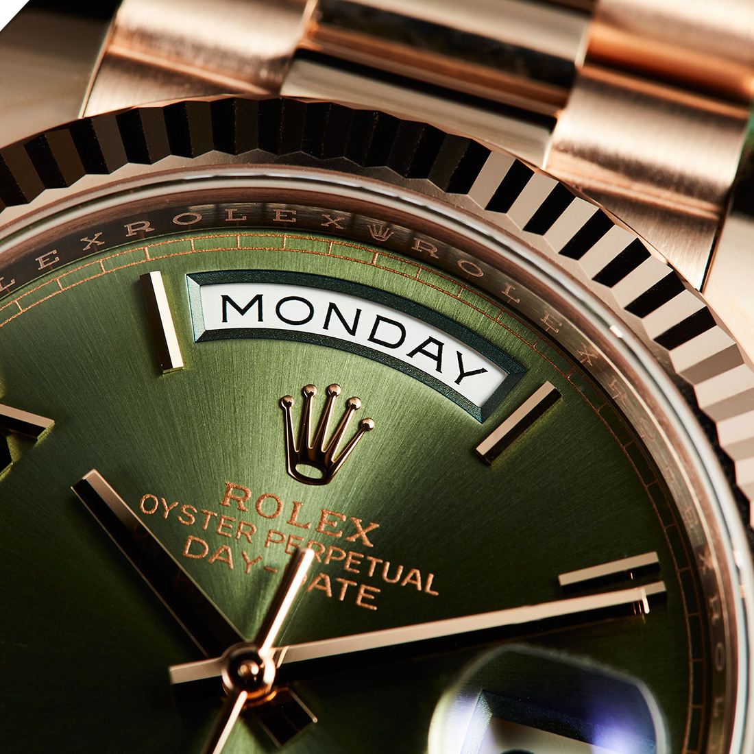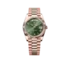 The distinctive olive green dial offers a warm, sophisticated tone that sets it apart from traditional Day-Date models.
