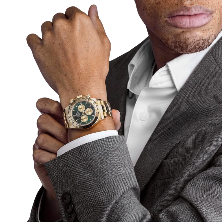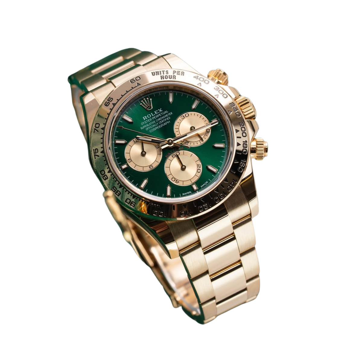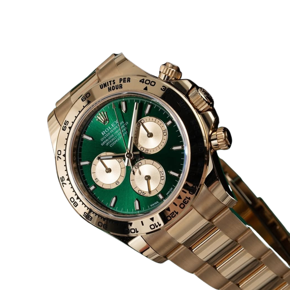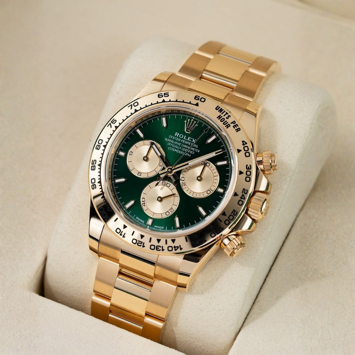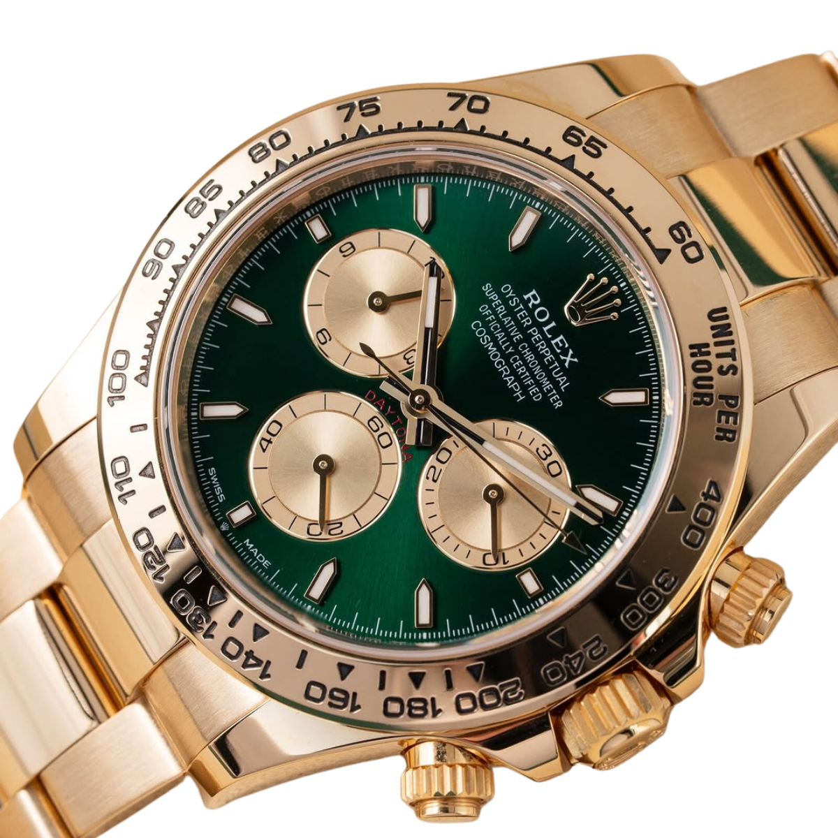 Paired with an Oyster bracelet in matching yellow gold and equipped with the Easylink comfort extension, the watch blends sporting functionality with elegant luxury. Revered by collectors and enthusiasts alike, the Daytona 126508 Green Dial remains a modern classic—now made even more compelling with Rolex’s latest technical advancements.
