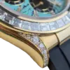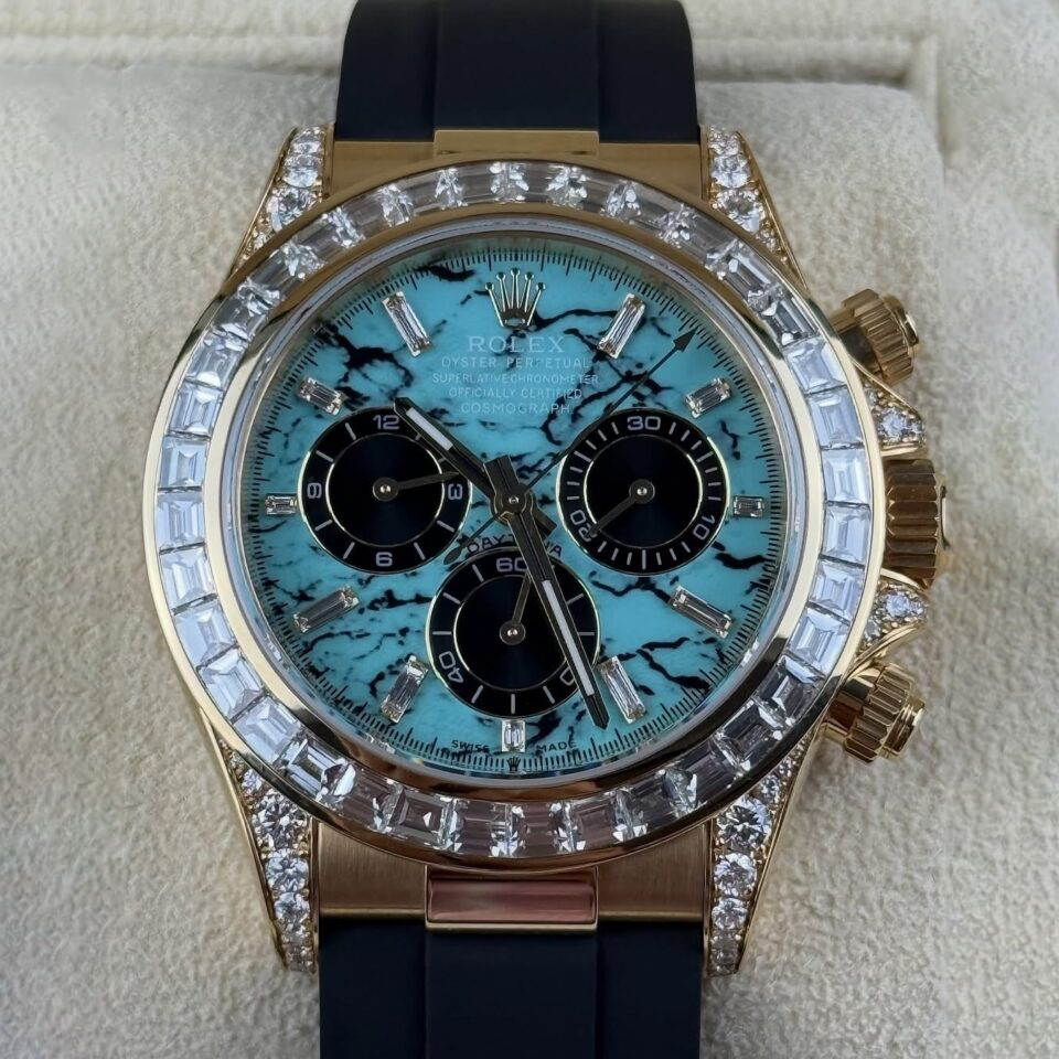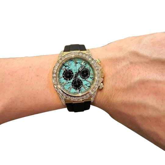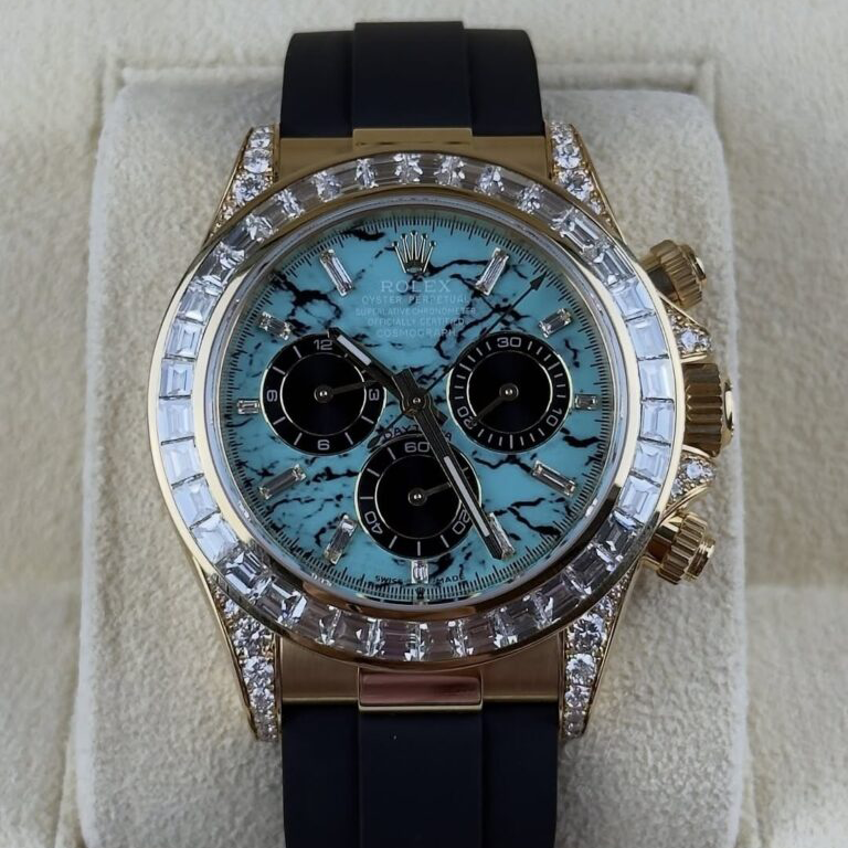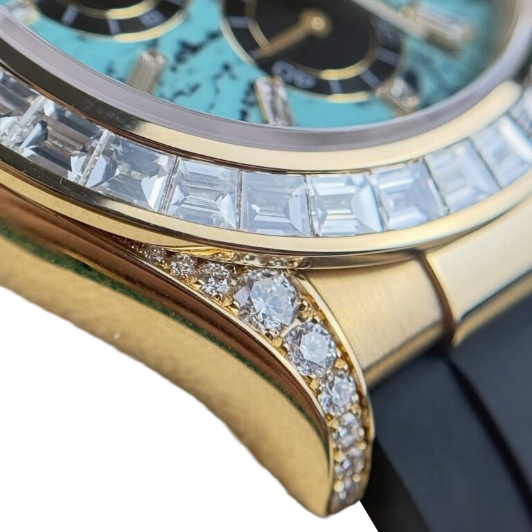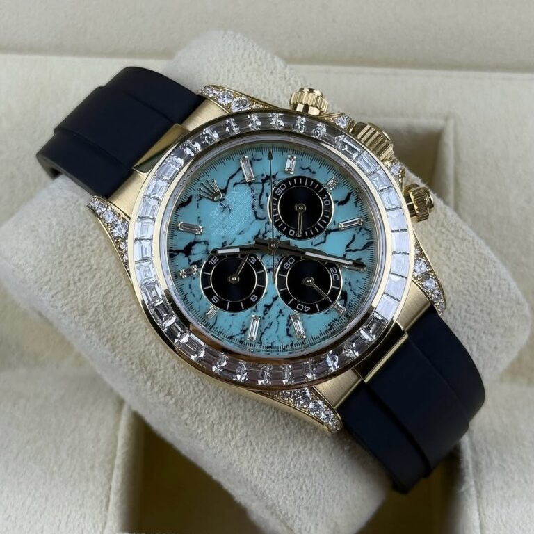 The Rolex Daytona 126538TBR in 18k yellow gold with a turquoise stone diamond dial is one of the most visually appealing modern Daytona references, first released in 2025. The vibrant turquoise stone dial with diamond hour markers delivers a bold move alongside the diamond bezel and accenting diamonds on the yellow gold case, creating a dynamic aesthetic that pushes the boundaries of Rolex’s traditional chronograph palette. Accented with black subdials, the layout retains the iconic Daytona balance while offering a fresh, fashion-forward twist.
