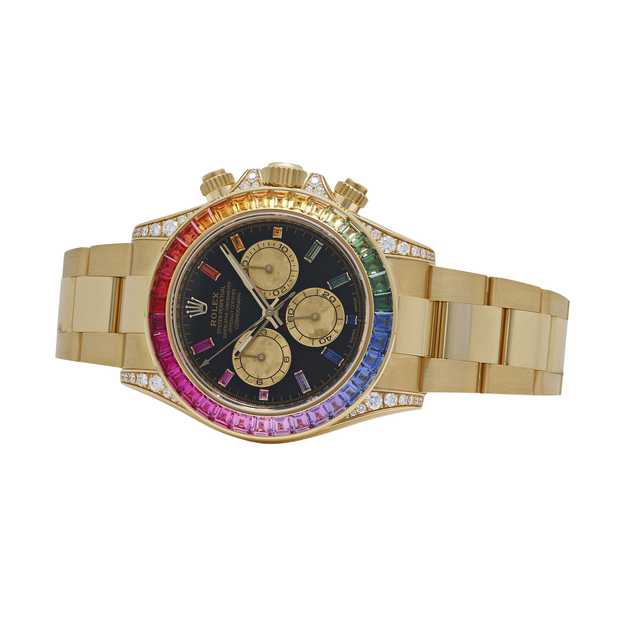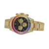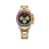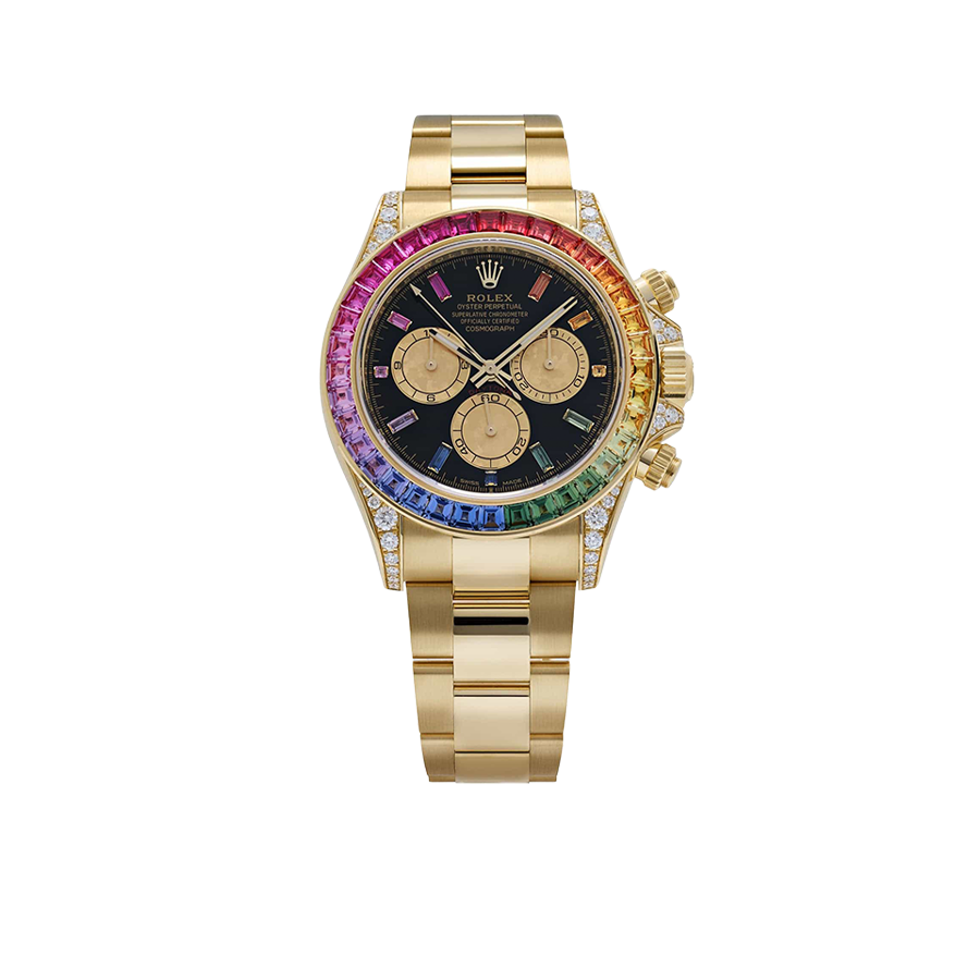 The Rolex Daytona 126598RBOW ‘Rainbow’ returns in 2025 with its most opulent execution yet. Crafted in yellow gold, this model is defined by its iconic rainbow sapphire bezel, which transitions seamlessly across a gradient of colors. The black lacquer dial is punctuated by sapphire hour markers in matching hues, while the lugs and crown guards are fully diamond-set, adding even more brilliance to the case.
