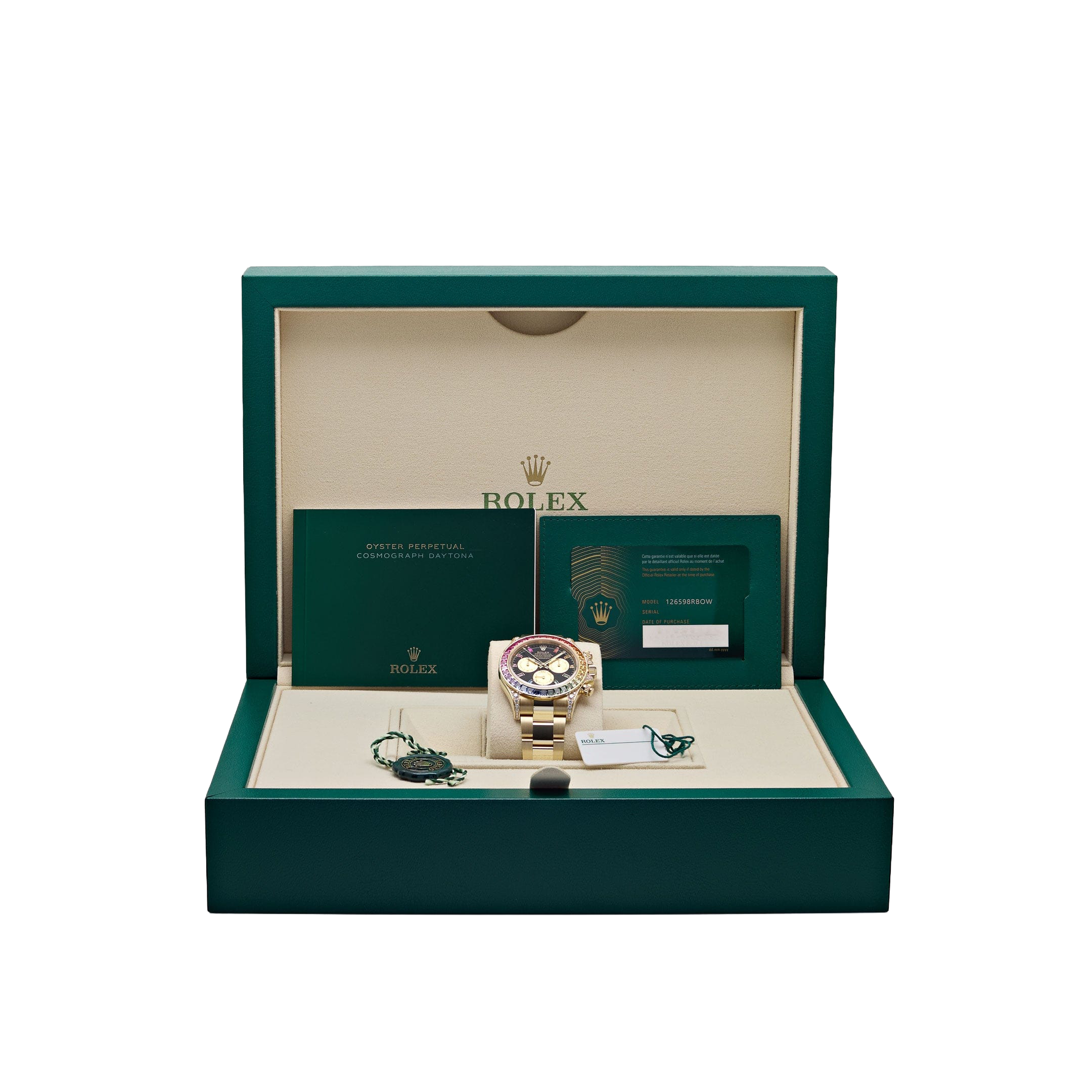 The signature Daytona tri-register layout remains, but it’s framed by a riot of gems, giving the piece its unmistakable identity. With demand consistently outstripping supply and production rumored to be extremely limited, the 126598RBOW cements its status as the ultimate expression of the Daytona line for collectors who want flamboyance with factory precision.