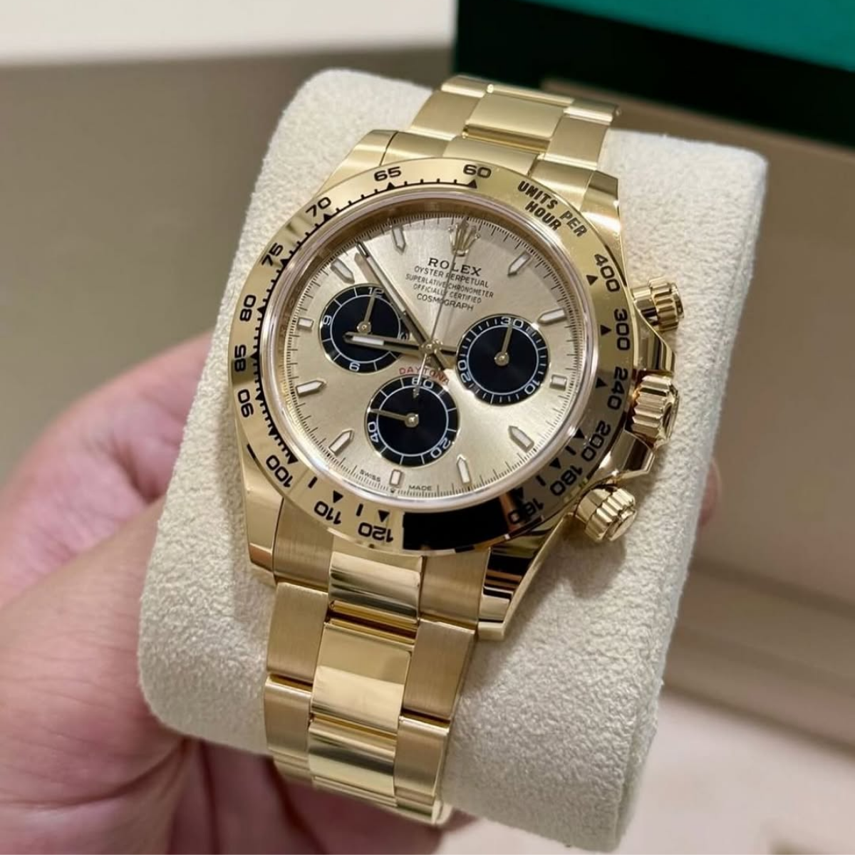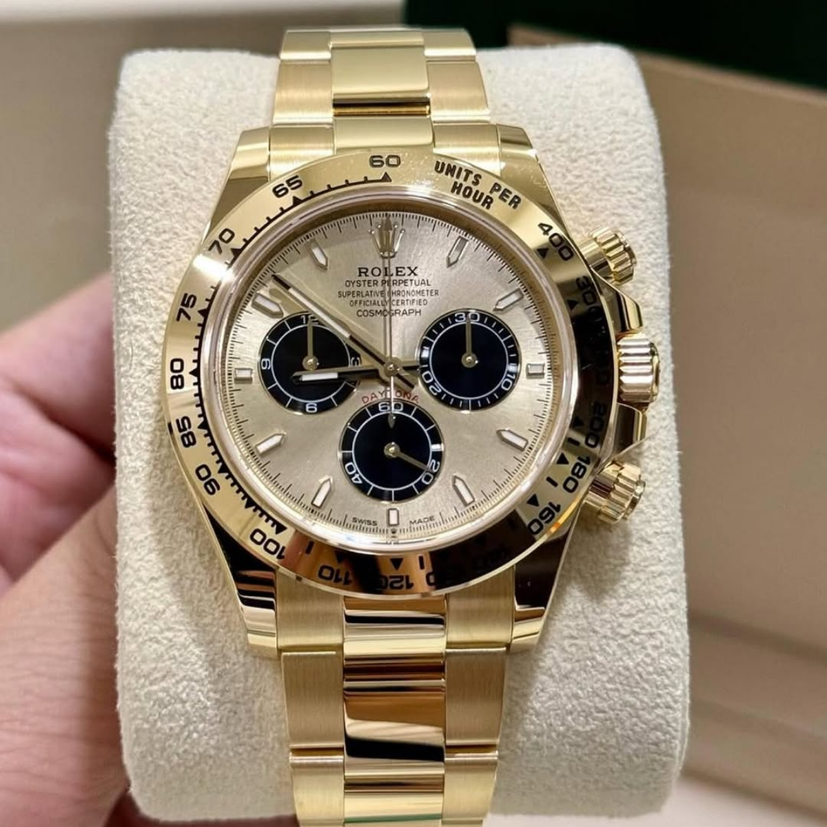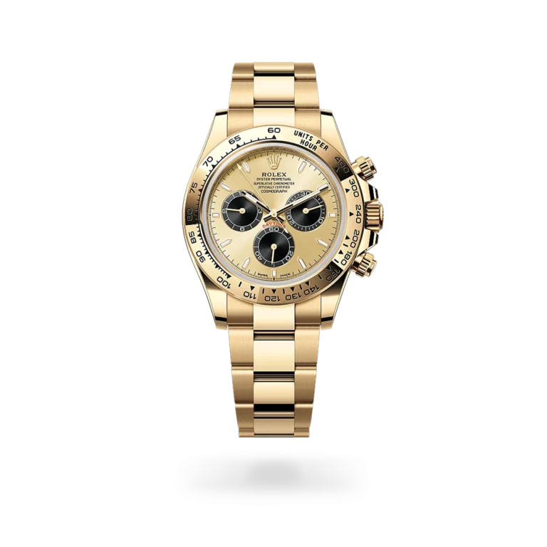 The Rolex Daytona 126508 features a champagne dial with black subdials. Its 40mm case and Oyster bracelet are crafted from 18K gold. Powered by the Caliber 4131 automatic chronograph movement, it offers a 72-hour power reserve and is water resistant to 100 meters.