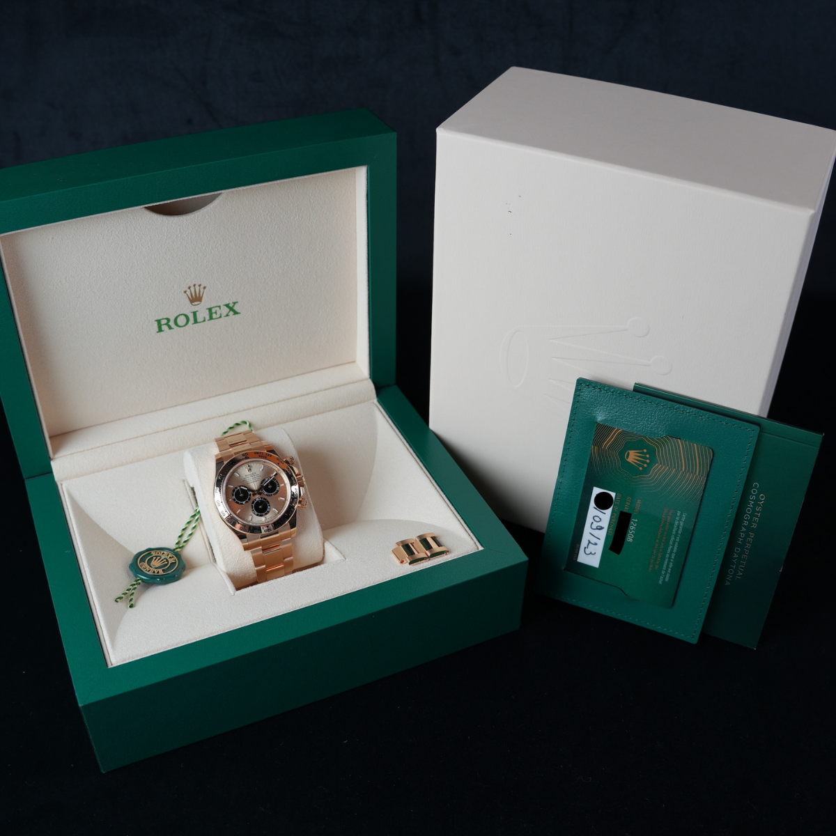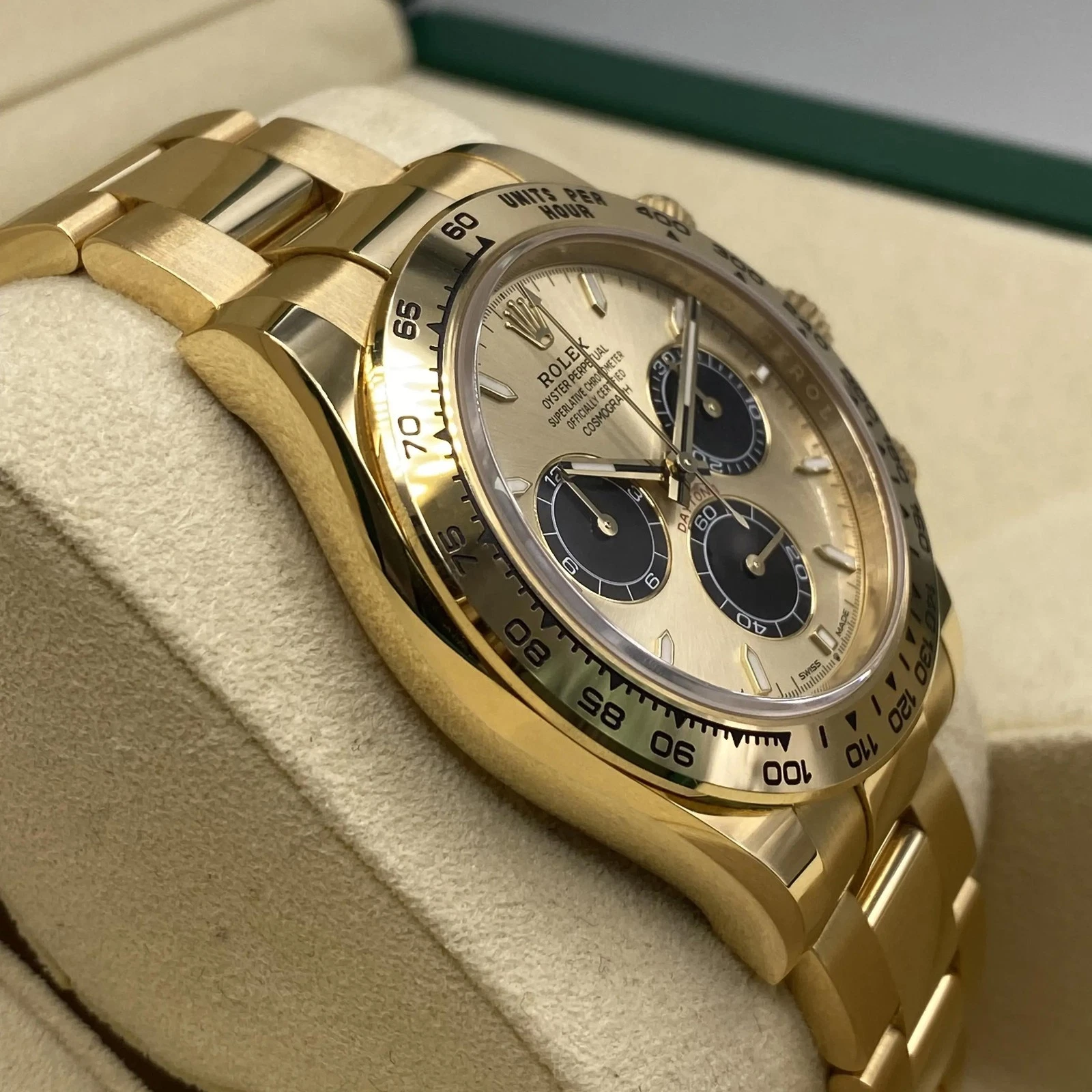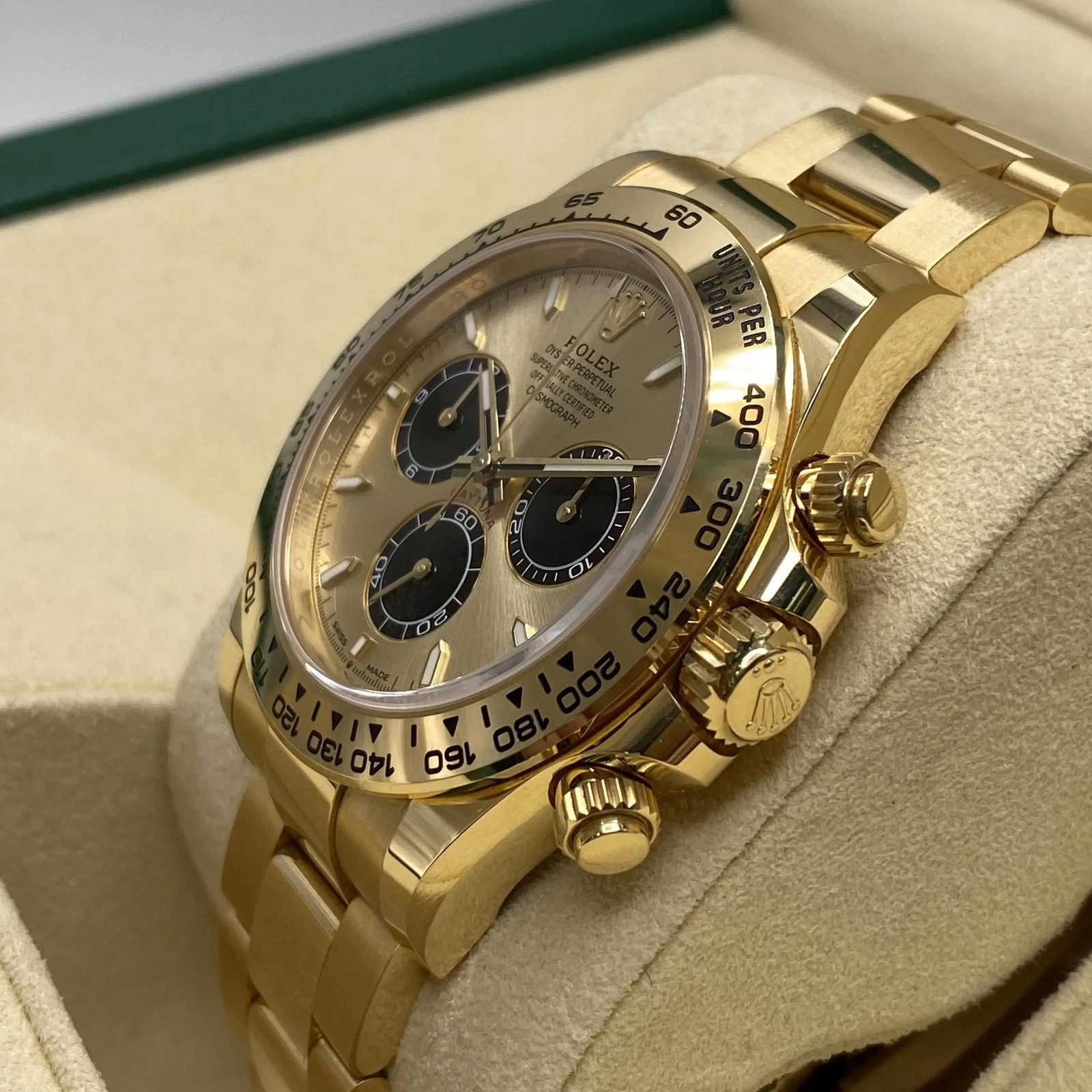 The Rolex Daytona 126508 features a champagne dial with black subdials. Its 40mm case and Oyster bracelet are crafted from 18K gold. Powered by the Caliber 4131 automatic chronograph movement, it offers a 72-hour power reserve and is water resistant to 100 meters.