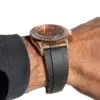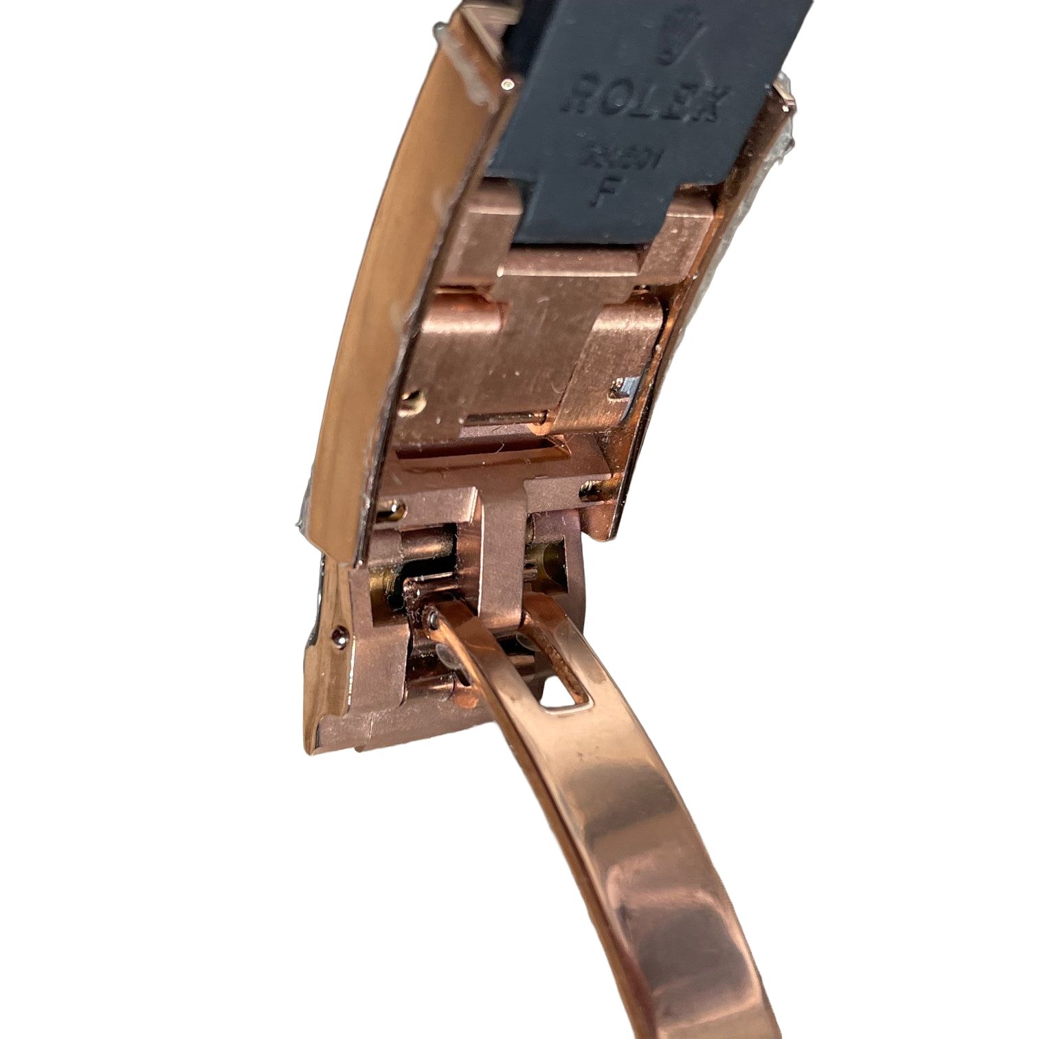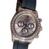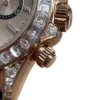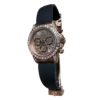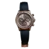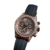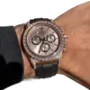 The watch features a striking Sundust dial enhanced by bright black chronograph counter rings and brilliant diamond hour markers, creating a sophisticated contrast that captures attention from every angle. Its diamond-set bezel further elevates the design, adding a refined sparkle that complements the warm tone of Everose gold