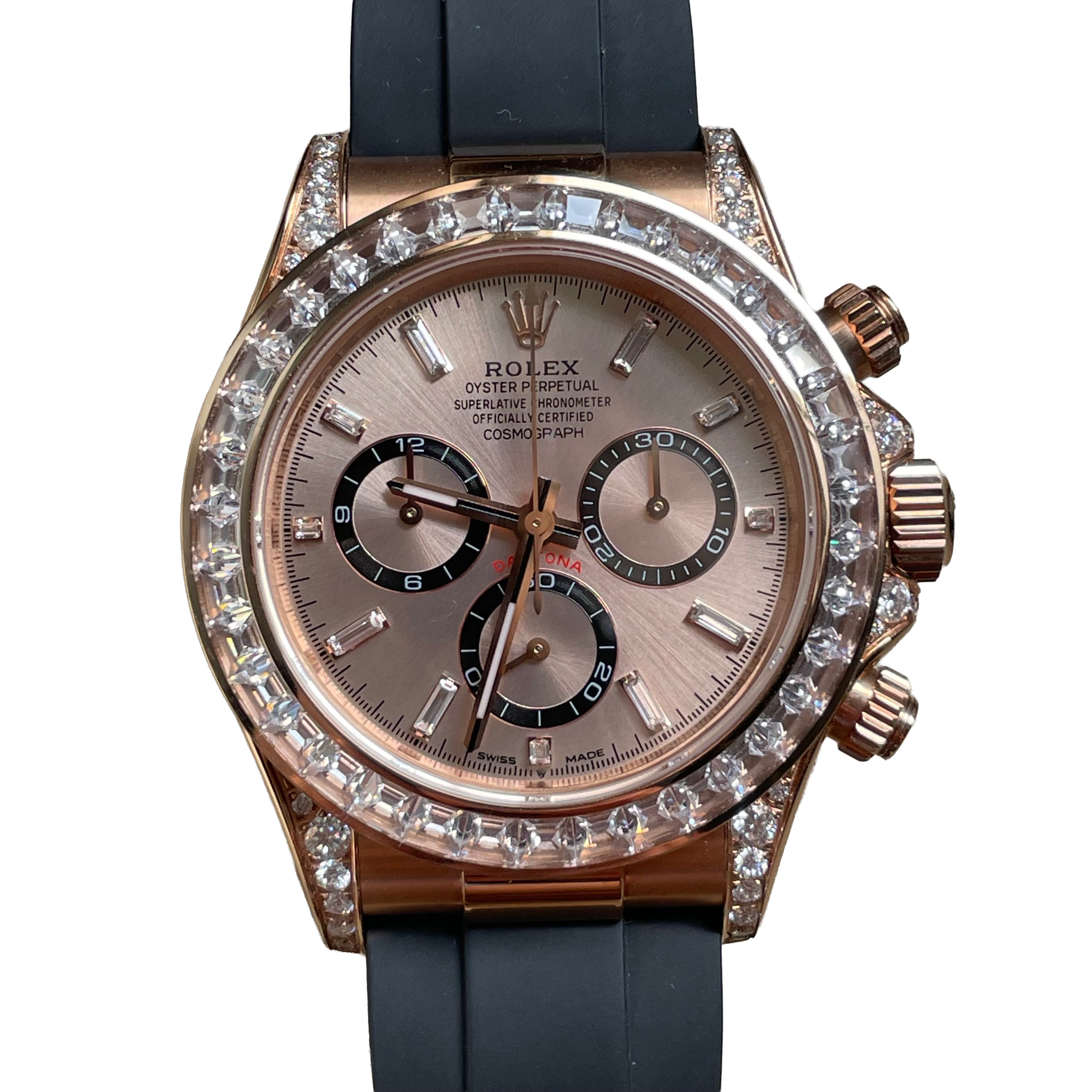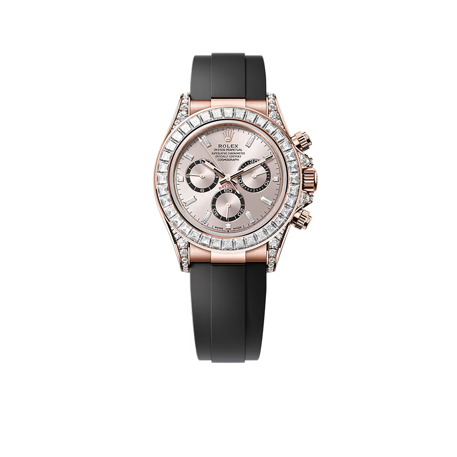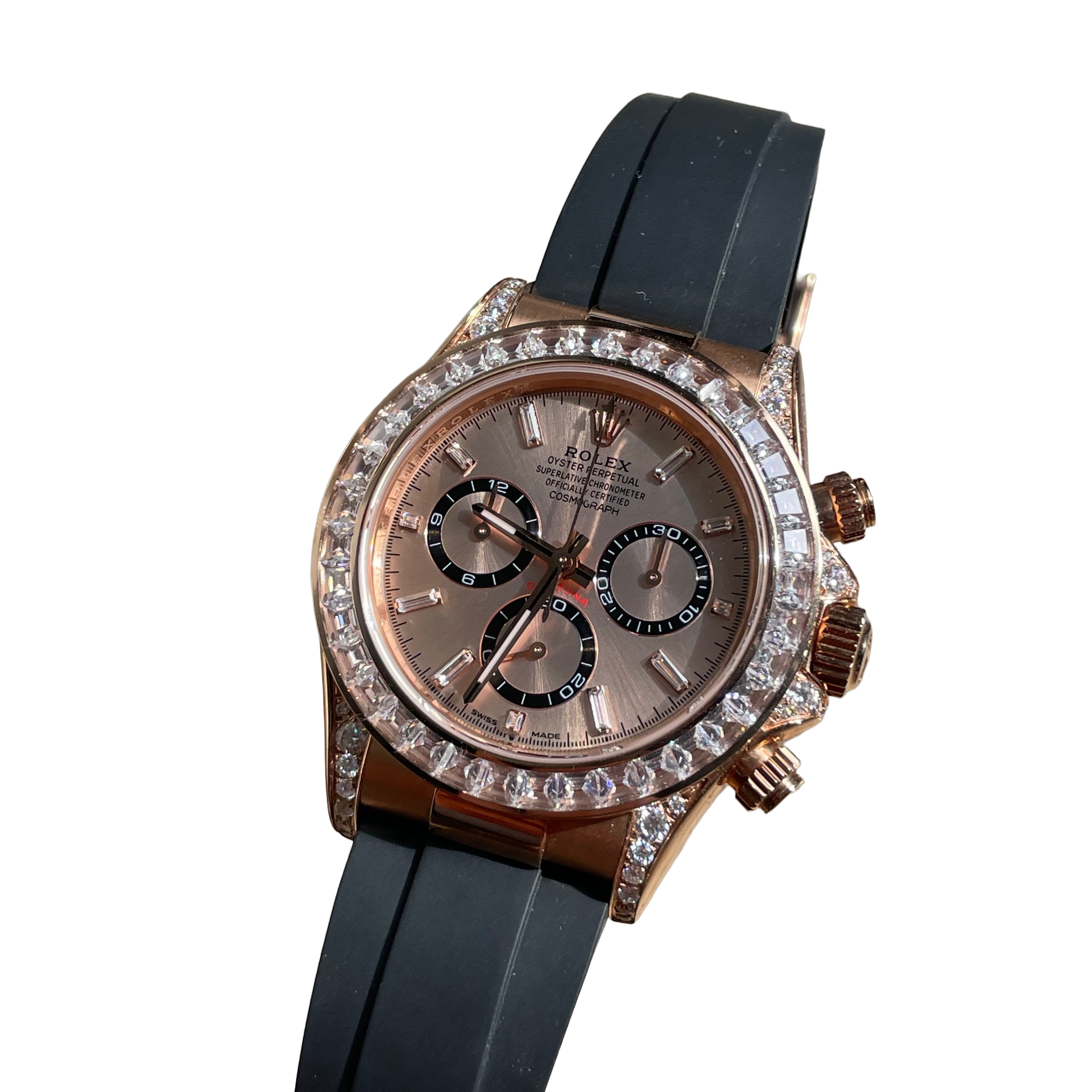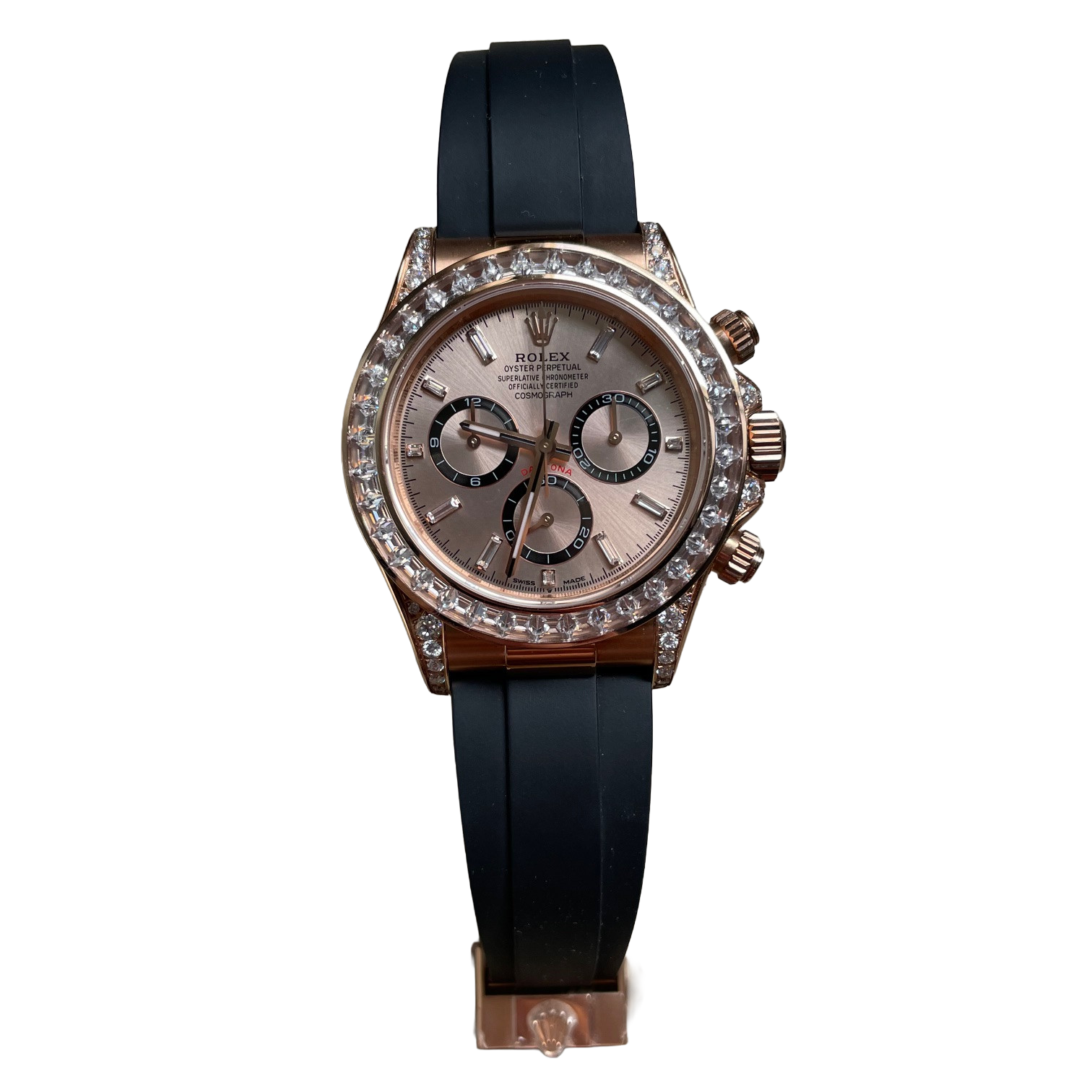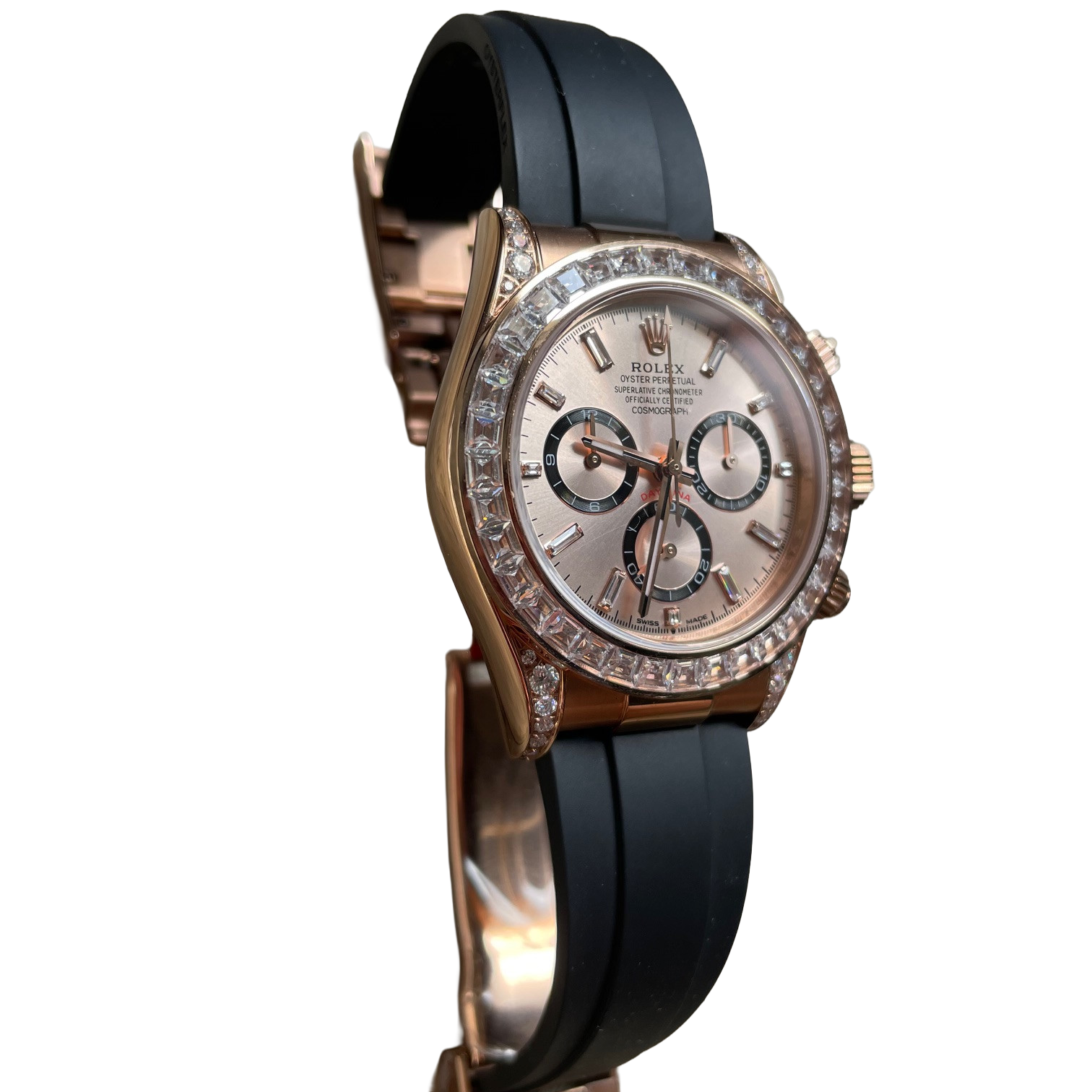 The Rolex Oyster Perpetual Cosmograph Daytona is a masterpiece of luxury watchmaking, combining high-performance chronograph functionality with exquisite diamond detailing. Crafted from 18k Everose gold, this 40 mm timepiece embodies Rolex’s signature elegance and durability, making it a perfect statement for those who appreciate both precision and prestige.