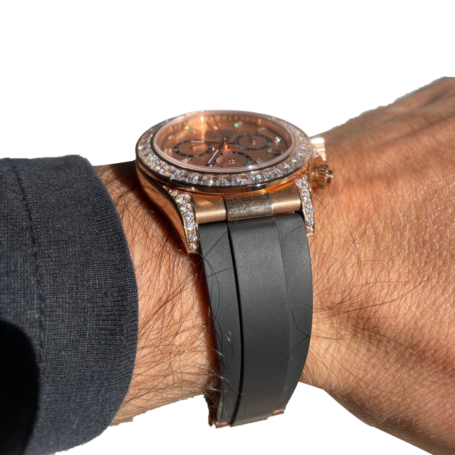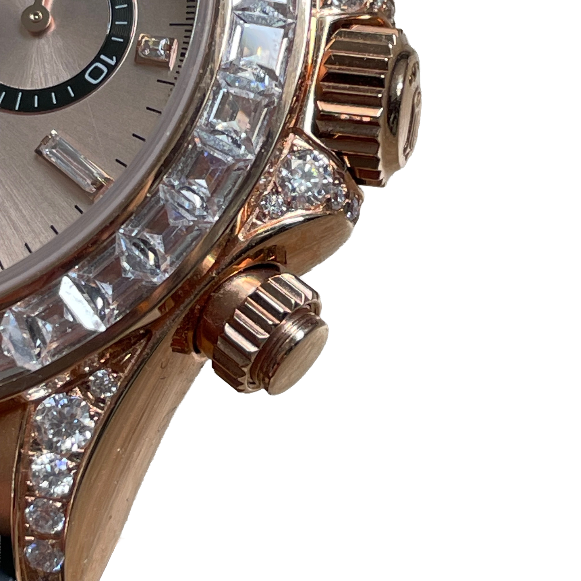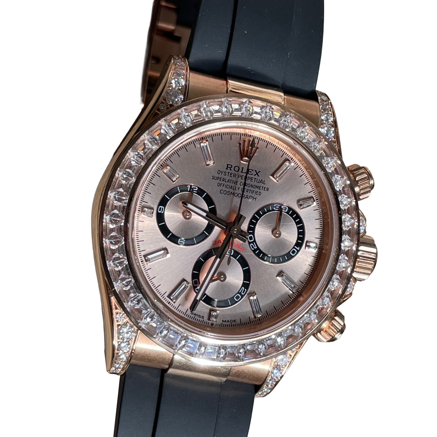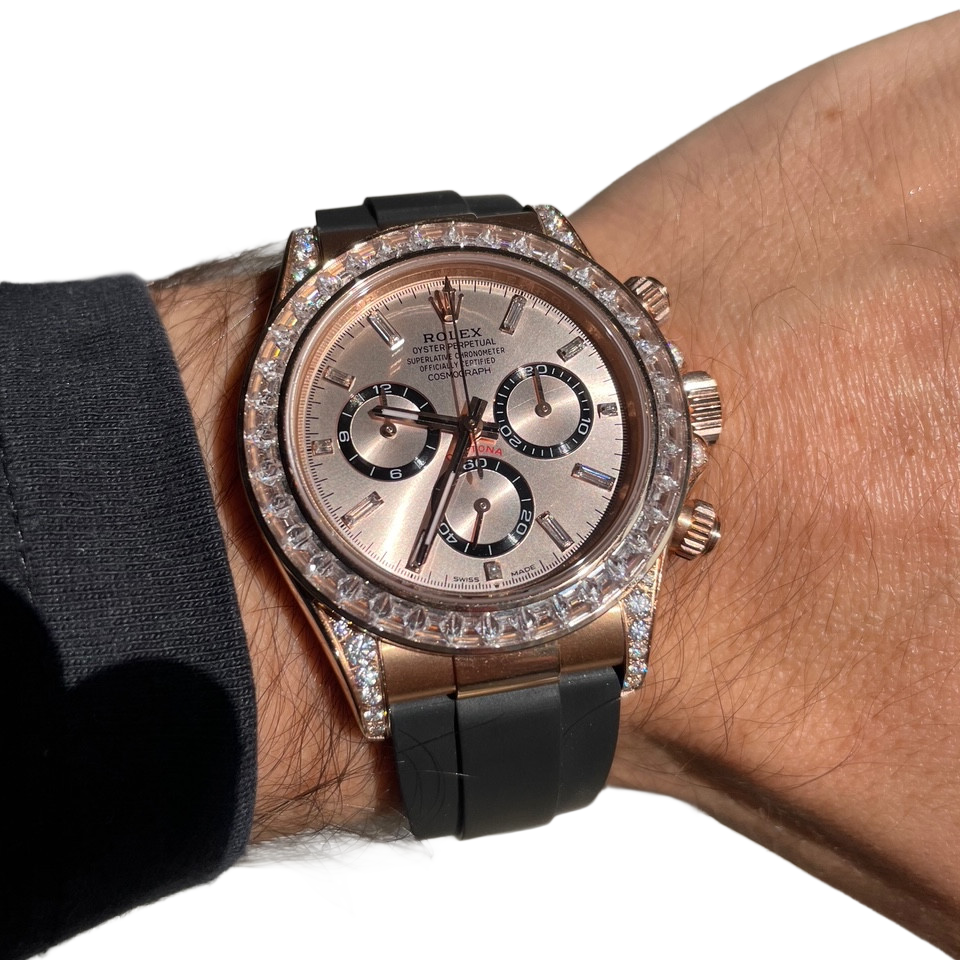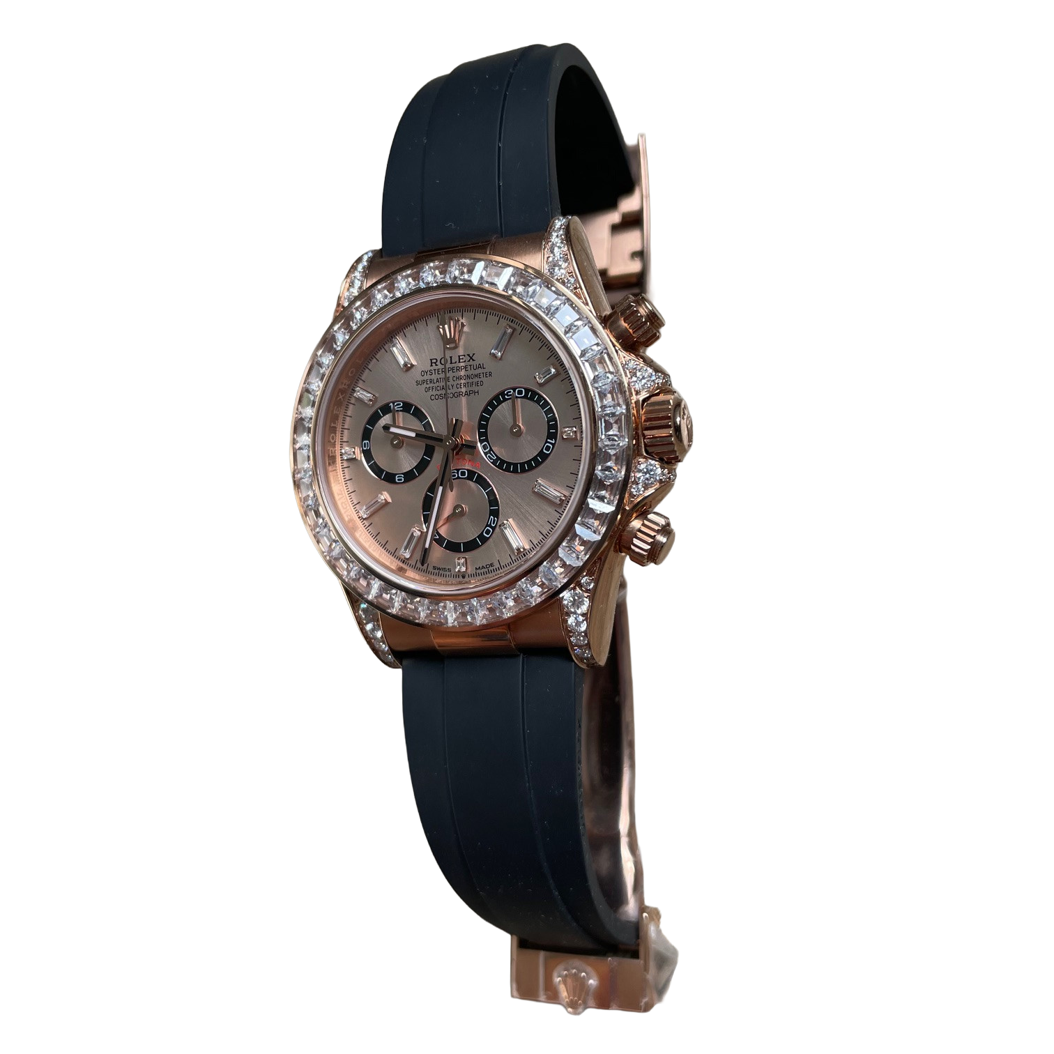 The Rolex Oyster Perpetual Cosmograph Daytona is a masterpiece of luxury watchmaking, combining high-performance chronograph functionality with exquisite diamond detailing. Crafted from 18k Everose gold, this 40 mm timepiece embodies Rolex’s signature elegance and durability, making it a perfect statement for those who appreciate both precision and prestige.