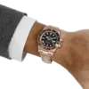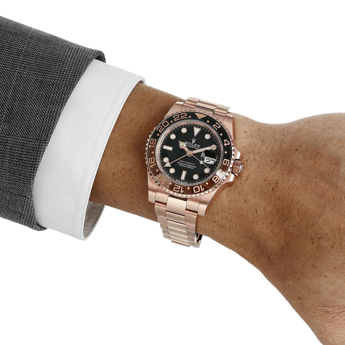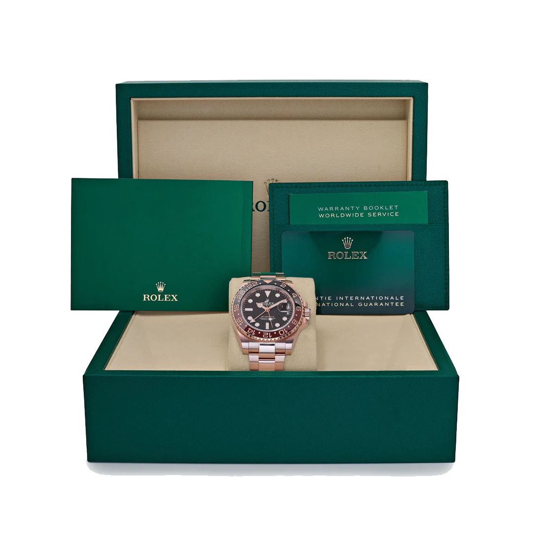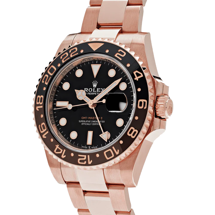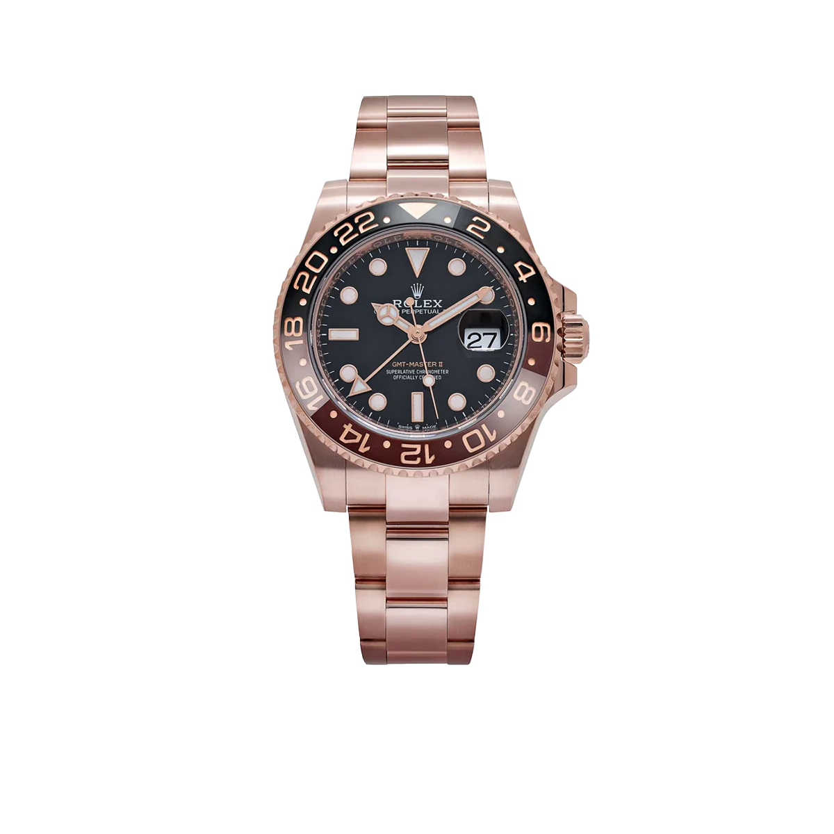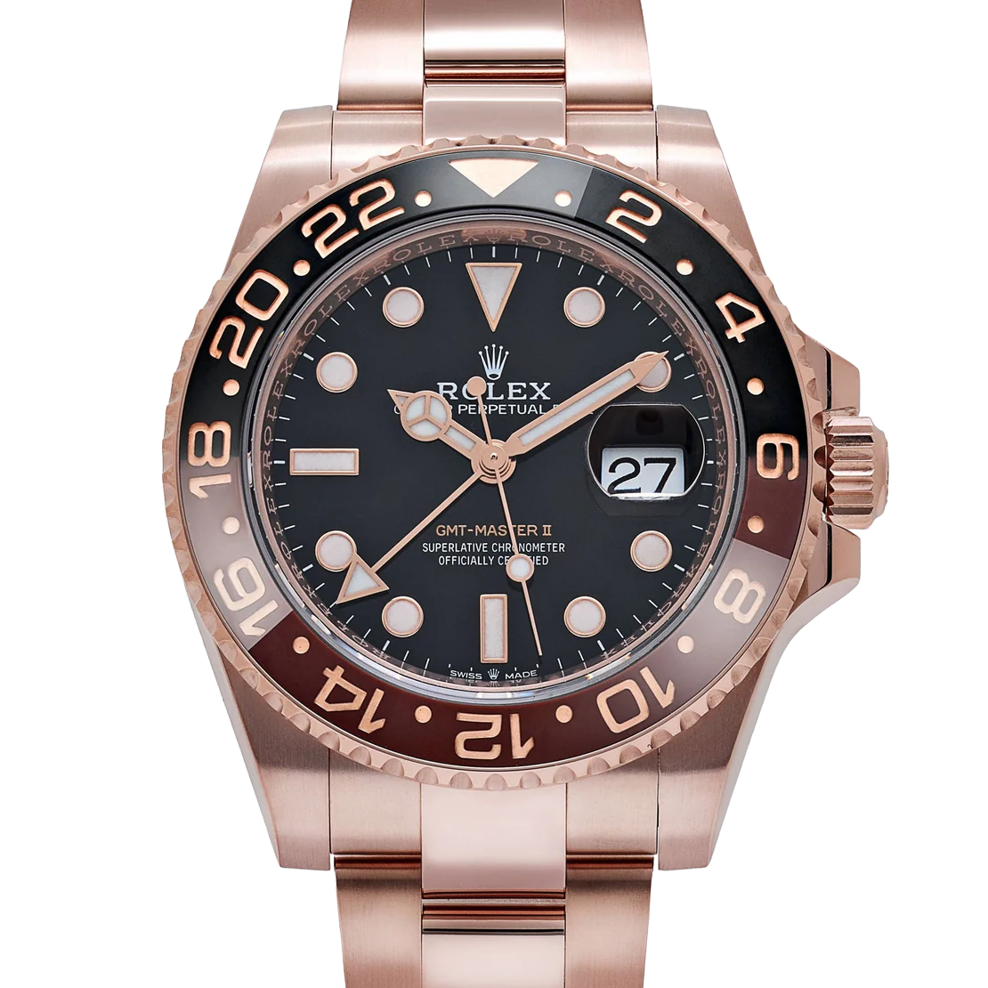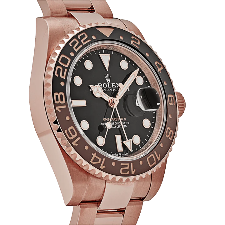 The Rolex GMT-Master II 126715CHNR, known as the “Root Beer,” is an exquisite reinterpretation of a legendary design, now presented in full 18k Everose gold. This modern iteration pays homage to the vintage two-tone Root Beer models while offering a completely elevated aesthetic with a black and brown Cerachrom bezel that exudes warmth and refinement. The Everose gold case and Oyster bracelet add a level of sophistication that sets this model apart from its steel and two-tone counterparts, making it a truly distinctive piece in the GMT-Master II lineup.