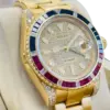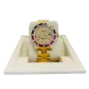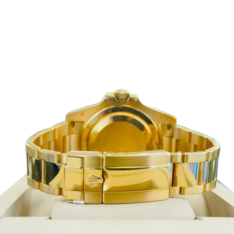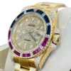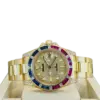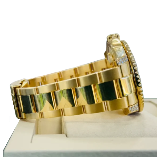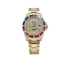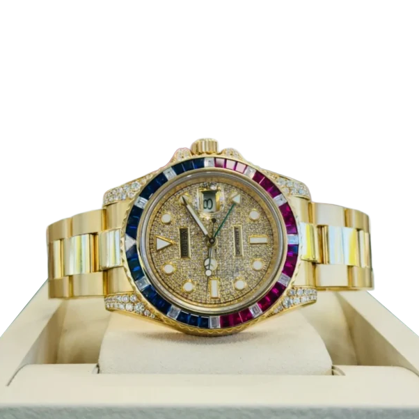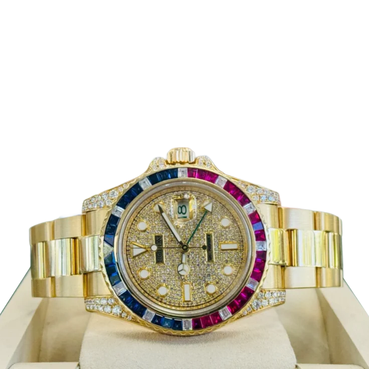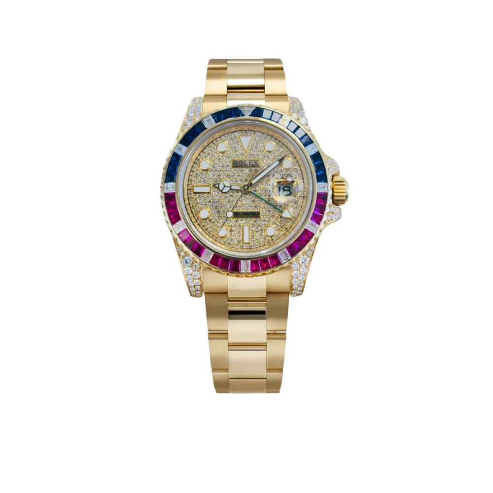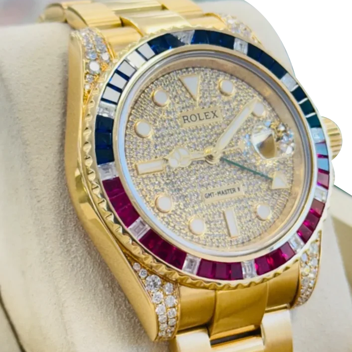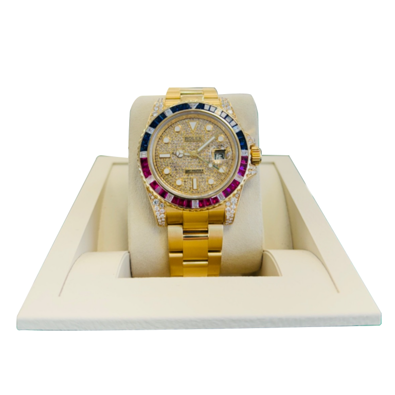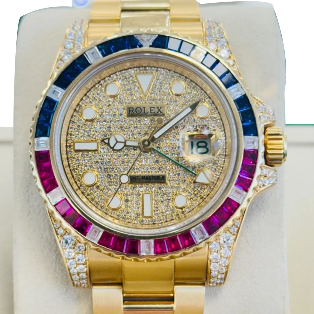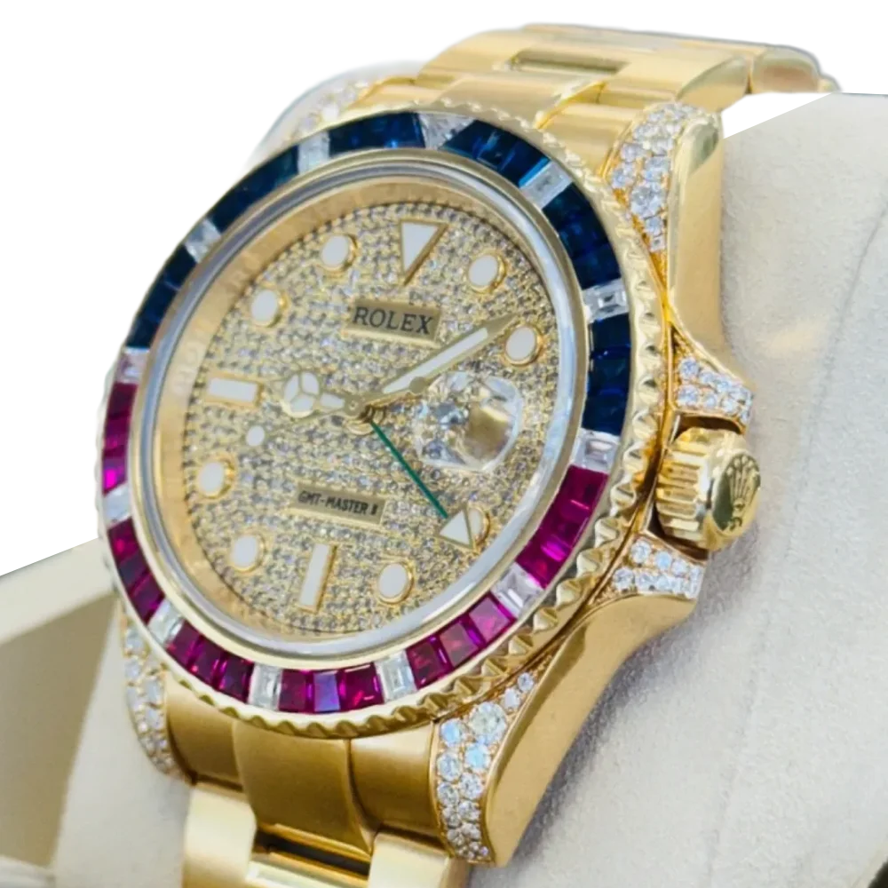 RL-GMT-YG-BK-DM-40-116718LNRolex GMT-Master II 40mm Yellow Gold Pepsi Bezel Diamond Set Watch 116718LN . This exceptional piece features a pavé diamond dial, diamond-set lugs and centre links, and a bidirectional bezel set with baguette-cut sapphires and rubies. A striking fusion of high jewellery and technical performance.