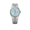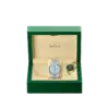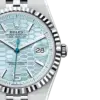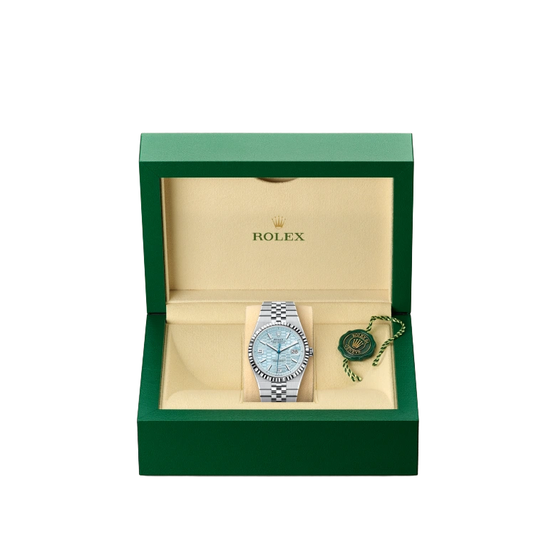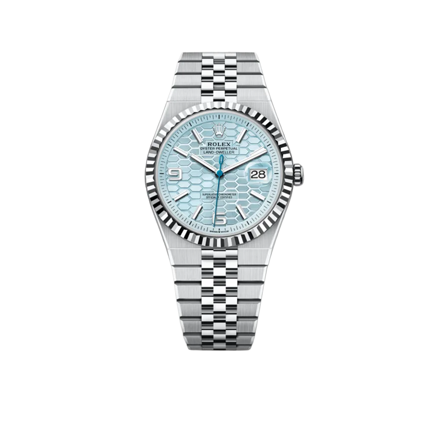 Its standout feature is the Ice Blue dial with a honeycomb relief pattern, a design language reserved exclusively for Rolex platinum models. White gold hands and hour markers coated with Chromalight ensure exceptional legibility and a clean, crisp look even in low light.