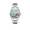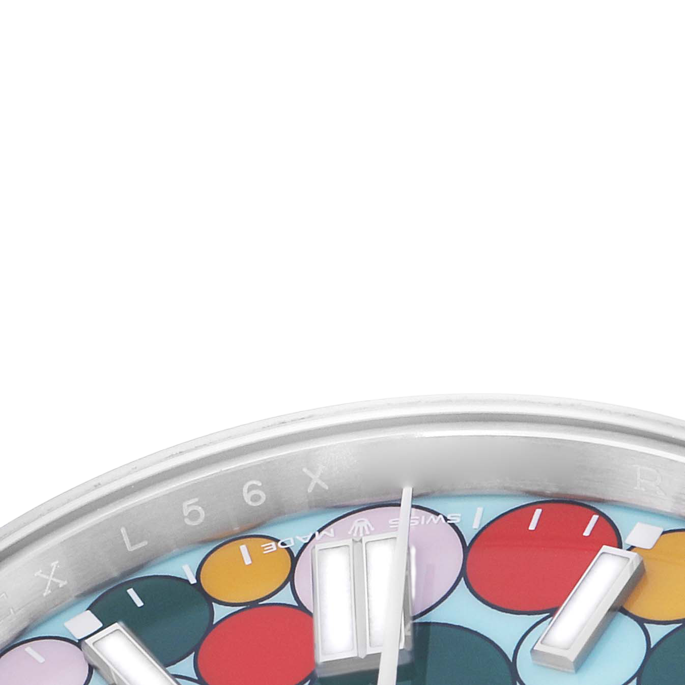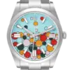 Dial: Turquoise blue celebration motif dial with steel luminescent baton hour markers and hands. Outer stick minute markers.