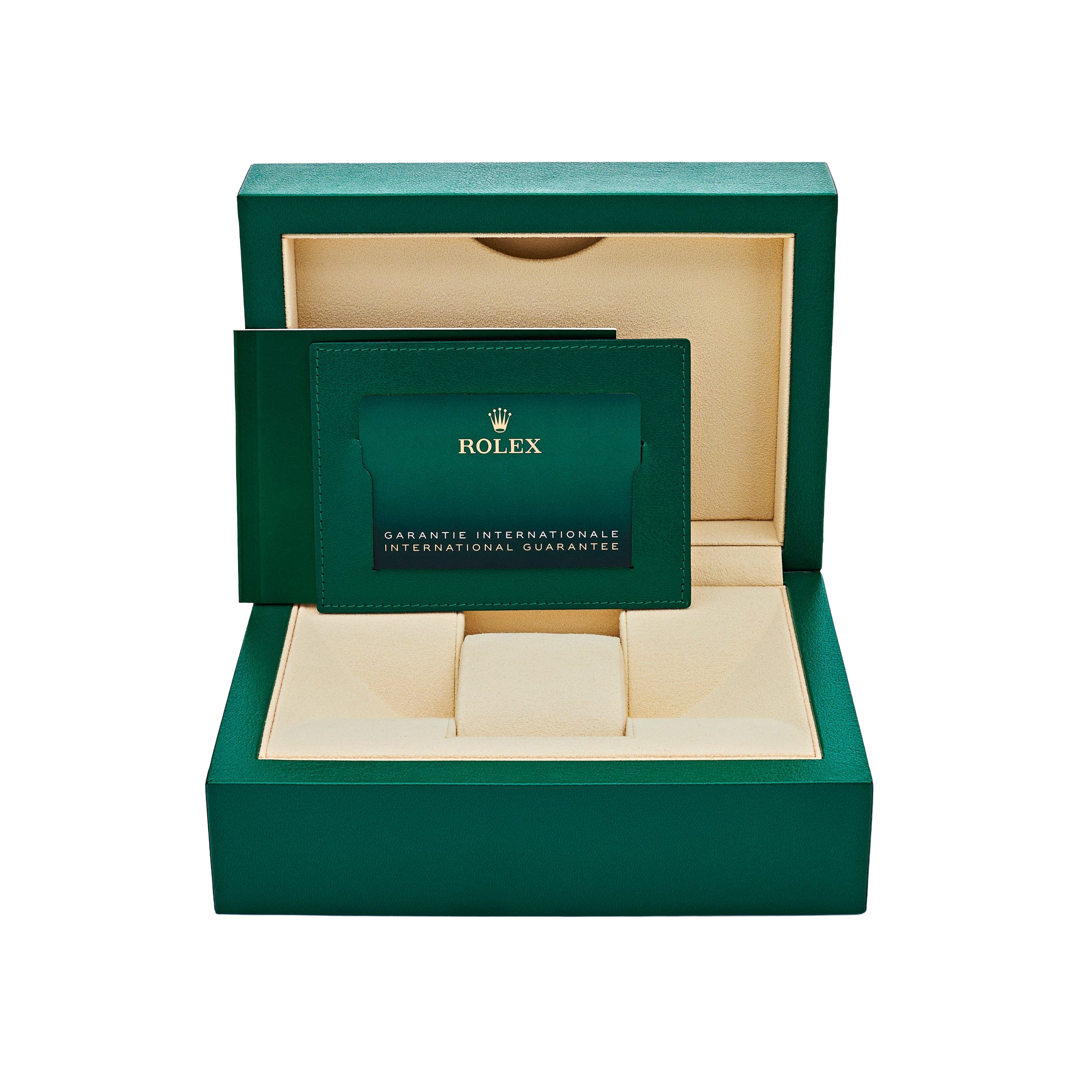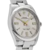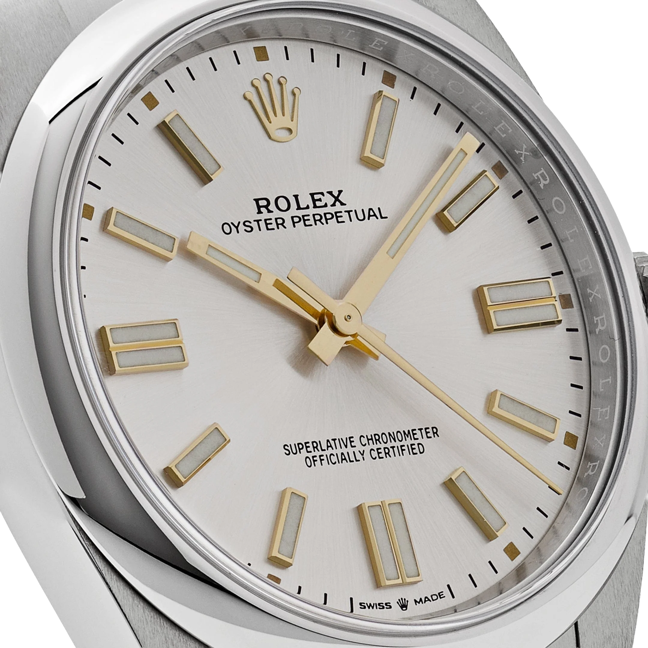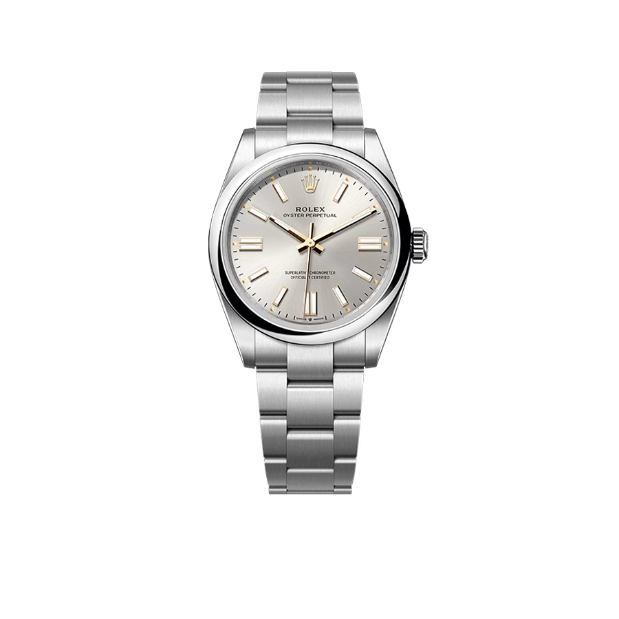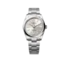The silver sunburst dial offers a minimalist and refined look, with Chromalight-filled baton hour markers and hands ensuring optimal legibility in any lighting. The absence of a date window maintains the dial’s symmetry, staying true to the Oyster Perpetual’s pure design philosophy.