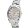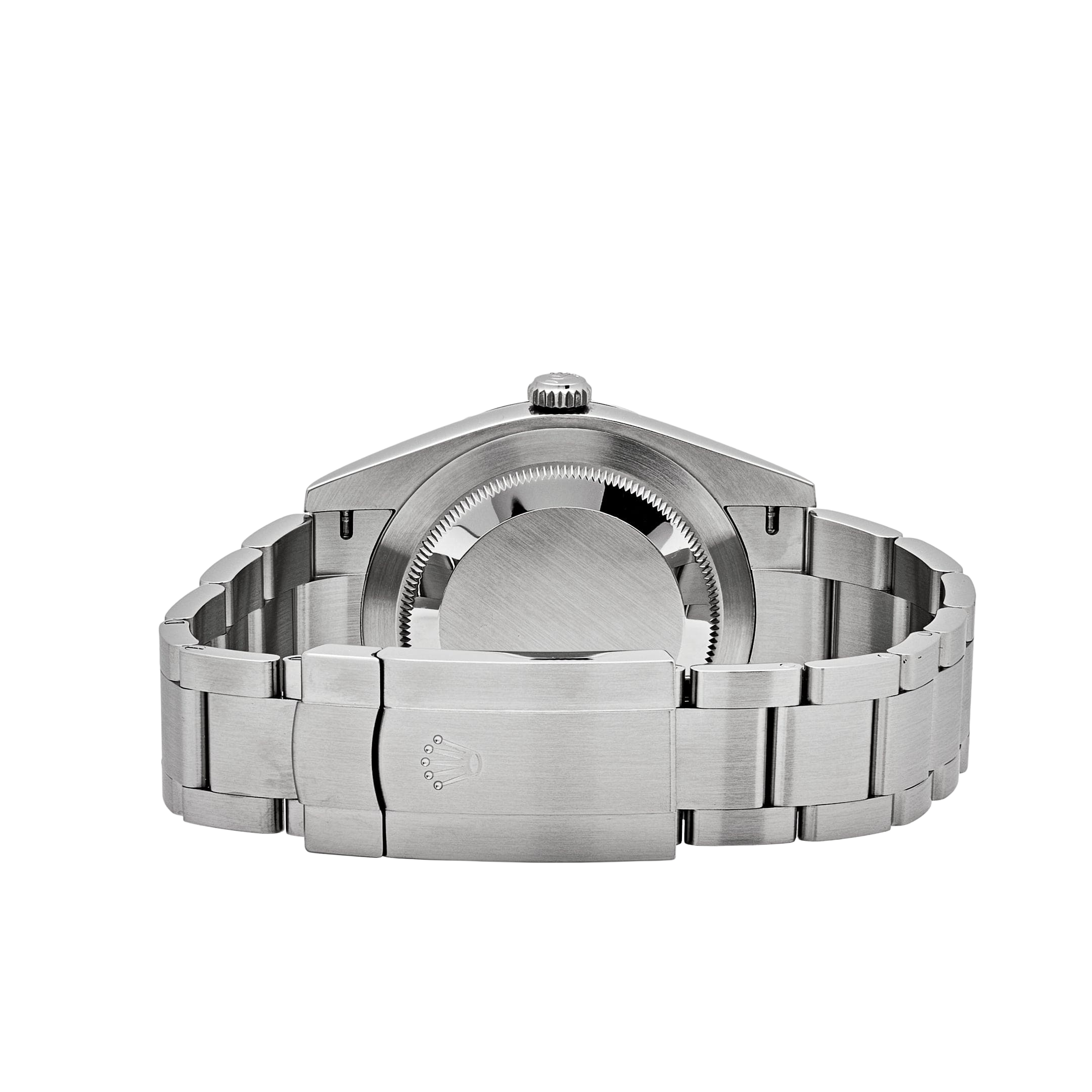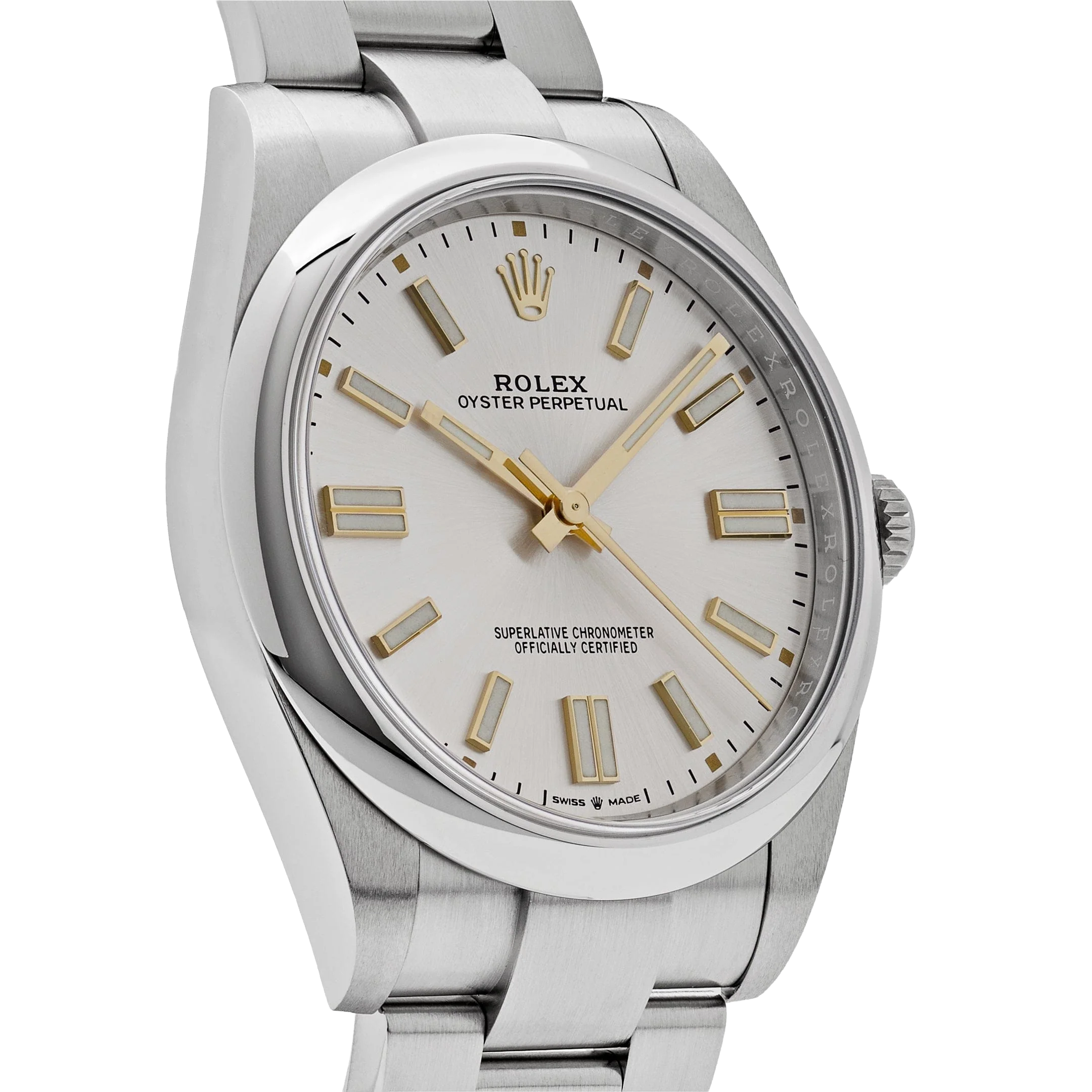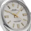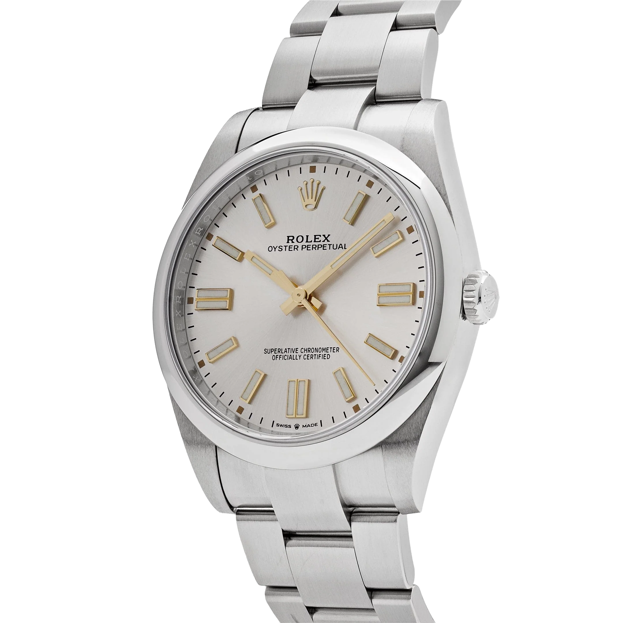 The silver sunburst dial offers a minimalist and refined look, with Chromalight-filled baton hour markers and hands ensuring optimal legibility in any lighting. The absence of a date window maintains the dial’s symmetry, staying true to the Oyster Perpetual’s pure design philosophy.
